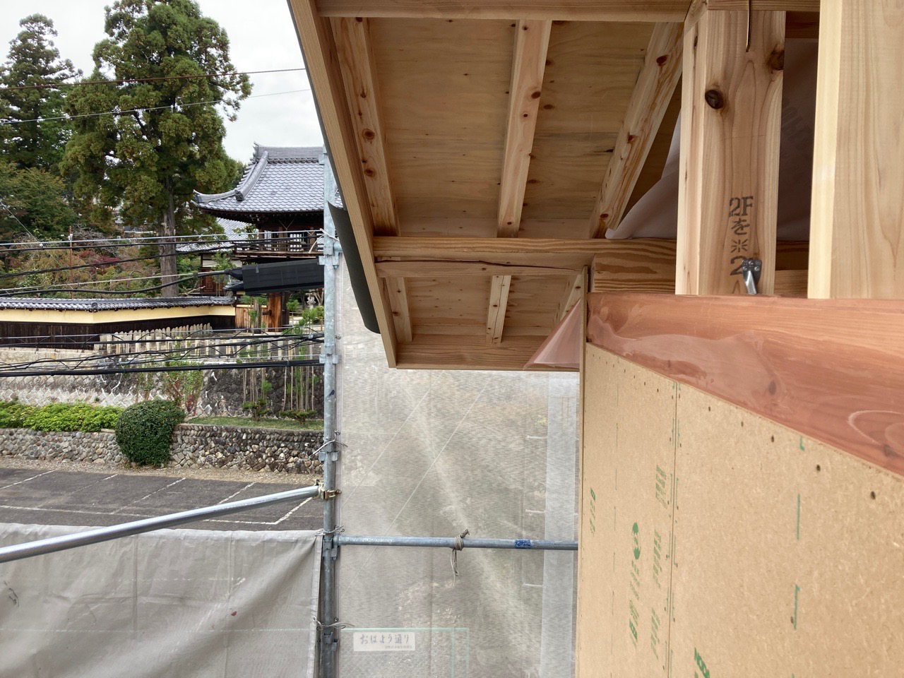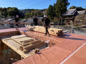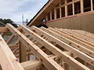 1日目は大屋根の垂木取付けまで進み、2日目も屋根ルーフィングまで予定通り終えることができました。