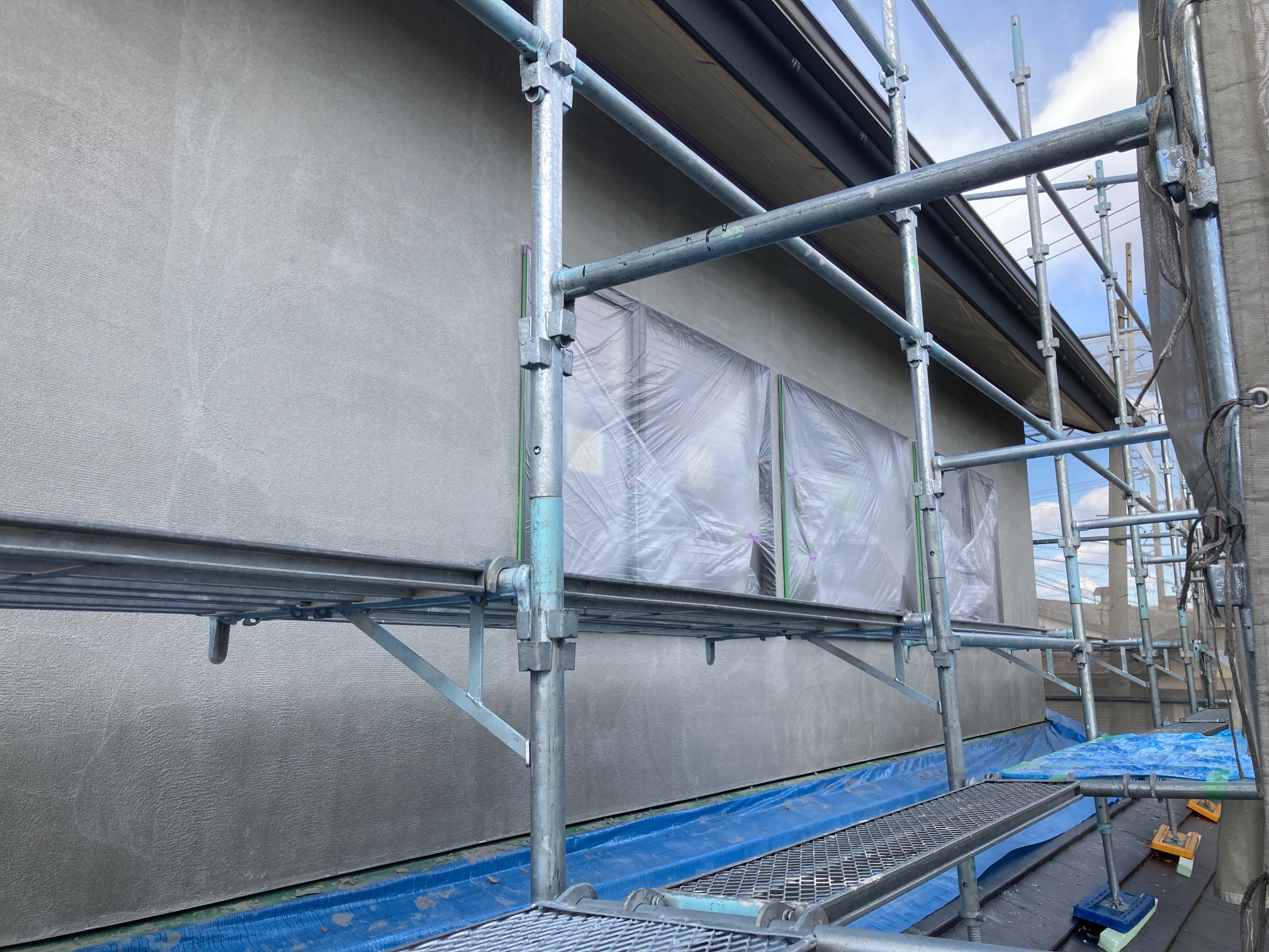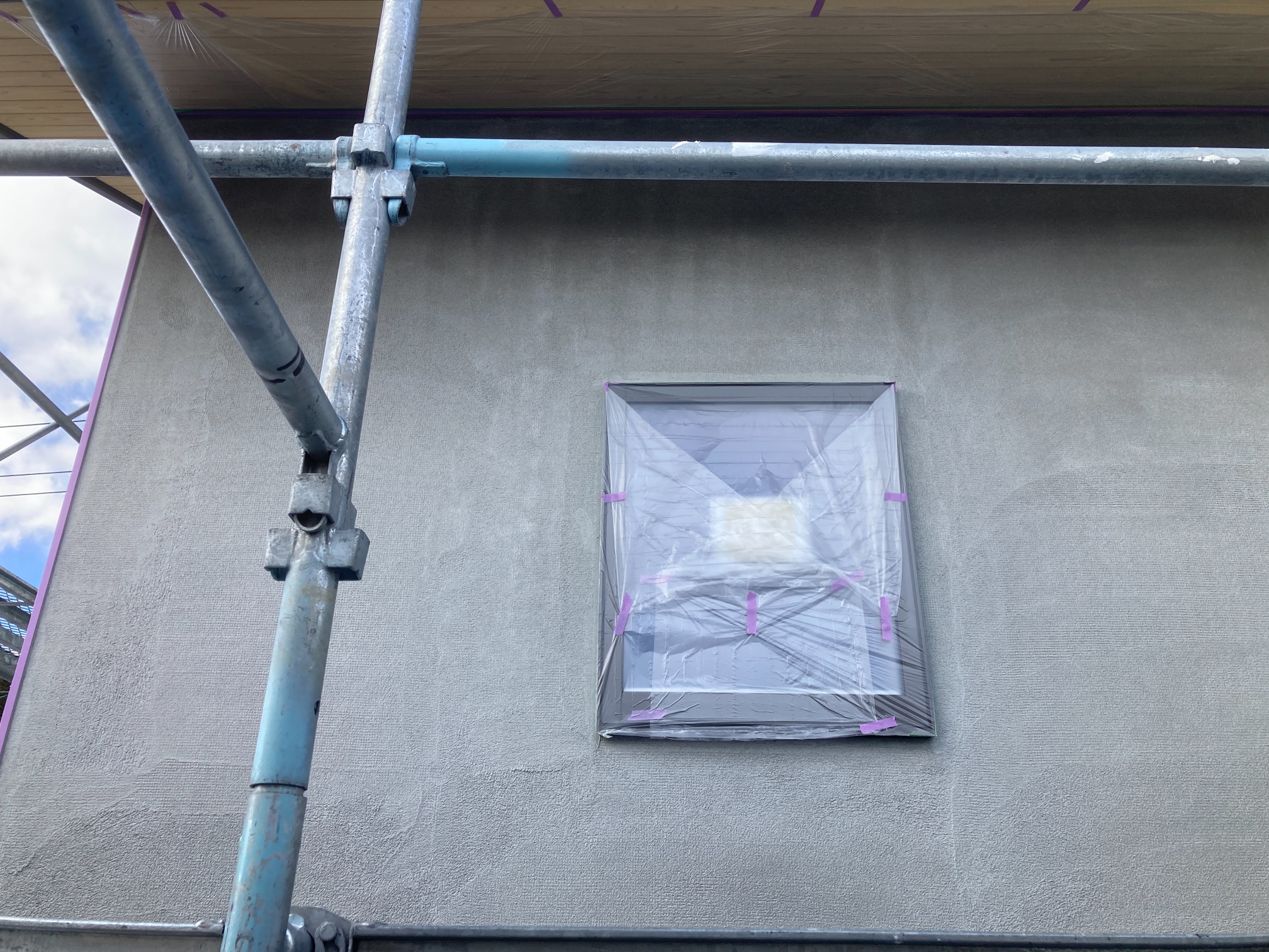 外壁は左官工事に入りました。東・南面にモルタル下地が施されこの上から漆喰で仕上げていきます。