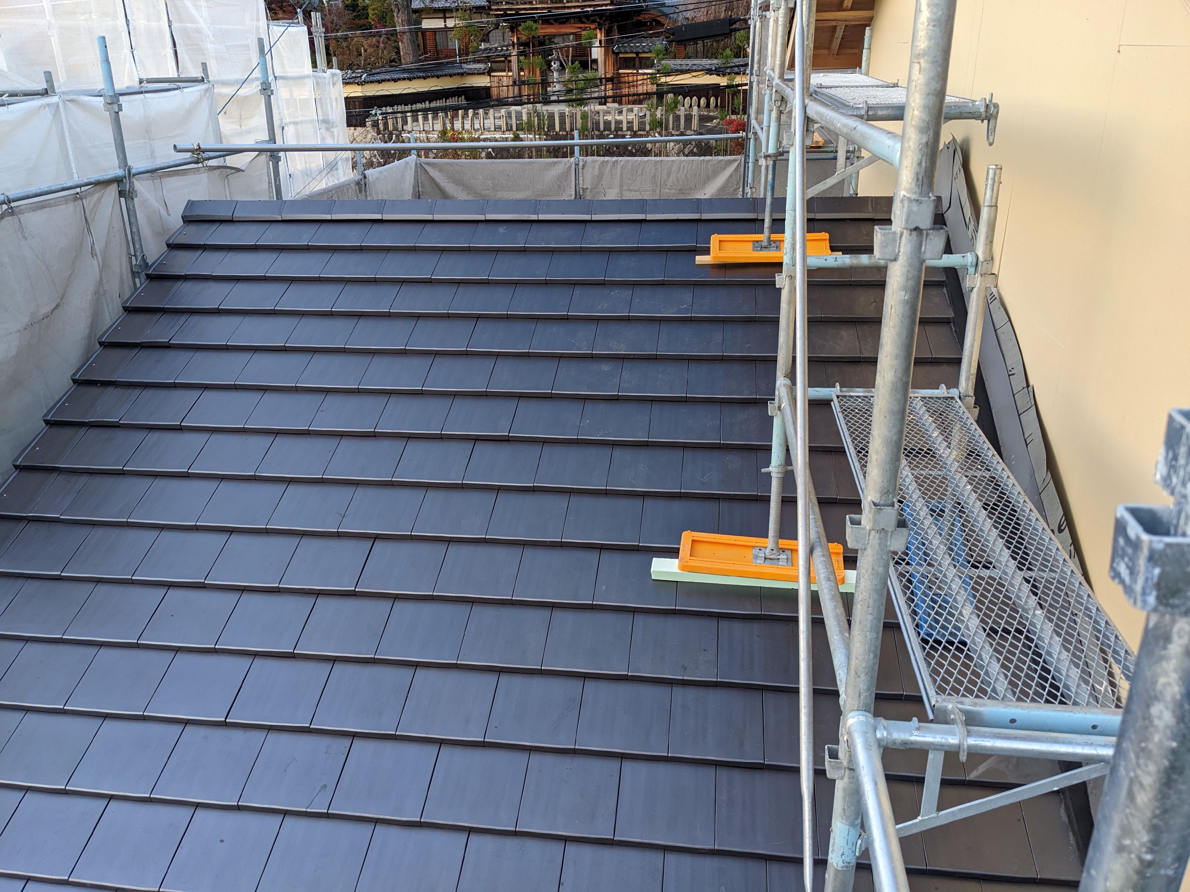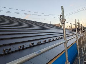 屋根葺き工事が完了しました。直線が美しくすっきりした一体袖のセラムFフラットです。