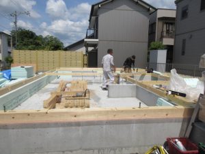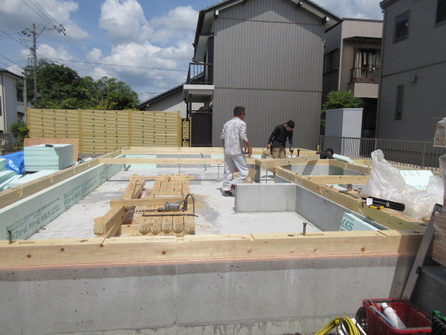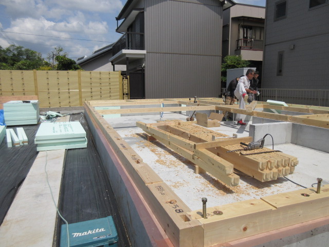 一昨日、暑~い中、19日の上棟に向けて、土台伏せを行いました。中央のニッカポッカを履いているのが、s戸棟梁です。見た目は強面ですが、(今は)とてもやさしい棟梁です。k様よろしくお願いいたします(笑)