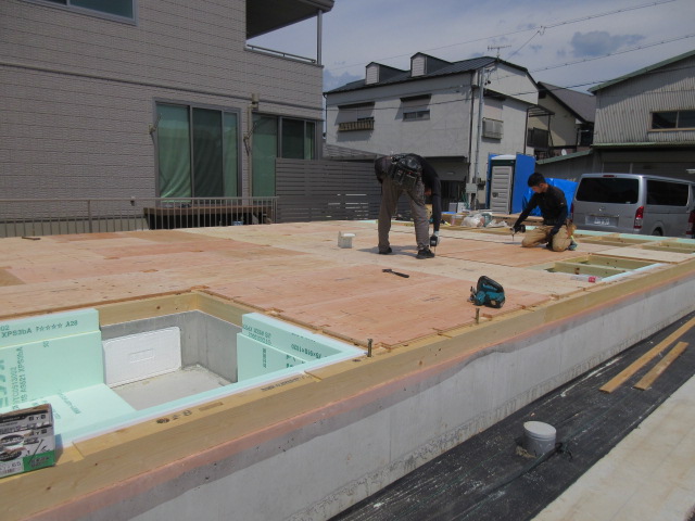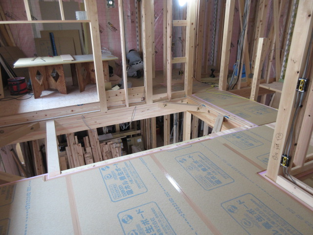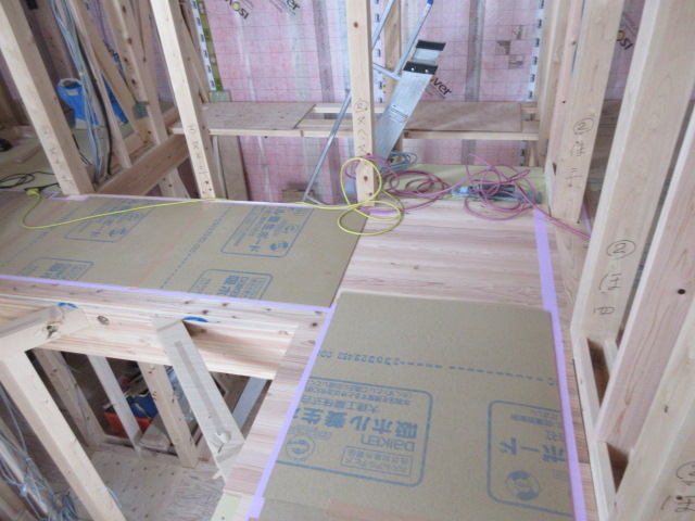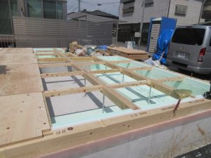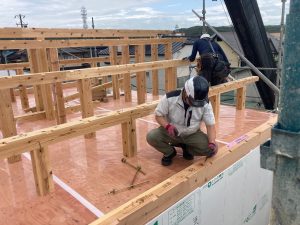 k様はご主人が断熱気密にこだわりがあり、今回は気密の施工を見学したいとのご要望があります。2階と小屋裏との気密は、この建て方の時点でシートを張ってしまうので、ご主人には見学していただけない部分になります。このような感じで、2階の梁の上に敷き詰めた剛床の上に気密シートを張っています。