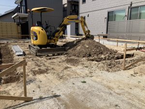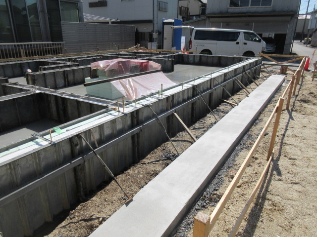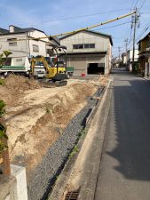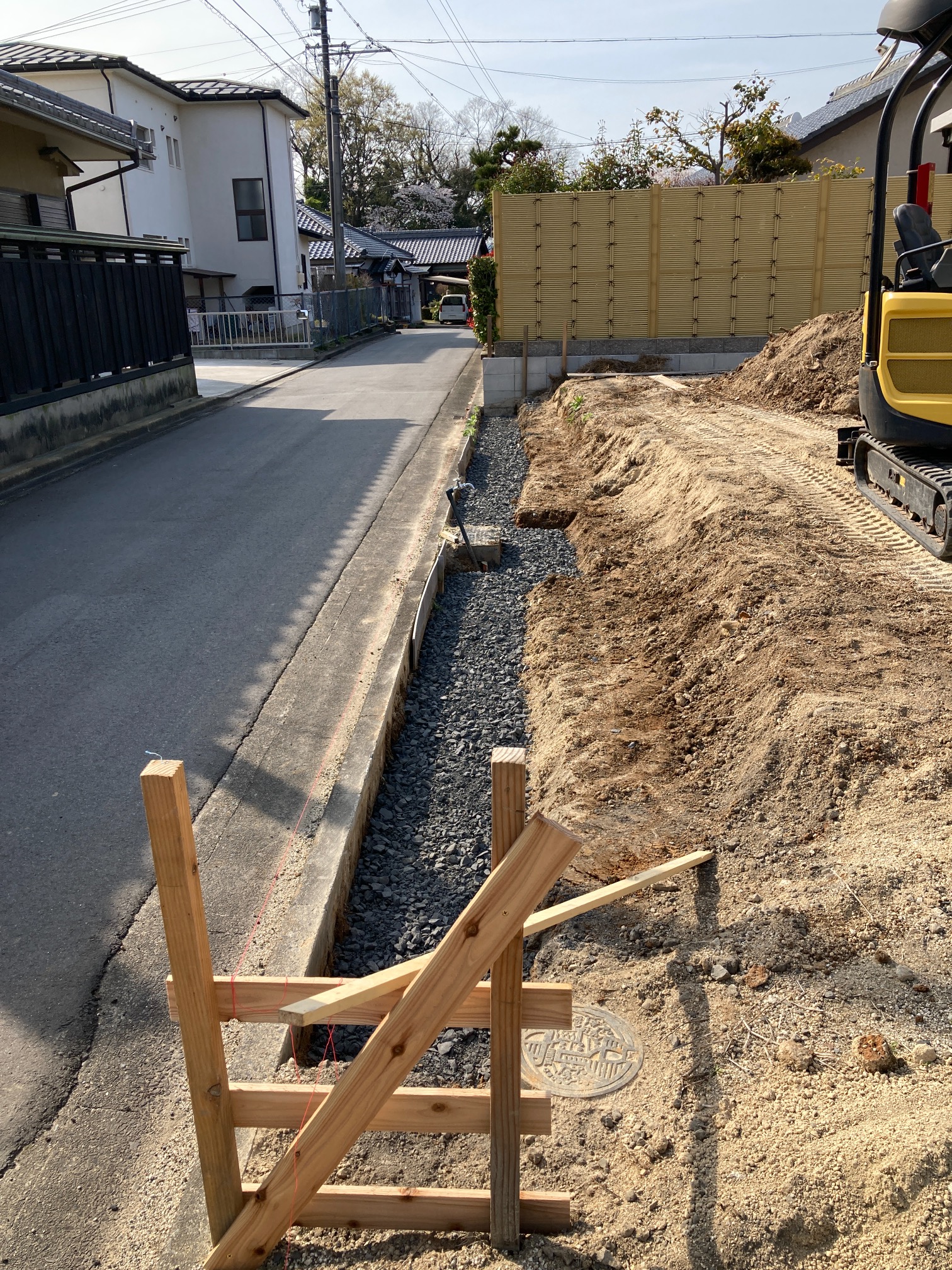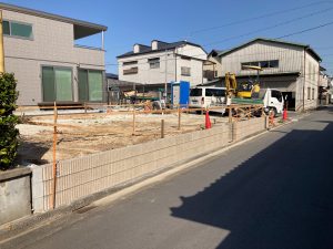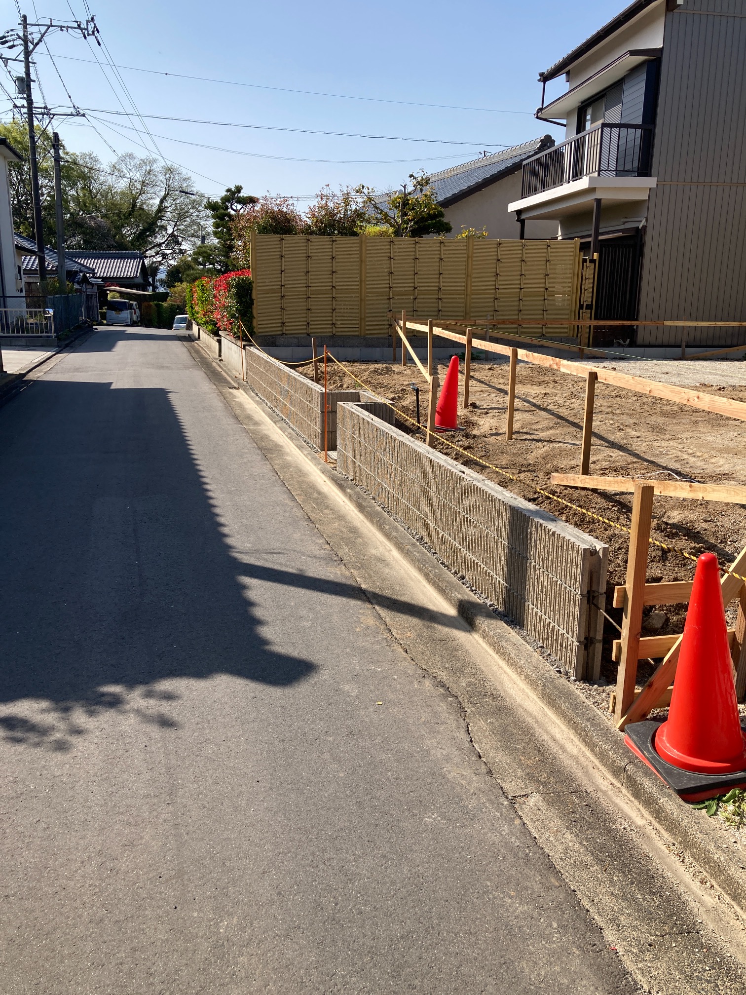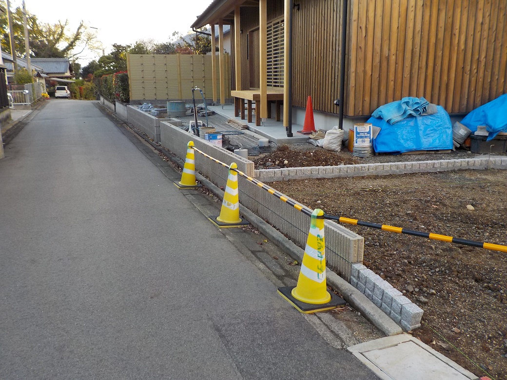 新築工事に先駆けて、外構工事が始まりました。外構工事は、建物が建ってから本格的な工事を行いますが、建物が建ってしまってからだと、工事が難儀な部分は先に行う事があります。今回は、道路との高低差があり、その道路が狭いことから、道路側のコンクリートブロック積みを先に行っています。