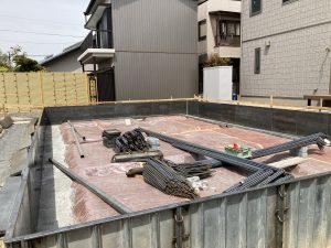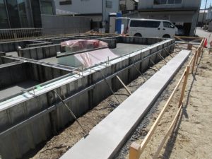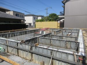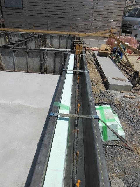 打設前、立ち上がり部分に75 ㎜の押出法ポリエチレンフォームを設置しています。