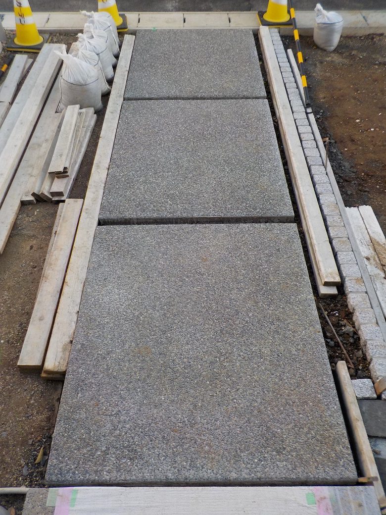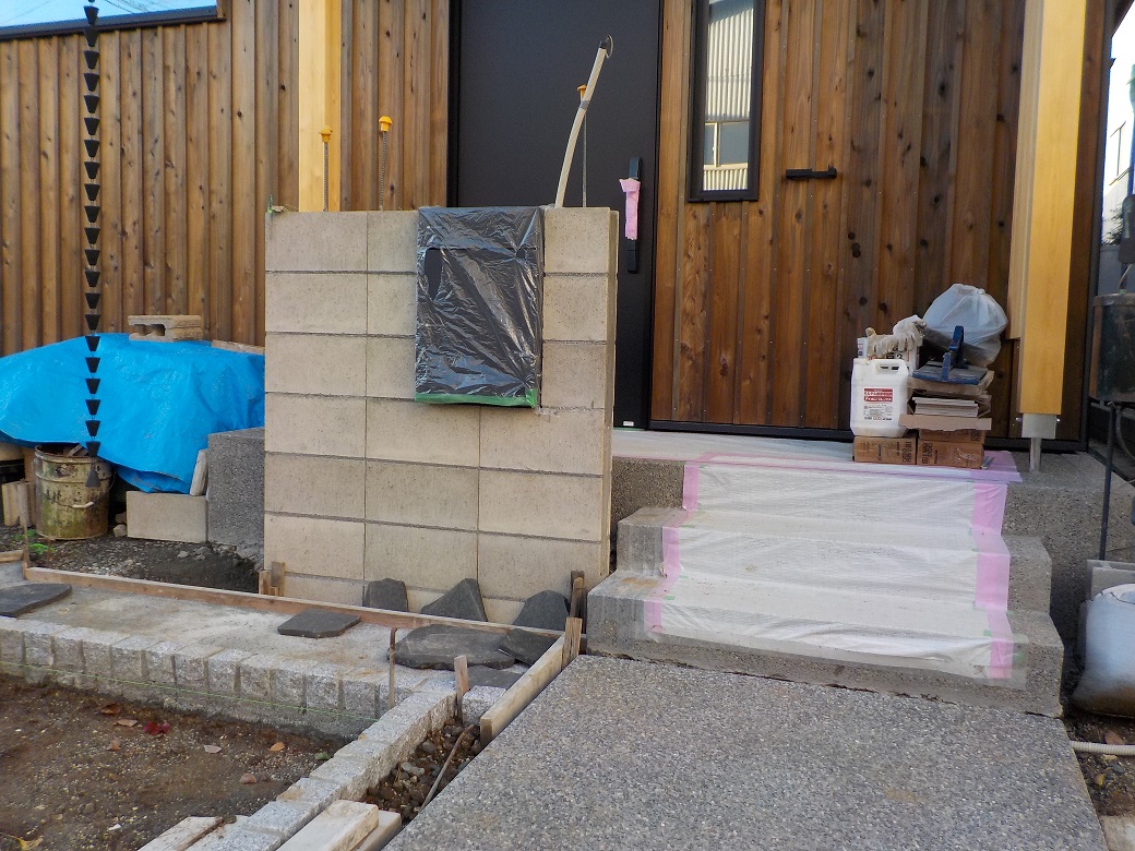昨日の様子です。あいにくの雨で、現場は少しストップしています。アプローチ部分の洗い出しは完了し、ピンコロ(四角くカットされた石)も並べられました。門塀のブロックを積んでいる途中です。大きな空間には、宅配BOXが設置されます。時間指定でお願いもできますが、これから人手不足になってくると時間指定も宅配業者さんの負担になりそうですもんね。宅配BOXやっぱり必要かもって最近思います。