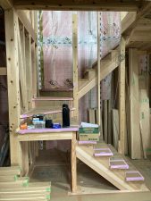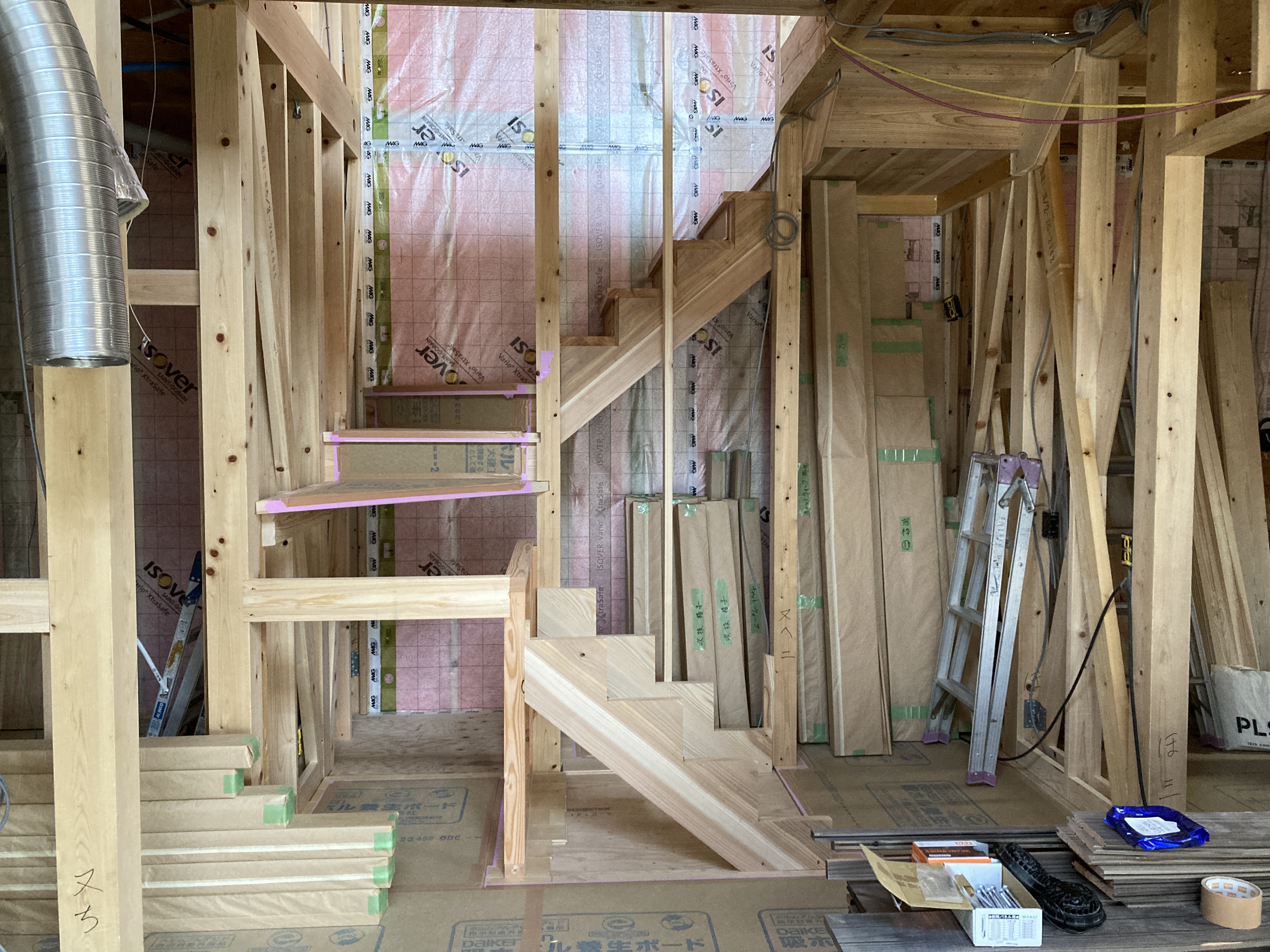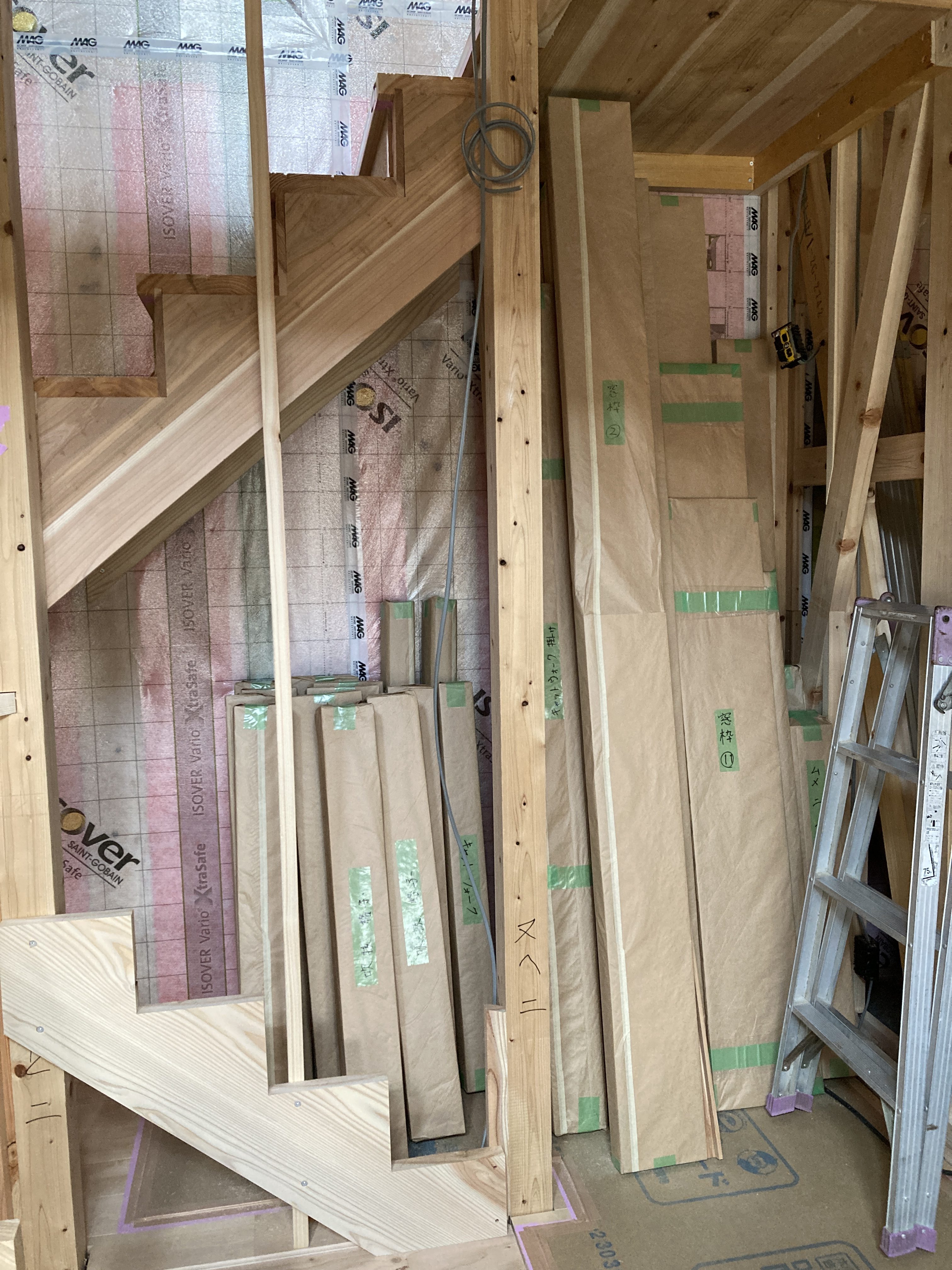 内部は階段が出来上がりつつあります。s戸棟梁が工場で加工した材料達も運ばれてきています。