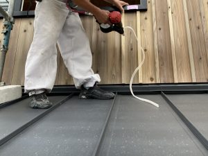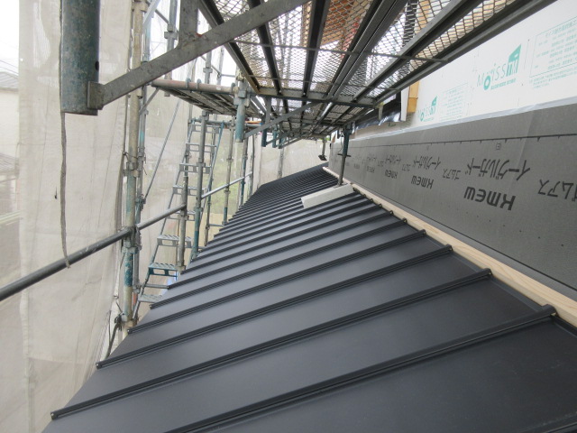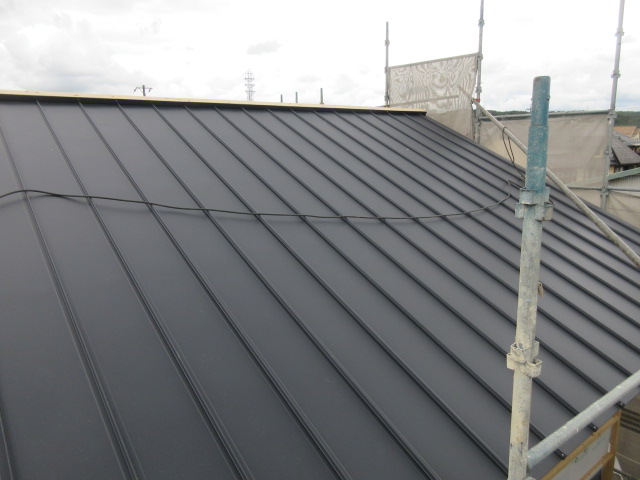 屋根工事が完了しました。今回はガルバリウム鋼板縦ハゼ葺きです。重量が軽いので、耐力壁は瓦屋根と比べて少なく済み、太陽光パネルが載せやすいのが特徴です。