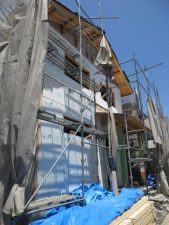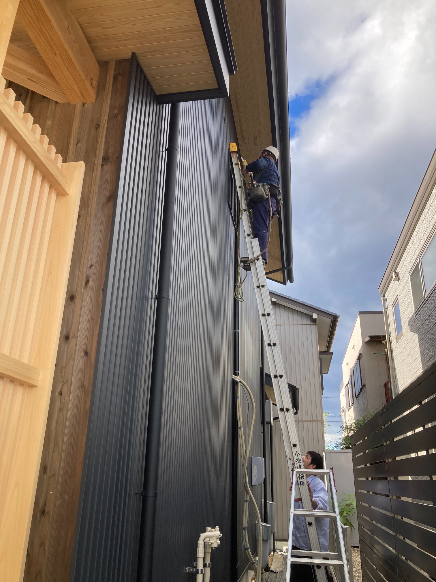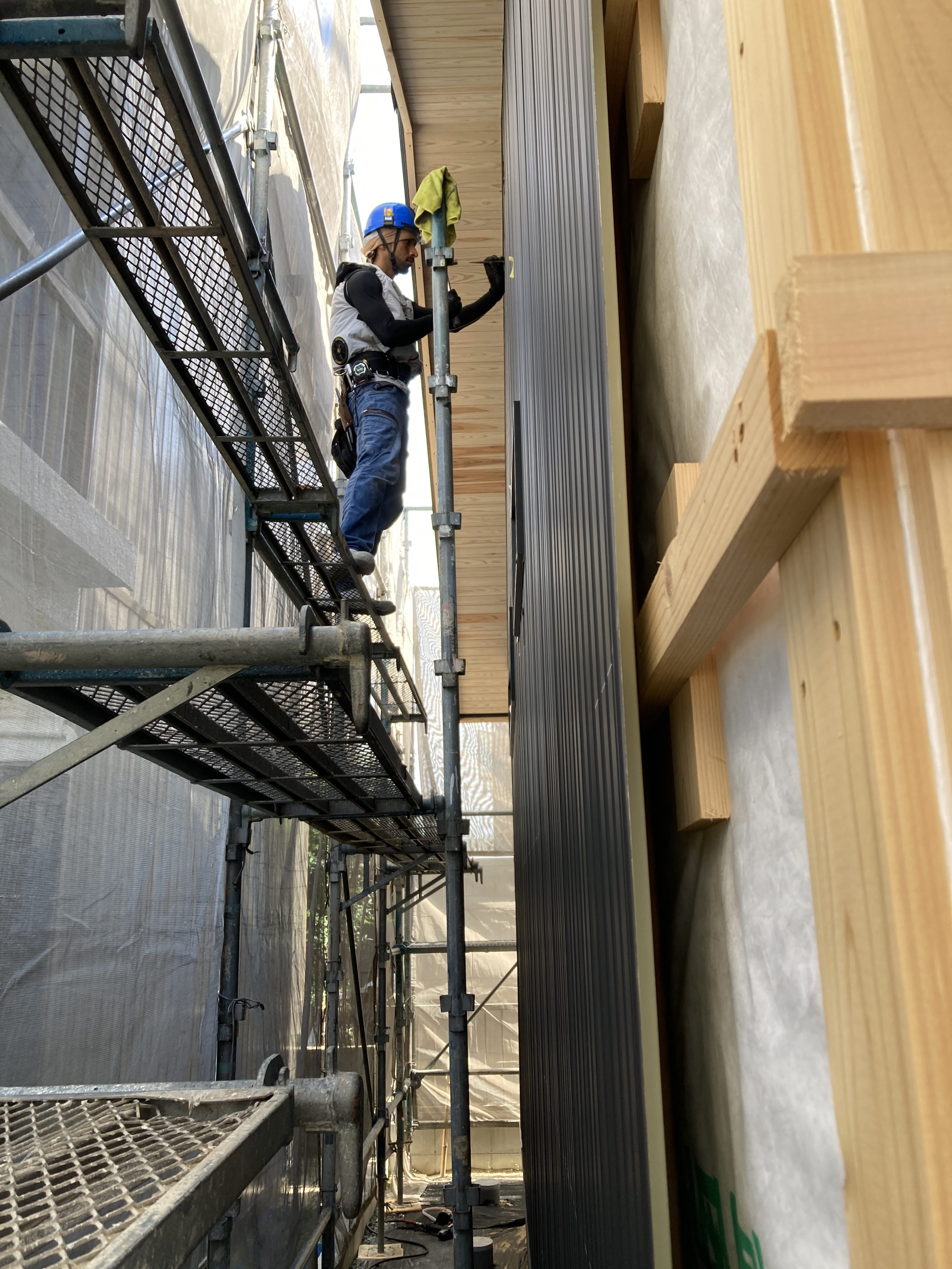 k様と外構工事の打ち合わせを現地で行いました。今日はg板金さんが外壁のガルバリウム鋼板を張りに来ています。