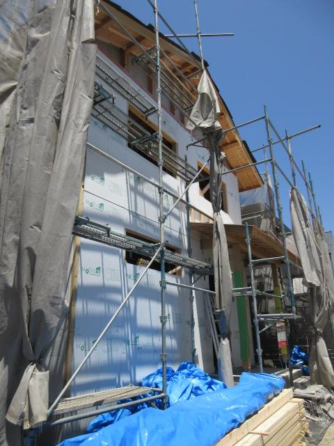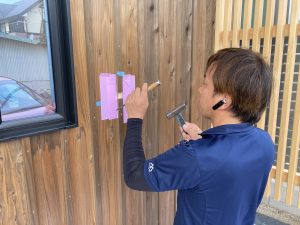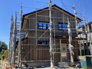南西、南東側は、杉板を張っています。ウッドロングエコという塗料を施し、s戸棟梁が張り進めています。