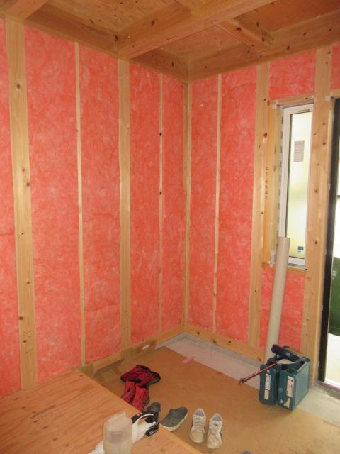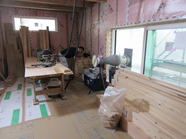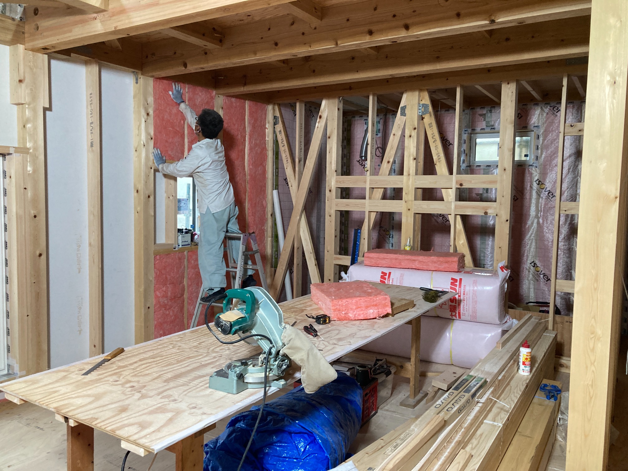 12日の様子です。s戸棟梁、2階の充填断熱材入れと気密シート張りは終え、1階の充填断熱材を入れています。