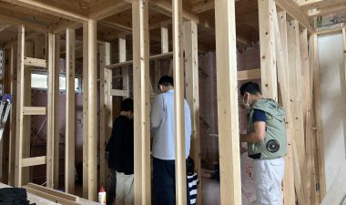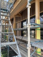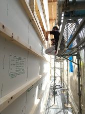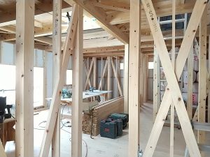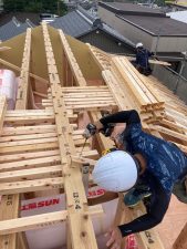 重た~い耐力面材も、若手大工さんが来る建て方に取り付けられるので、ほとんど完成したような見栄えになります👍
