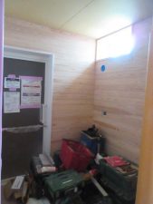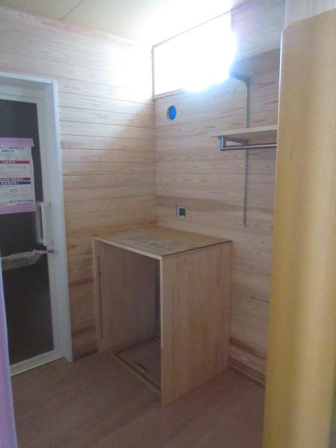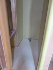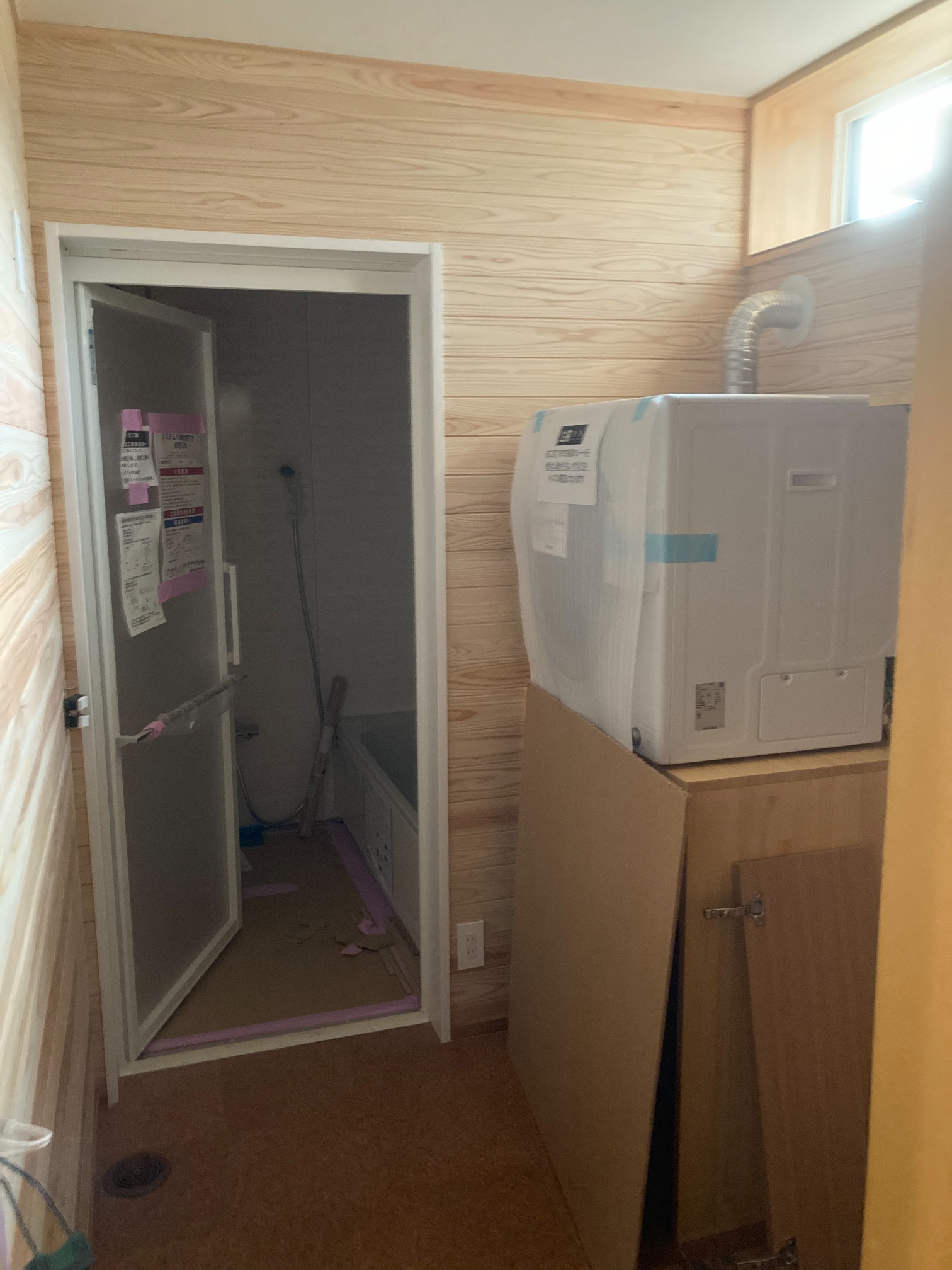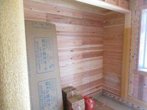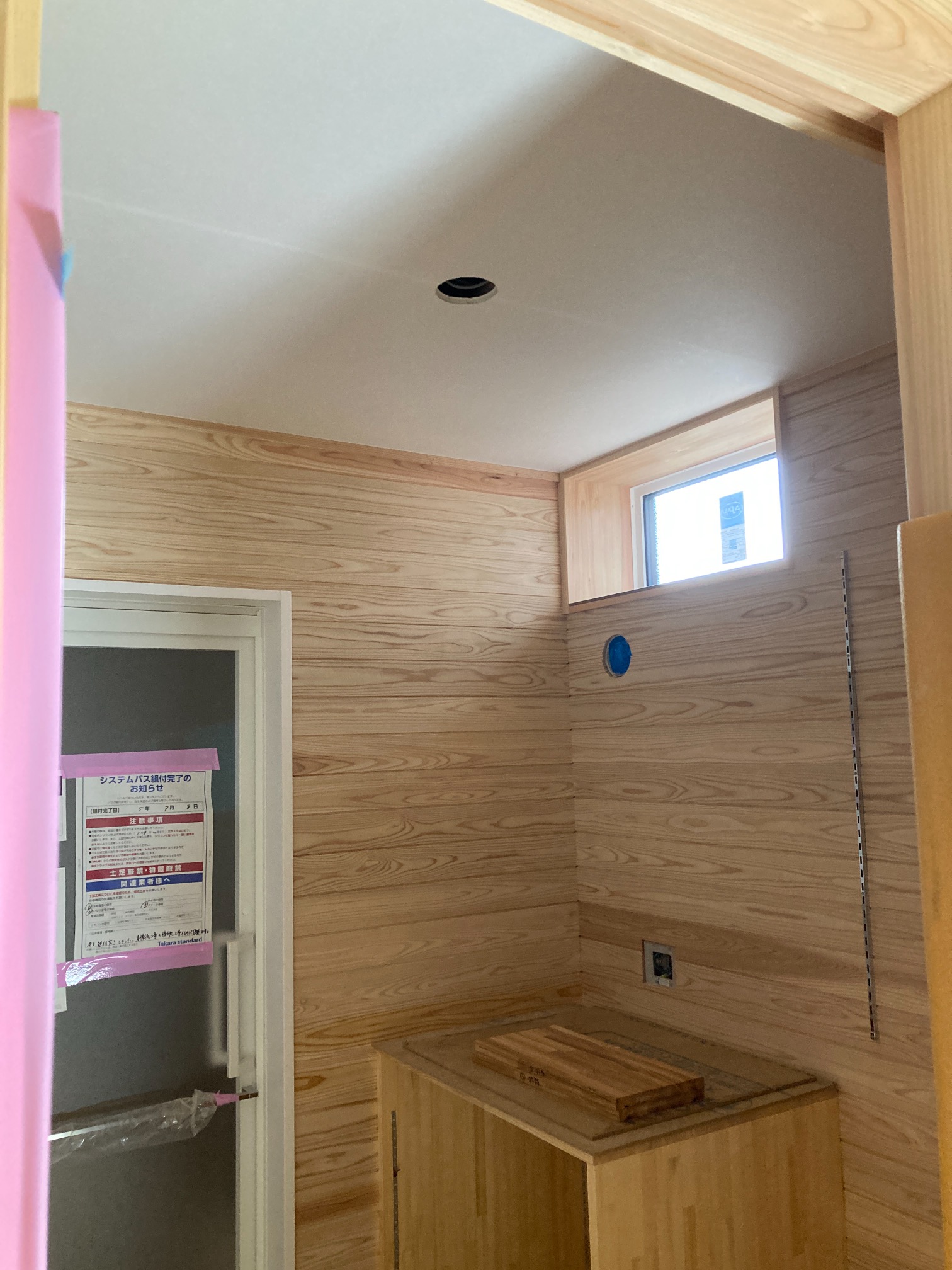 収納部分の杉相ジャクリ板や、脱衣室の杉羽目板が張られました。収納内部は、換気が上手く行き渡らない事が多く湿気がこもりやすい為、調湿効果のある杉板をお勧めしています。また、施主様があとから好きなところにフック等を取り付けていただきやすいです。収納に杉の板なんて贅沢~なんて思われる方も多いですが、安価な木材なので、クロス張り仕上げとほとんど変わらないお値段で行えます。(大工さん達は安価な材料に手を焼いているようですが💦)