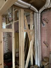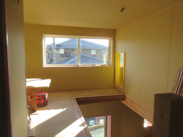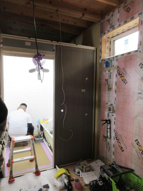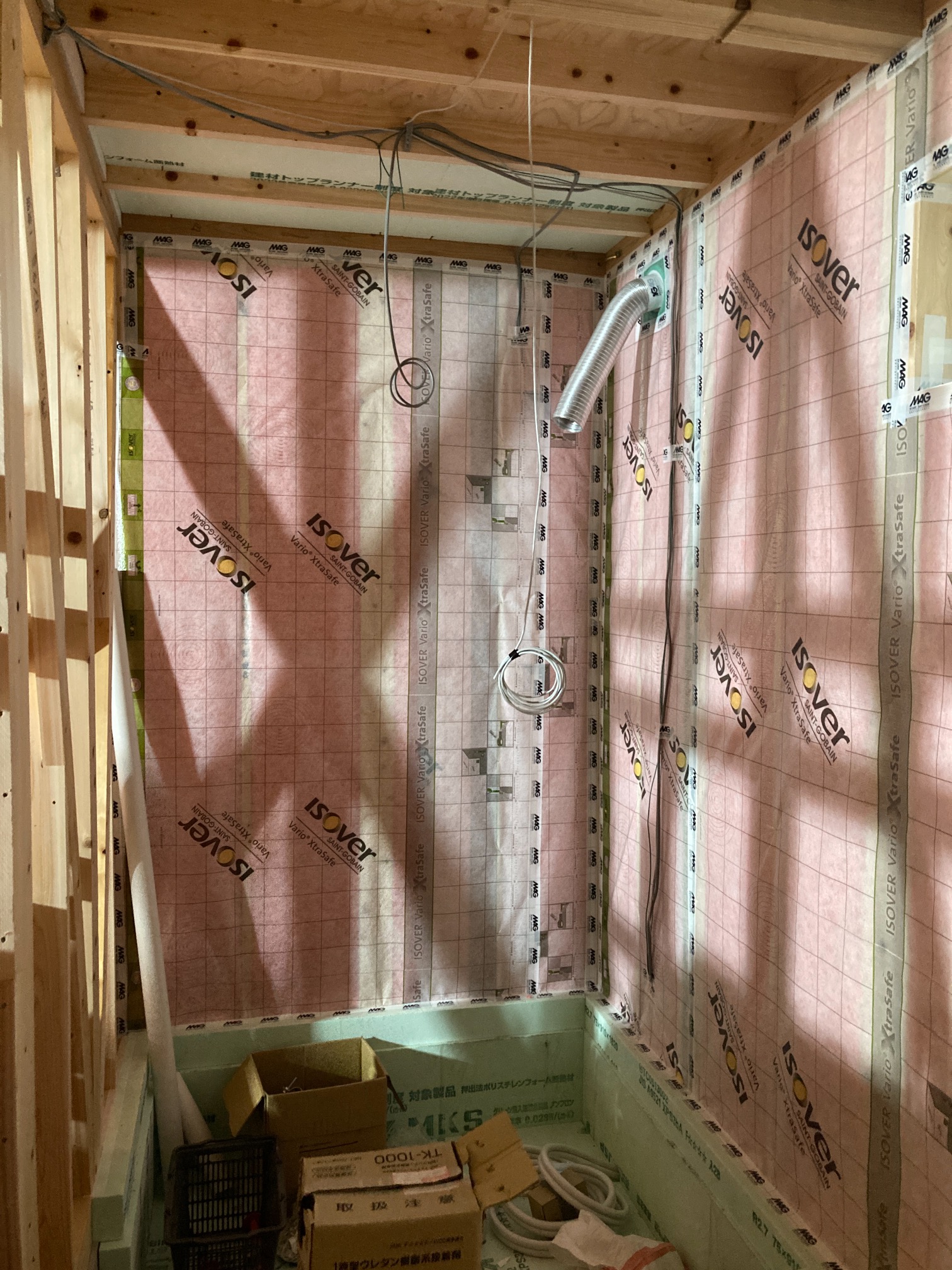 19日にユニットバスが設置されました。ユニットバス部分に窓が無いので、照明を点けて施工しています。お風呂はどんなにいい性能の窓を取り付けても、湿度が高いので結露するため、お掃除面や断熱性能にこだわられると、窓は付けない方も最近多いです。
