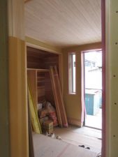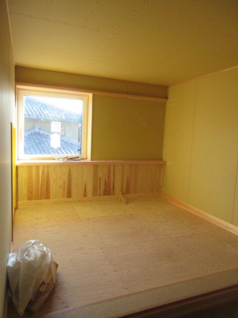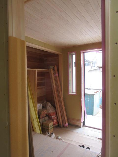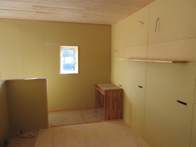 小上がりタタミの寝室。1階の天井や軒裏で余った板を、腰板に使用しました。腰板の上は、内障子がはまる予定です。明日は、午前に外構打合せの続き、お昼一番に建具、そのあとダイニングに取りつけるスイング型の照明ブラケットを家具屋さんと打合せする予定です。お昼は、k様と最近見つけたお勧めのうどん屋さんにでも行こうかなぁ~