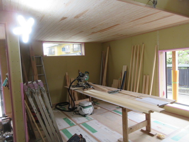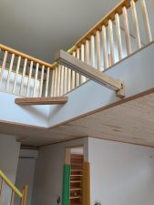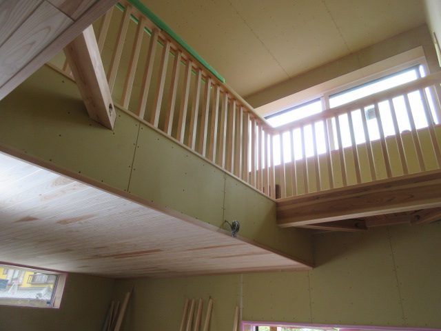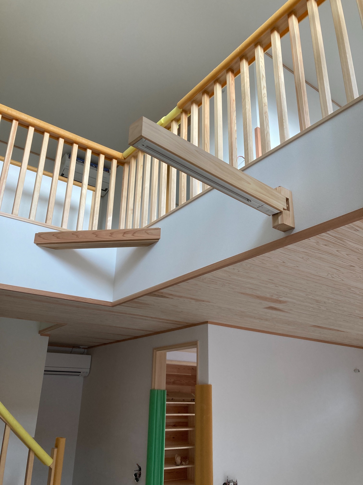 s戸棟梁の造作工事が完成間近です。玄関やLDKの天井羽目板を貼り終えています。吹抜けの手すりも取り付けられました。