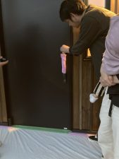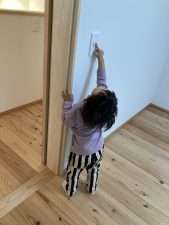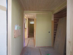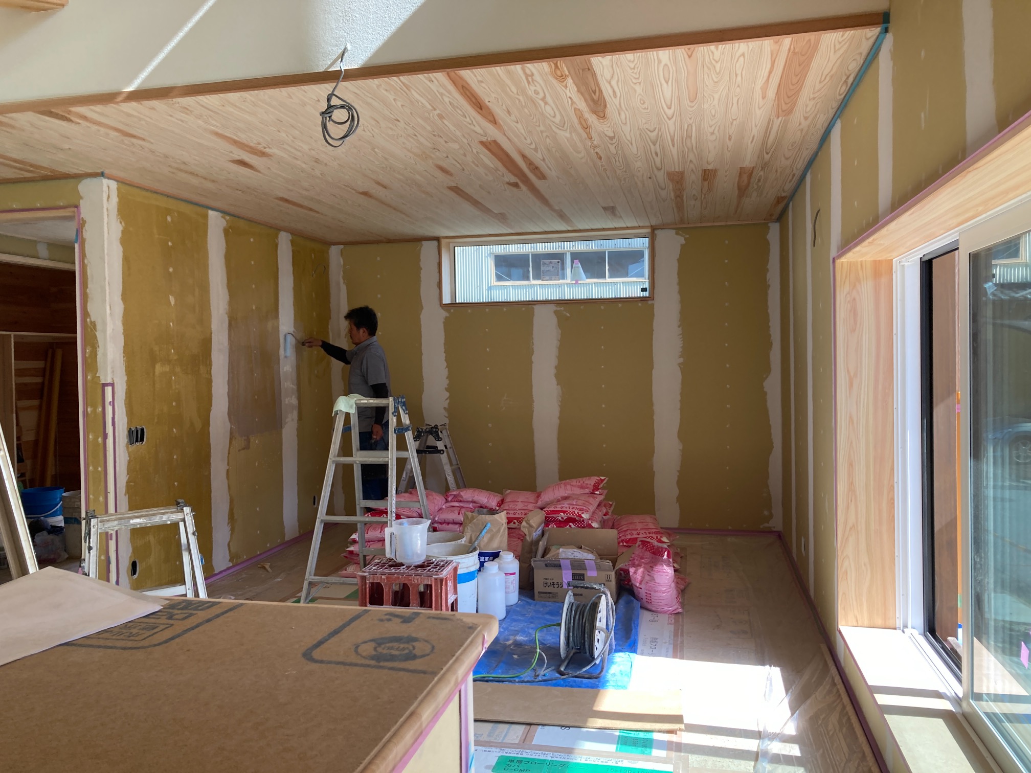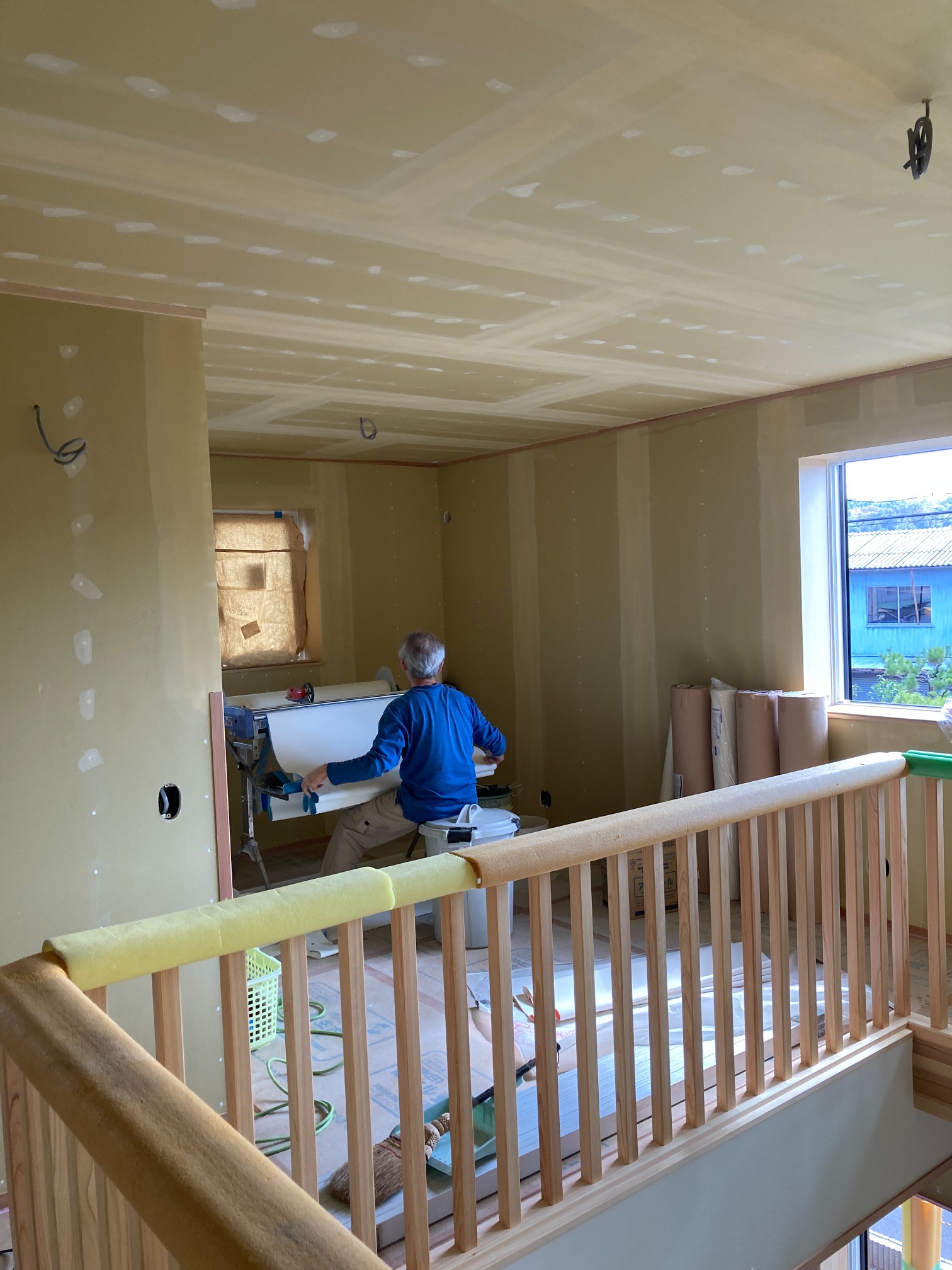 クロス屋さんと左官屋さんが入っています。2階はパテ処理が終わり、クロスを貼り始めています。大きな機械でクロスに糊を付けている様子です。左官屋さんも1階のプラスターボードのジョイントの処理を終えて、シーラー(糊の様なもの)を塗っています。珪藻土のつきが良くなります。