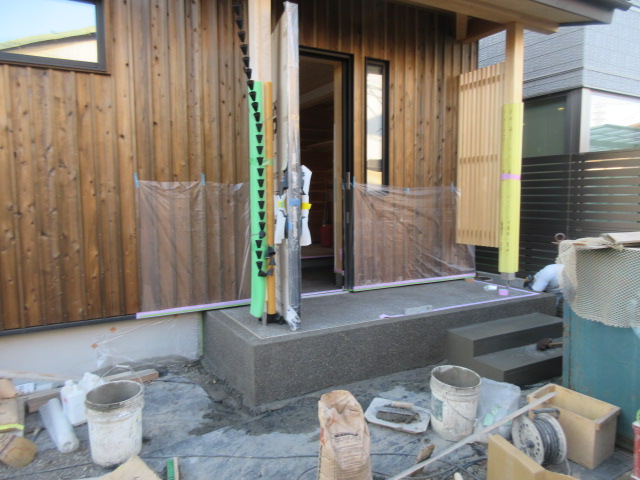 玄関とポーチの洗い出しを施工しました。今回は、「階段の蹴上部分、巾木部分も洗い出しにしたい!」と言う奥様のご希望で、まるっと洗い出しになっています。なかなか施工の難しい部分になりますが、y江業務店さんがきれいに施工してくださいました。