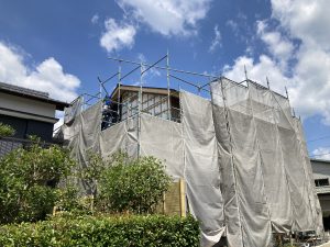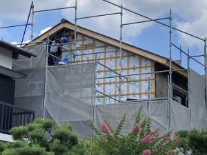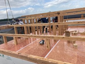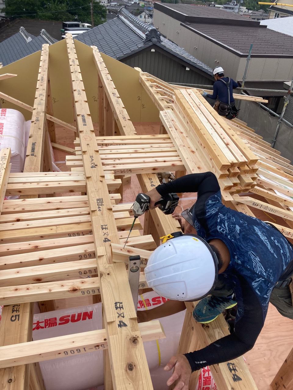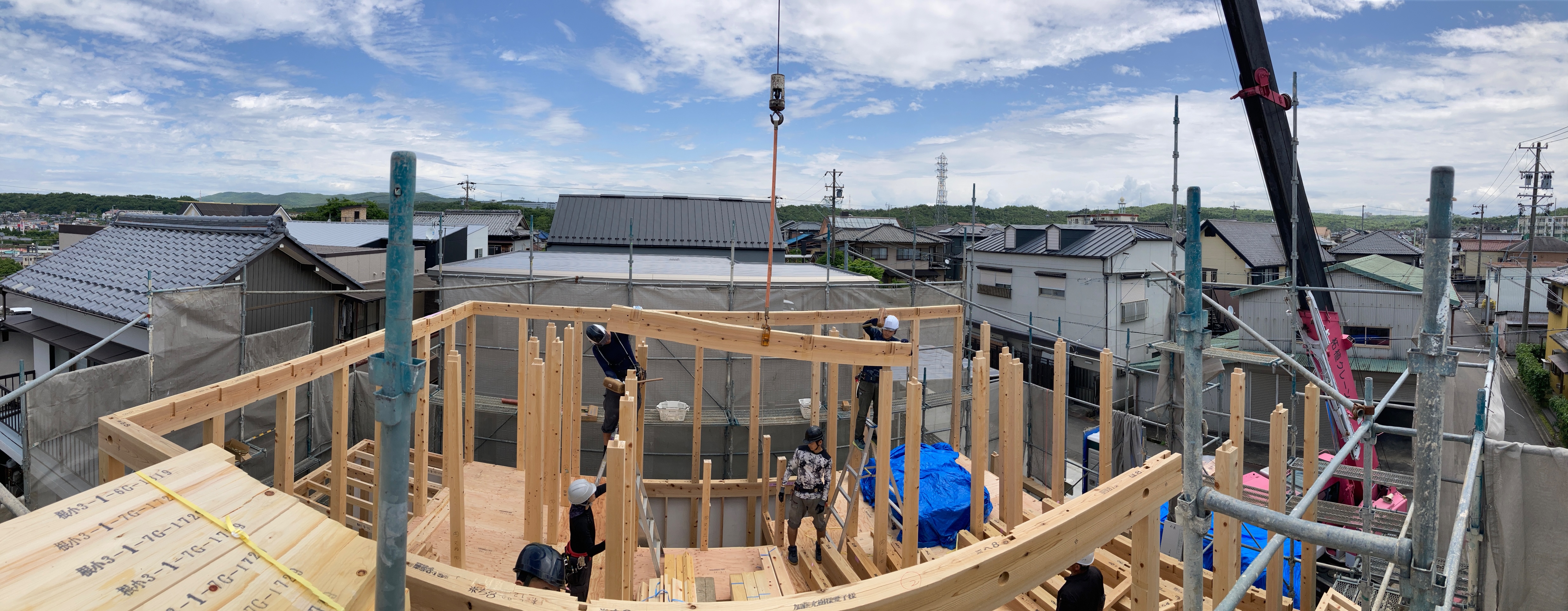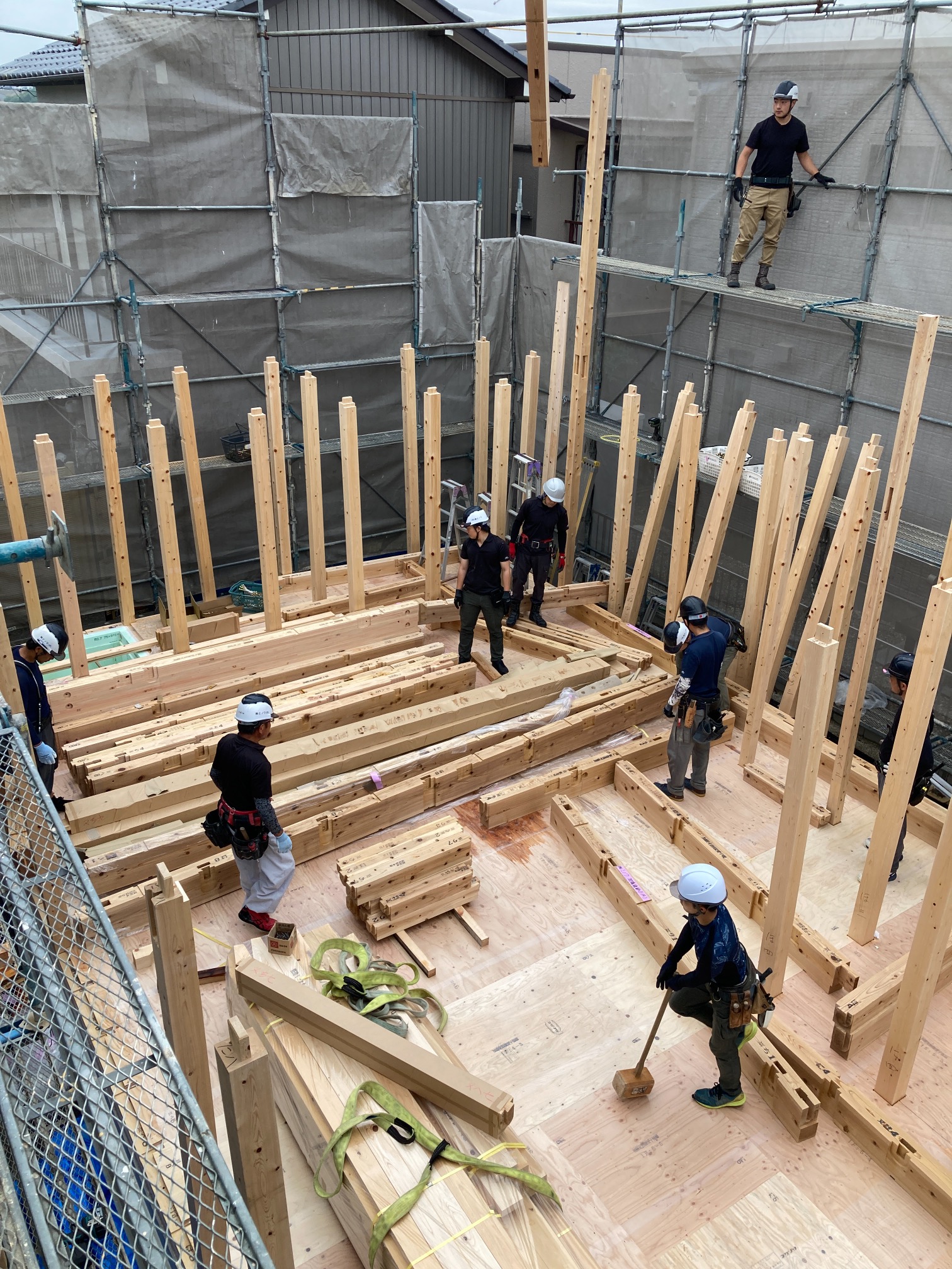 19日の予定を延期して、23日に建て方が行われました。23日もお天気が心配でしたが、多治見市は少し降ったくらい。暑くもなく、丁度良い建て方日和となりました👍