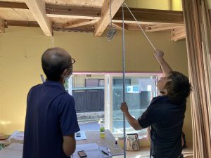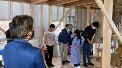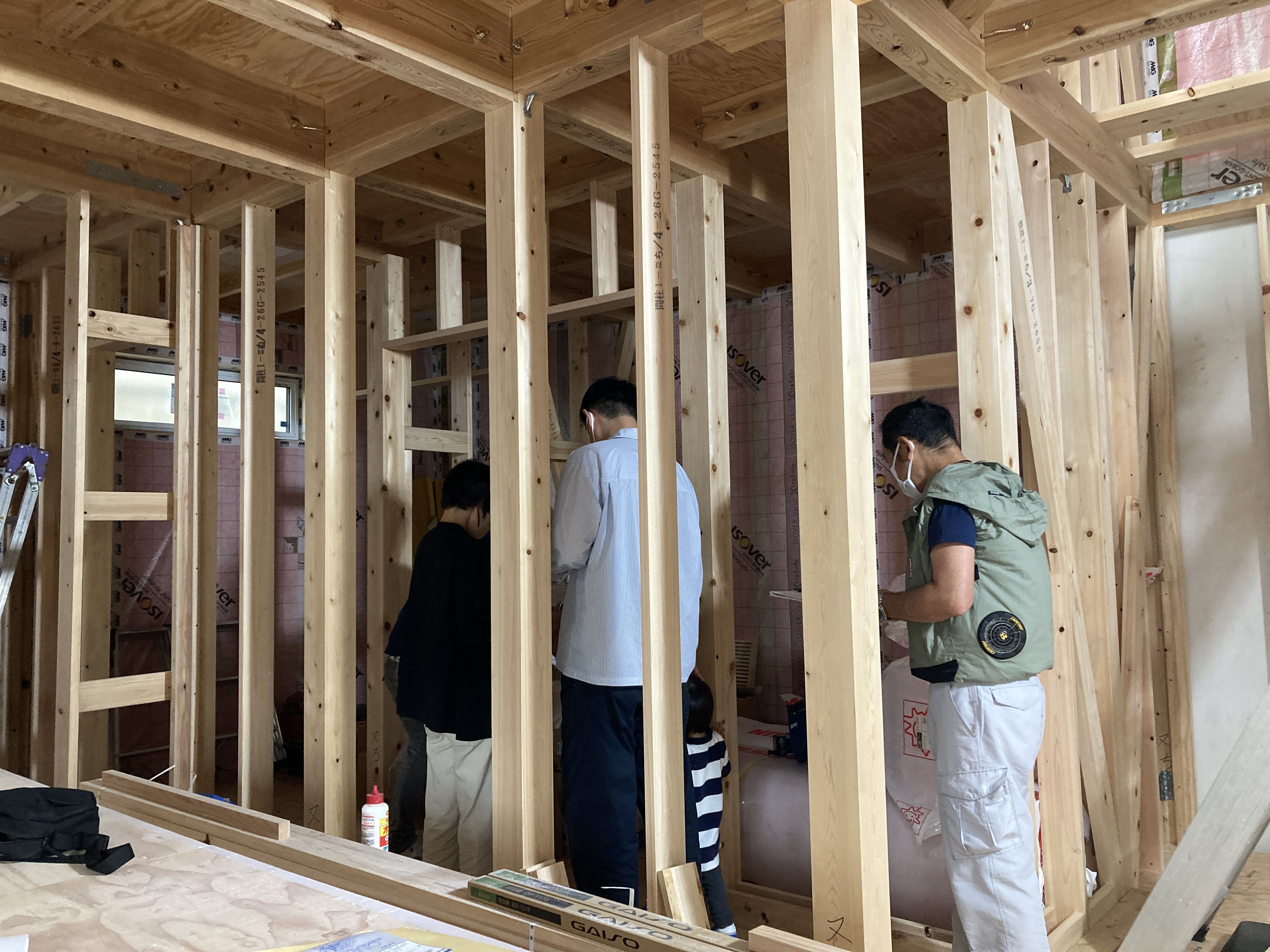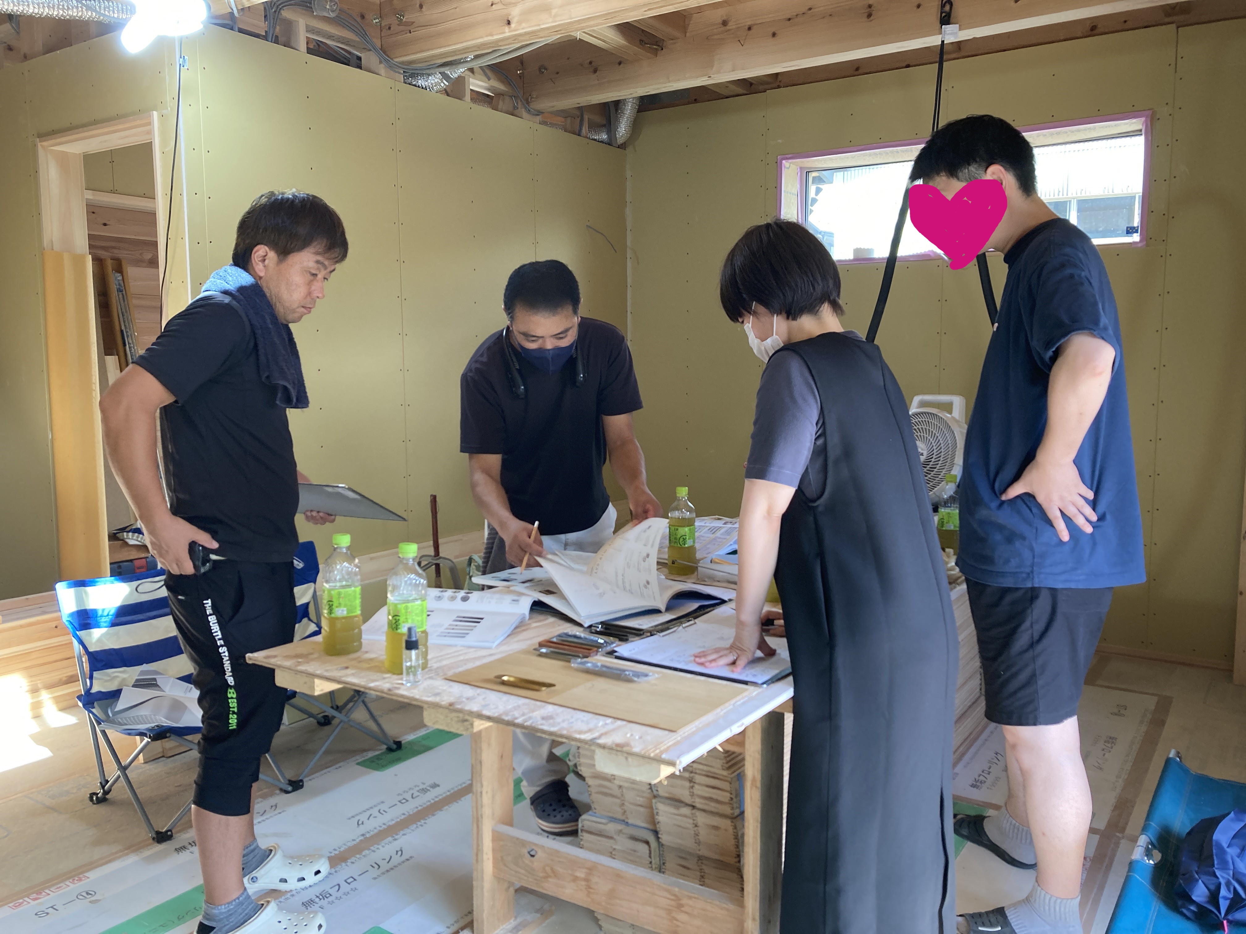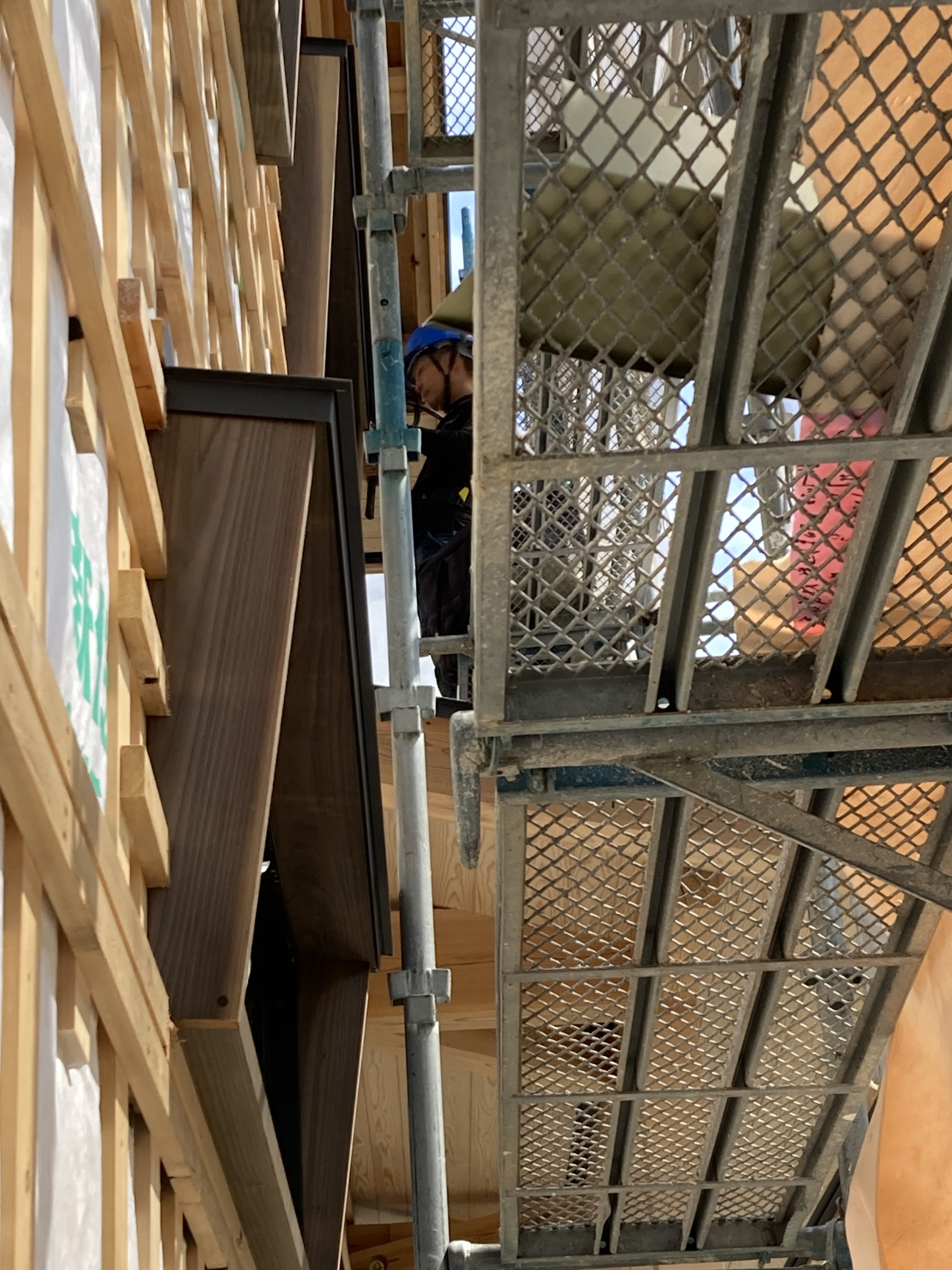 本日は、土岐市の見学会。k様も少しでも家の参考にと、午前中に見学会にお越しになり、帰りに現場に寄っていかれました。a君は、s戸棟梁のニッカポッカに興味があったのか、ズボンを触ってすっかり懐いていたそうです👍内部は金物が取り付けられ、中間検査と瑕疵保険の検査、施主様が相談されているFPさんの中間検査も無事終わっています。