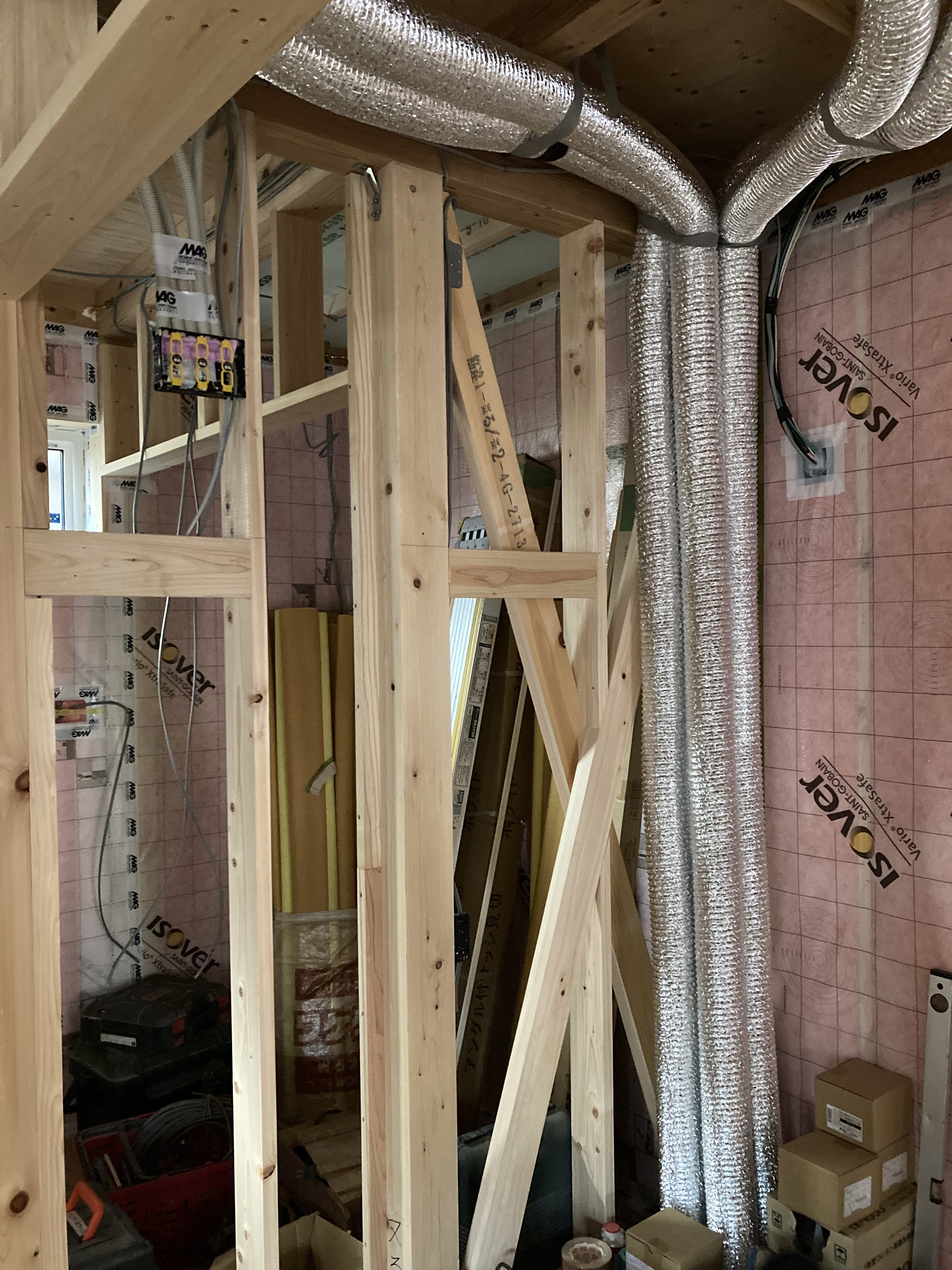 そして、レンジフードは同時給排タイプにされましたので、レンジフードも排気と給気のダクトが必要になります。給気のすぐ横に排気があると、排気した空気が中に入ってきてしまうので、ある程度距離を空けなければいけません。k様のご要望で、給気用のダクトは結露防止のために断熱材が巻かれたタイプを使用しています👍