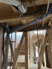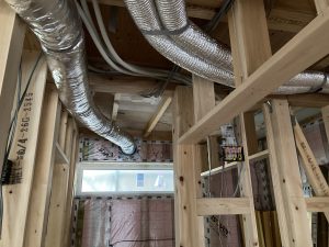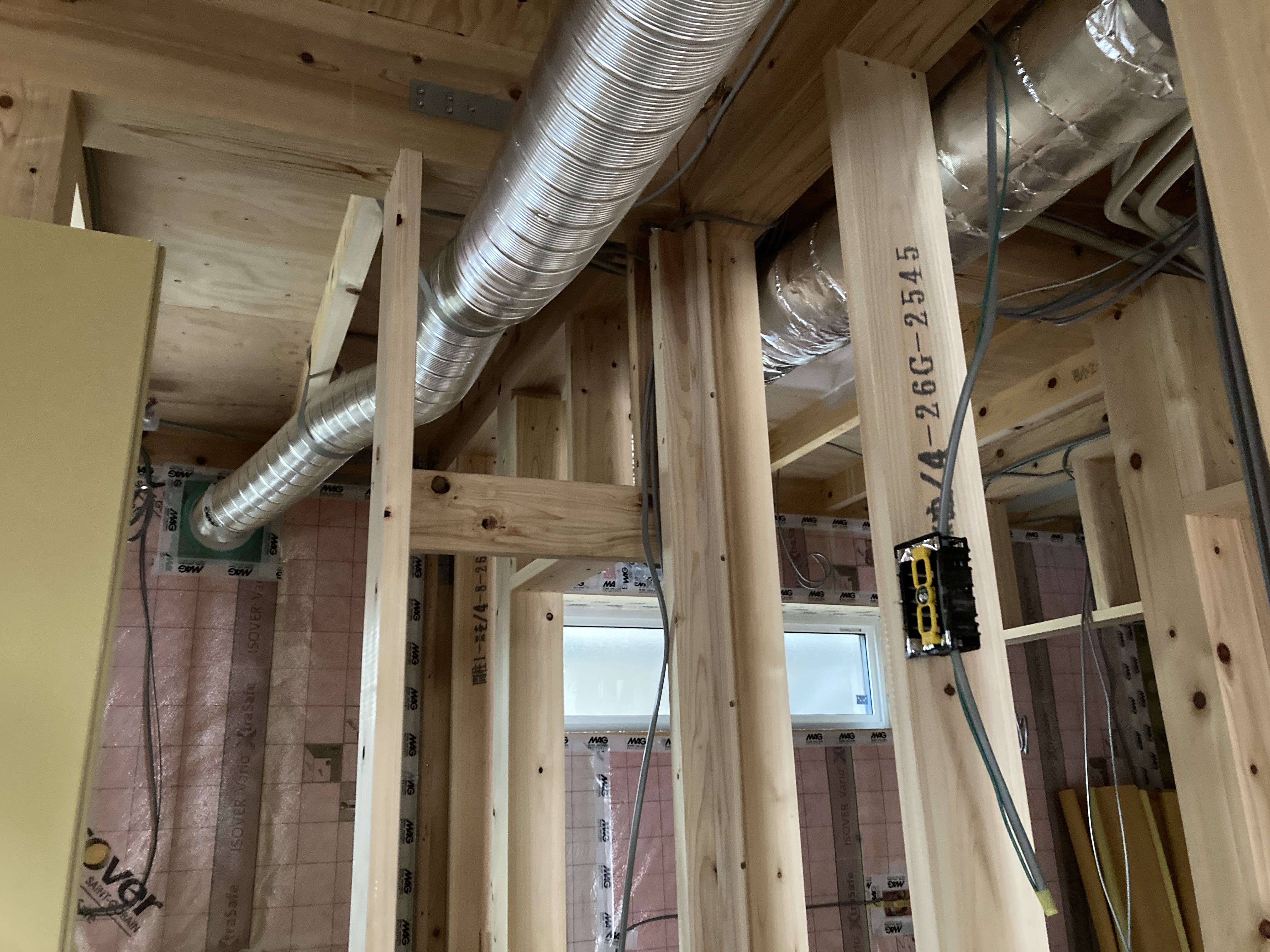 f井電気のh場さんも、先日の電気打合せした内容を基に、配線、ダクト配管工事を進めています。来週施工予定のユニットバス部分は、施工前に行う必要があるので、先に行ておきます。