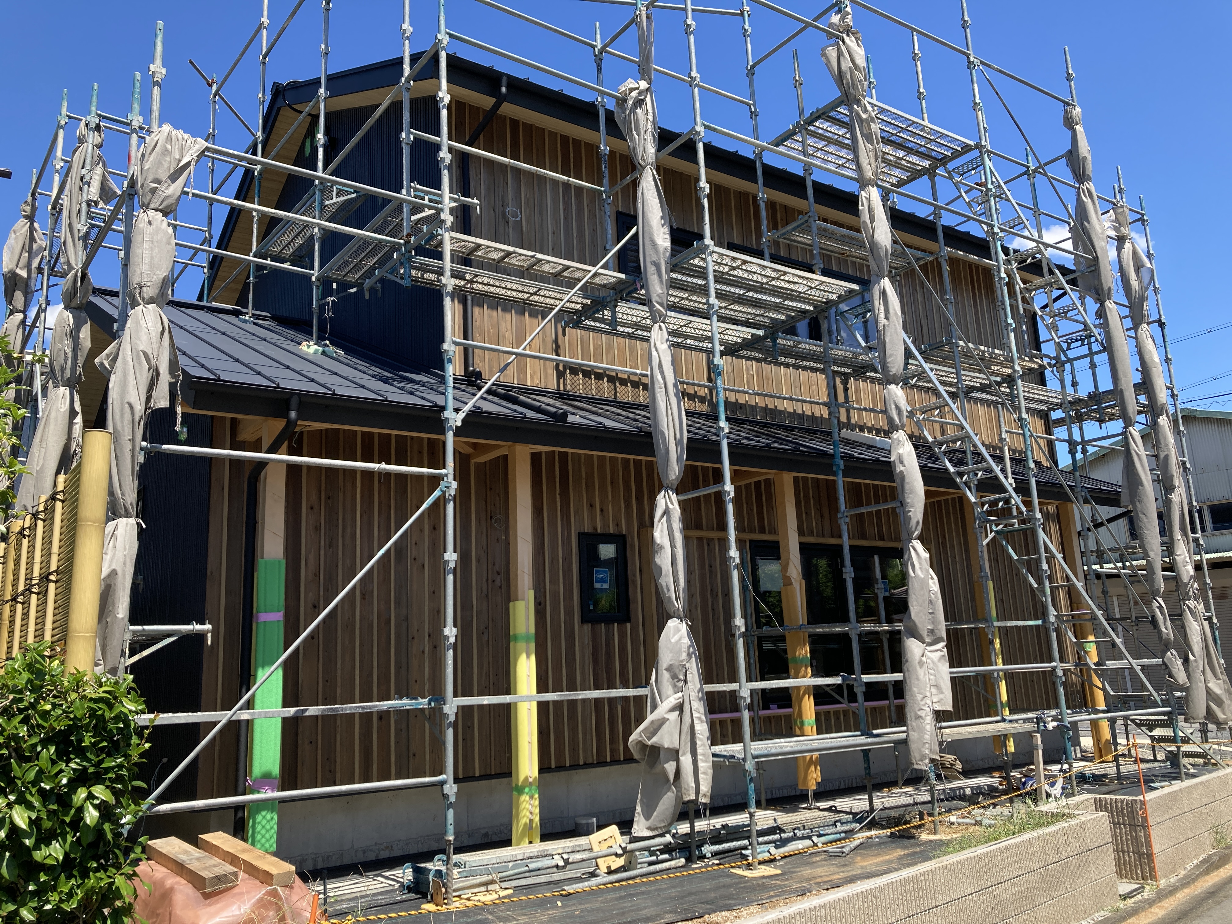 今日は、s戸棟梁が『外壁を仕上げるぞ!』と暑い中、建物から出たり入ったりを繰り返しています。