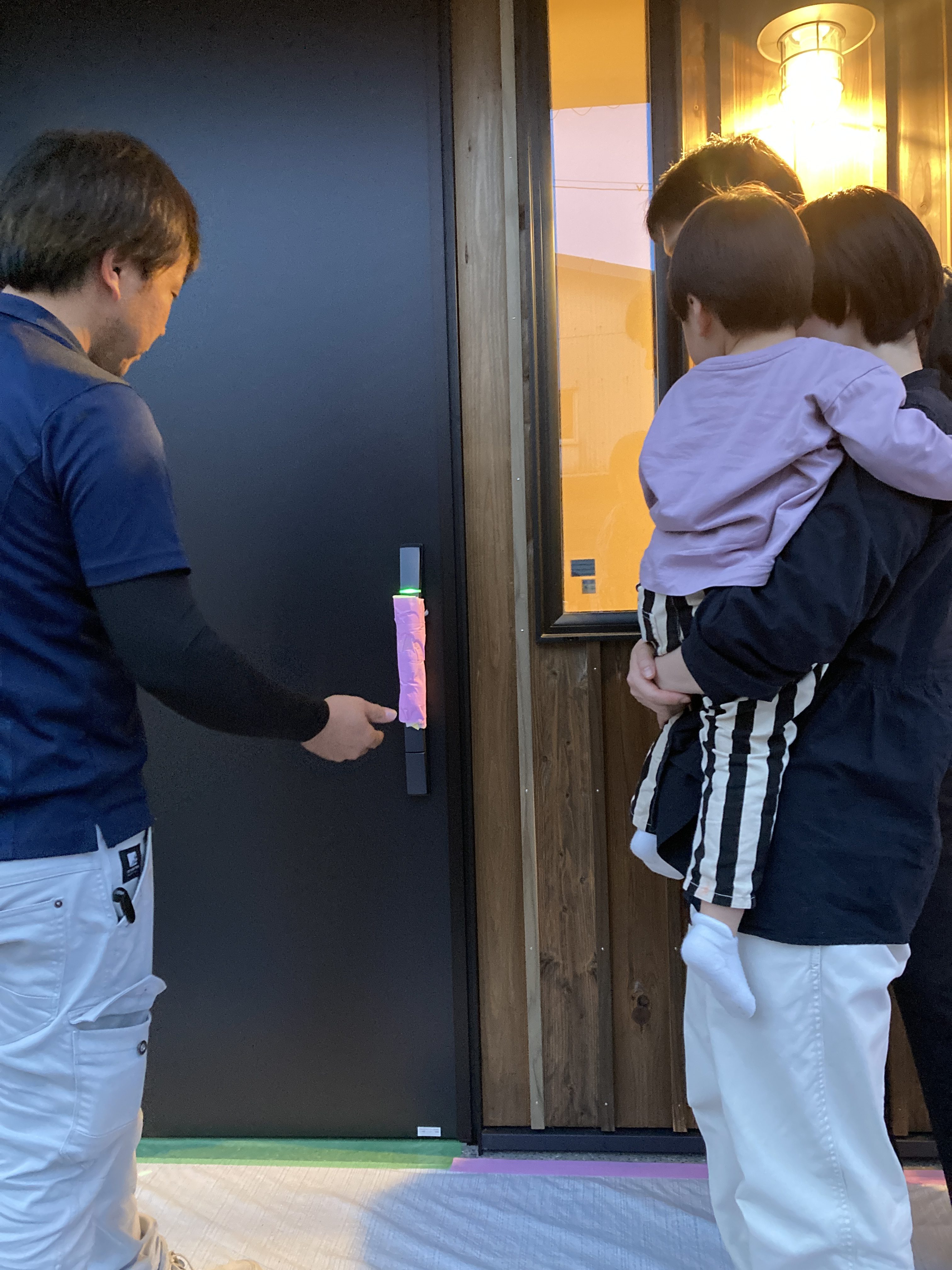 日も暮れ始めて、最後にケーキ入刀じゃなかった💦本キー入刀です。これで、工事用の鍵は使えなくなりました。中にミスターマリックが隠れているです。な~んて(笑)不思議ですね。考えた人スゴイ!