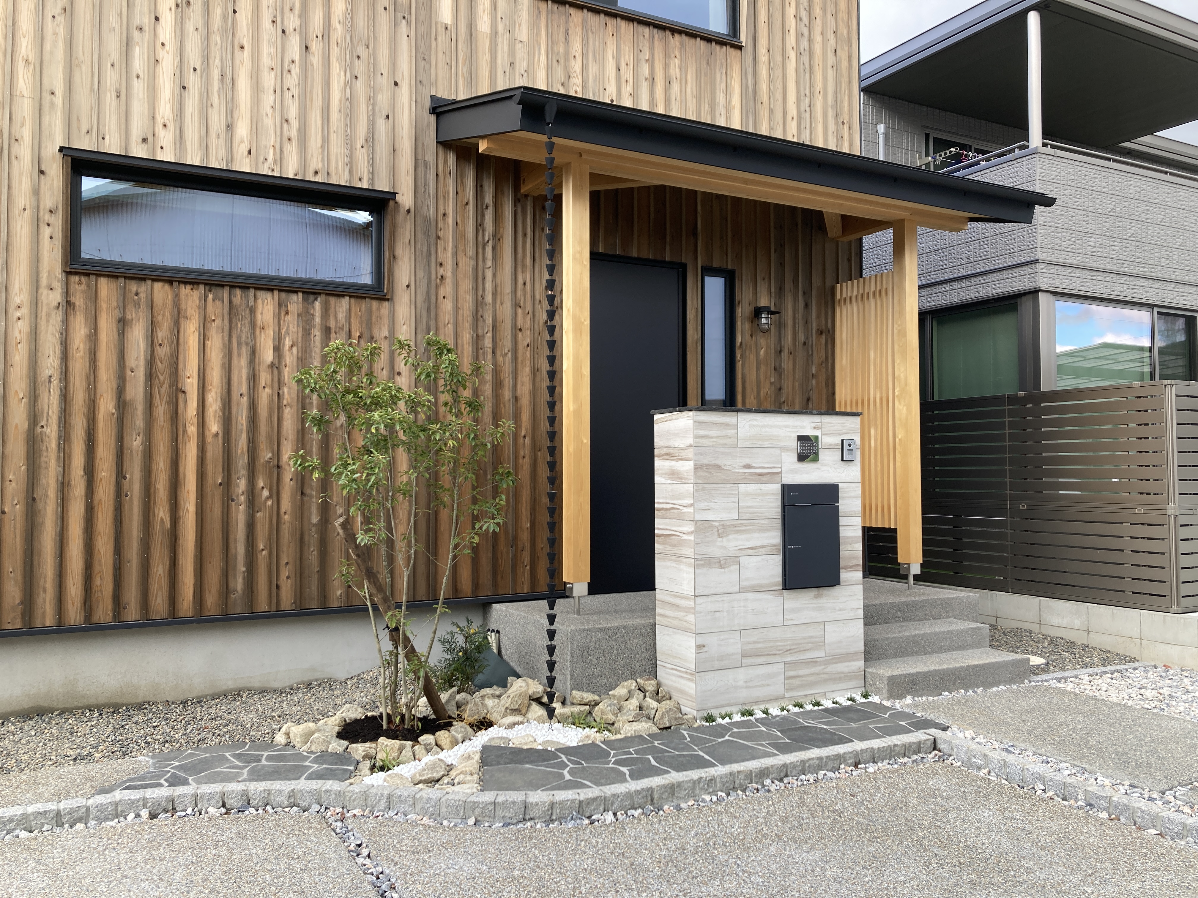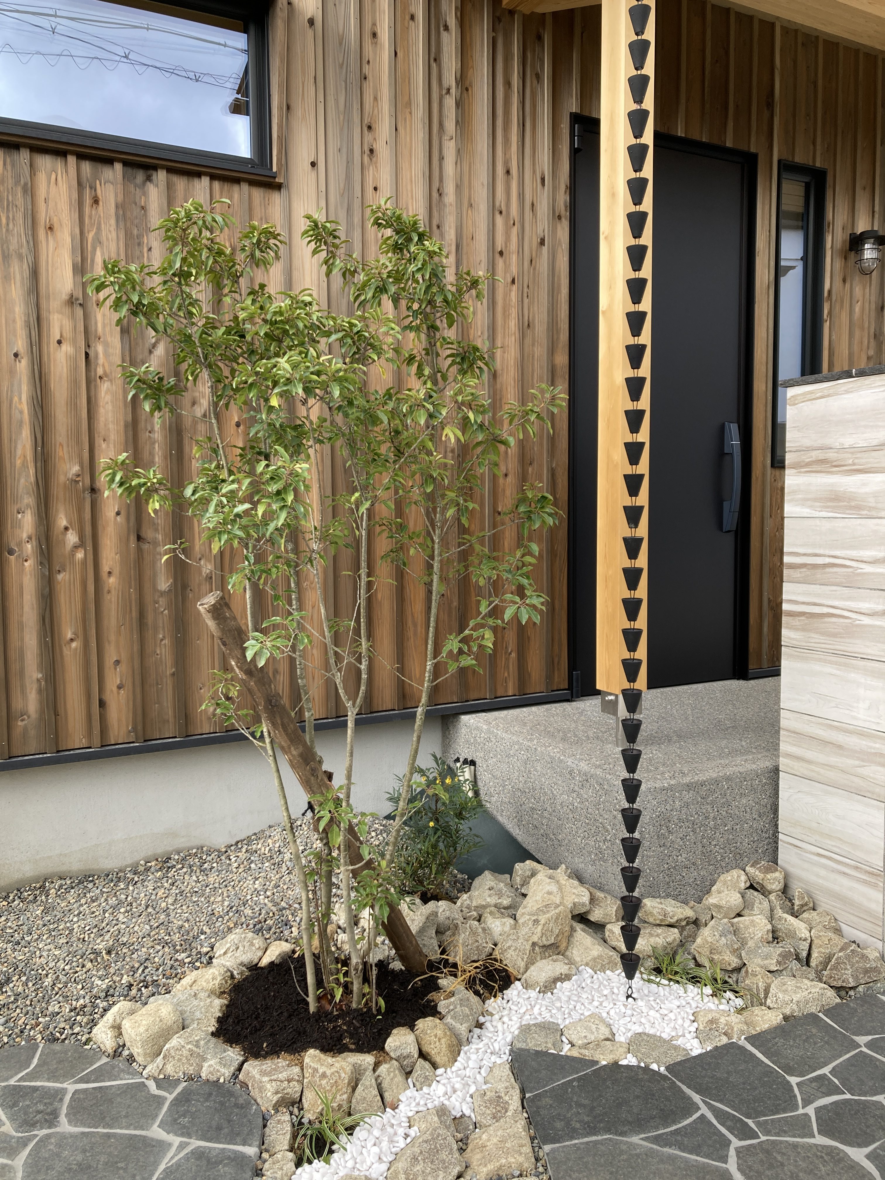 昨日、ミノワ中で初のTictok動画撮影をk様邸で行わせていただきました。gガーデンのs田さんに泣きついて💦何とか土曜日に植栽を入れたいただき、見栄えが一段と良くなりホッと一安心。やっぱり、緑があると違いますね~何度も打合せして決められた、敷石や砂利の色もとても素敵です。樋の黒と那智石の白もお互いに引き立て合っています👍