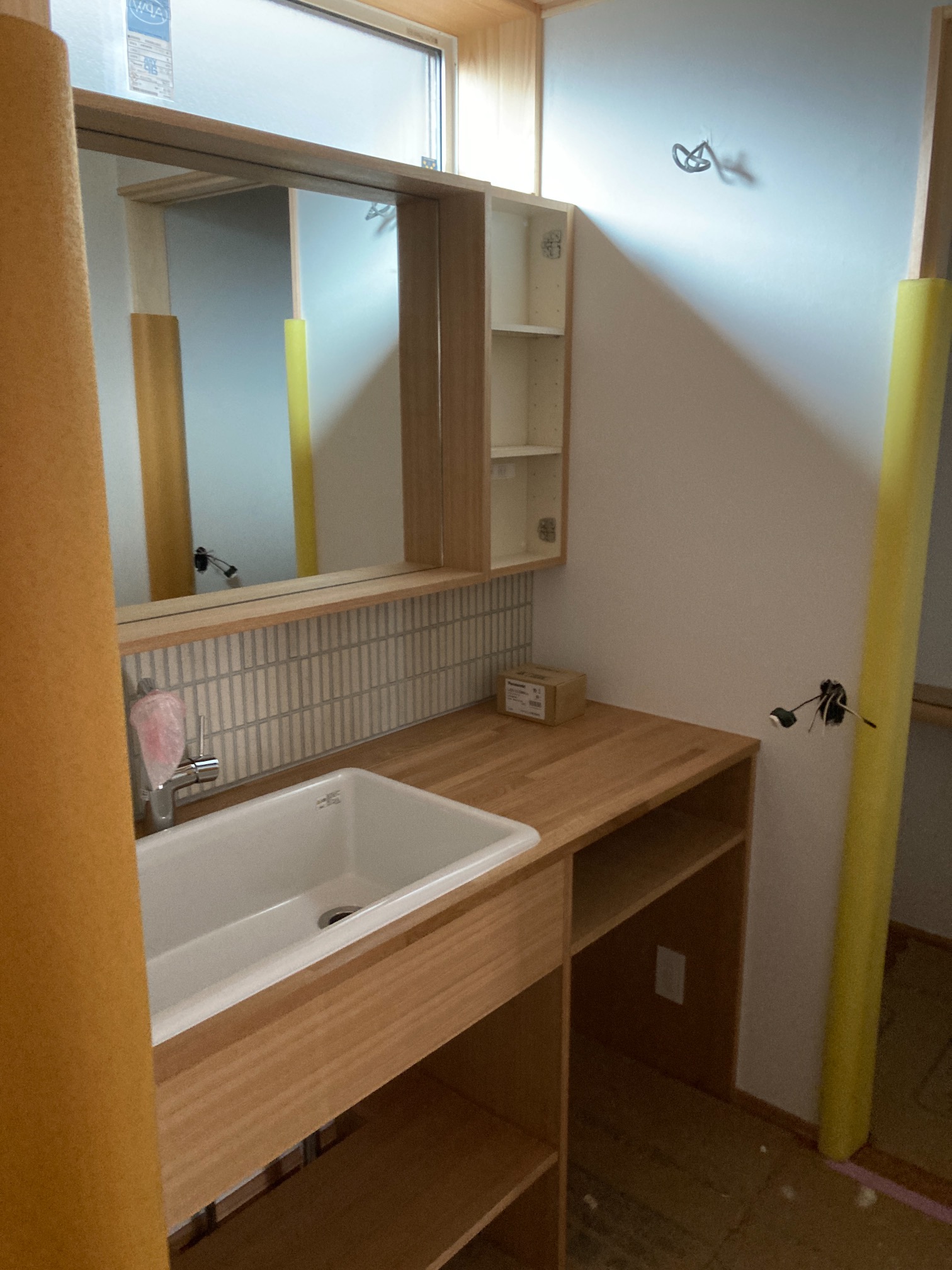 今人気の造作洗面化粧台や、爆発的人気の乾太くん、何やら見たことが無いブラケットも取り付けられました。ブラケットは、f木工さんの力作です。「思っていたよりも結構手間かかった~」とLINEにつぶやきが届きました(笑)私はそうだと思いましたよ~と返信しておきました。どのように使われるのかは、見学会のお楽しみ~です。