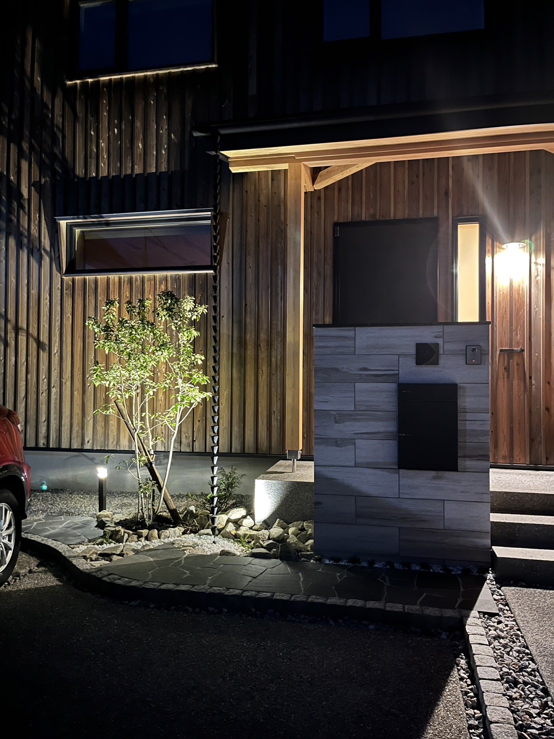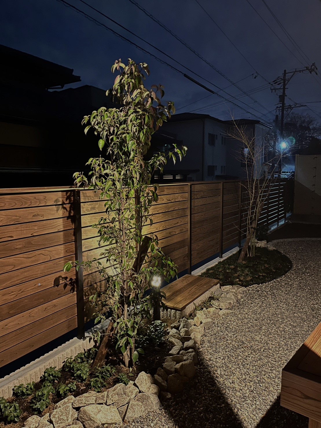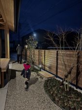 20日に照明器具も取り付けられ、外構工事も何とか年内に完了しました。夜の風景はなかなか見れないのですが、今回は奥様が写真を送ってくださいました。ありがとうございます。やっぱりお庭にも照明器具が少しあると雰囲気がグッと良くなっていいですね👍