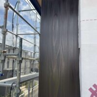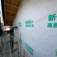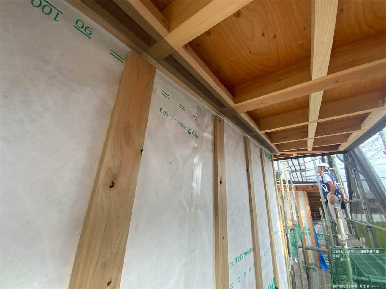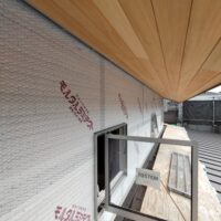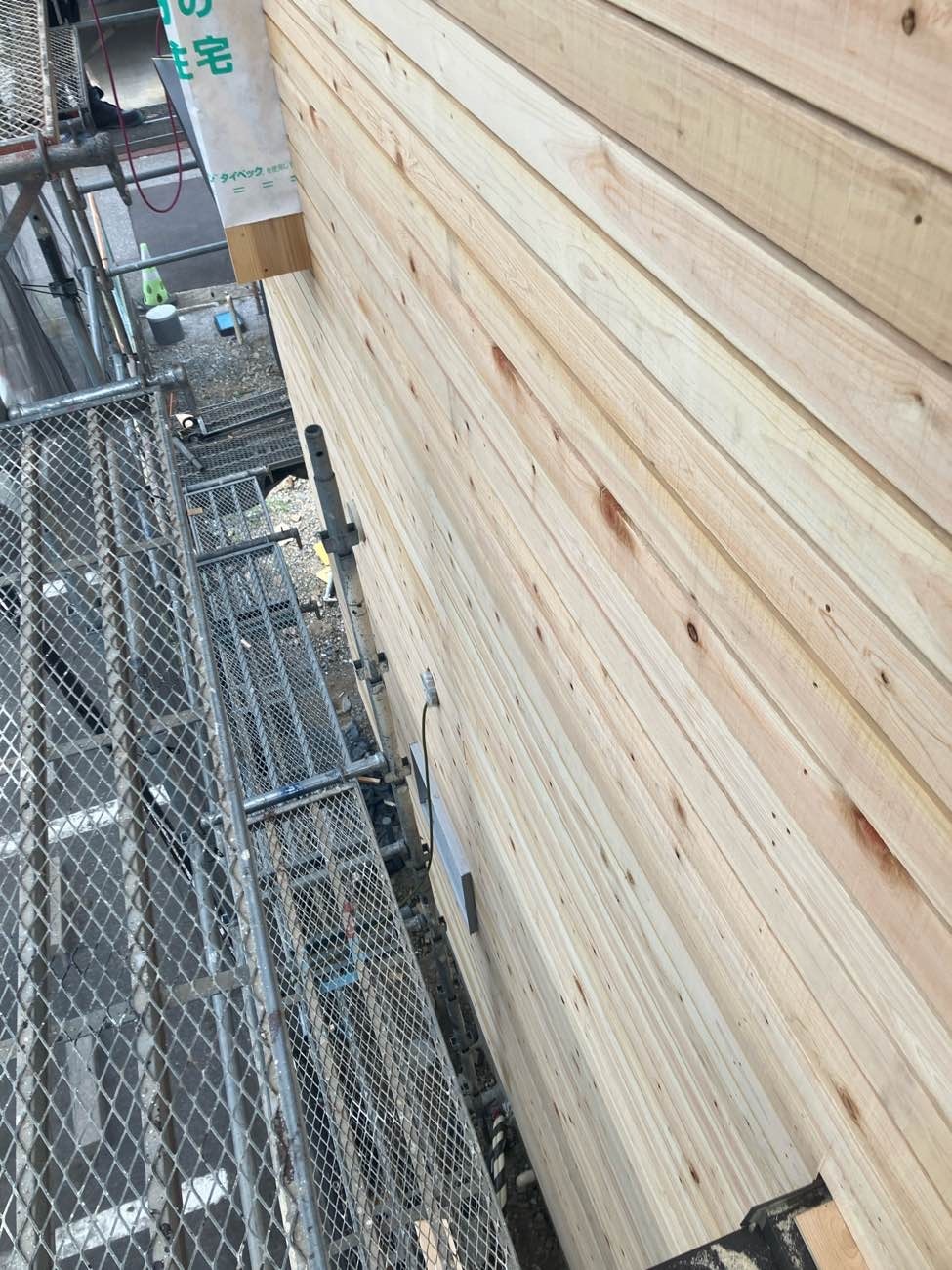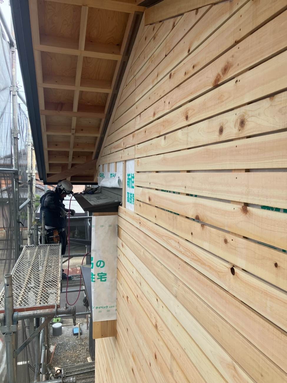 外壁塗り壁用の野地板下地を留め付けています。整然と施工される桧のバラ板。遠目に見ればそのものが仕上材にも見えるかのようにキレイに留め付けられています。この上に防水紙とメタルラスを張り、いよいよ外壁の塗り壁工事が始まります。