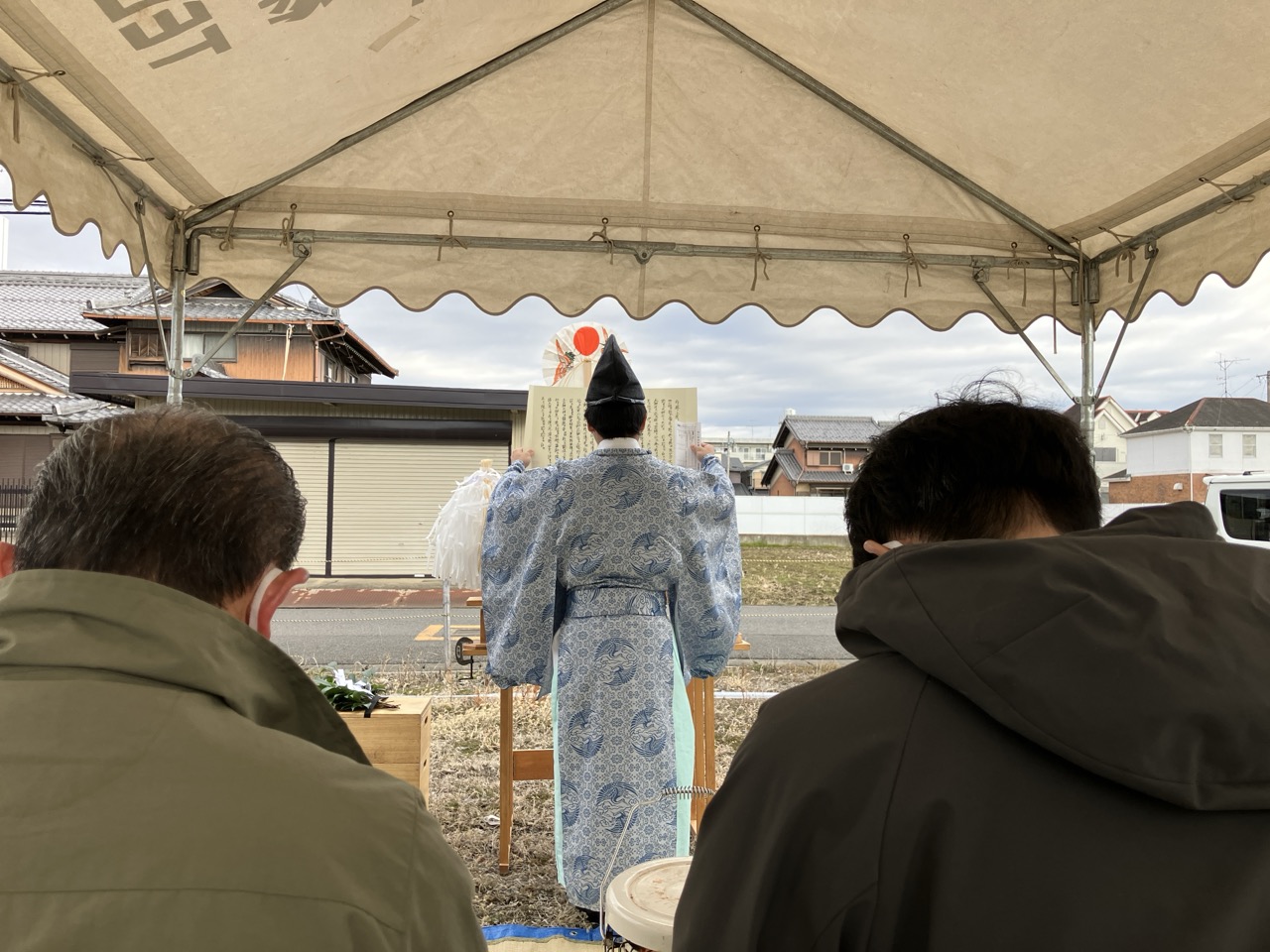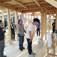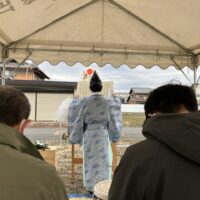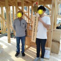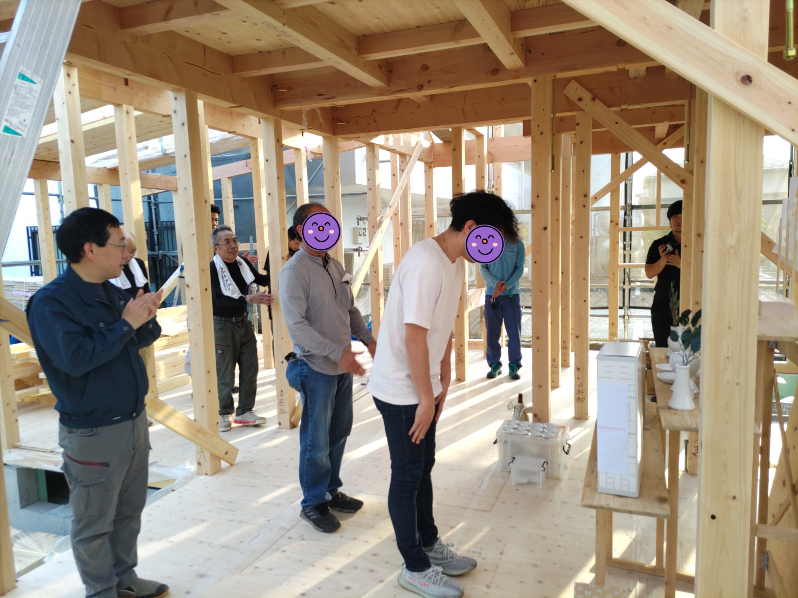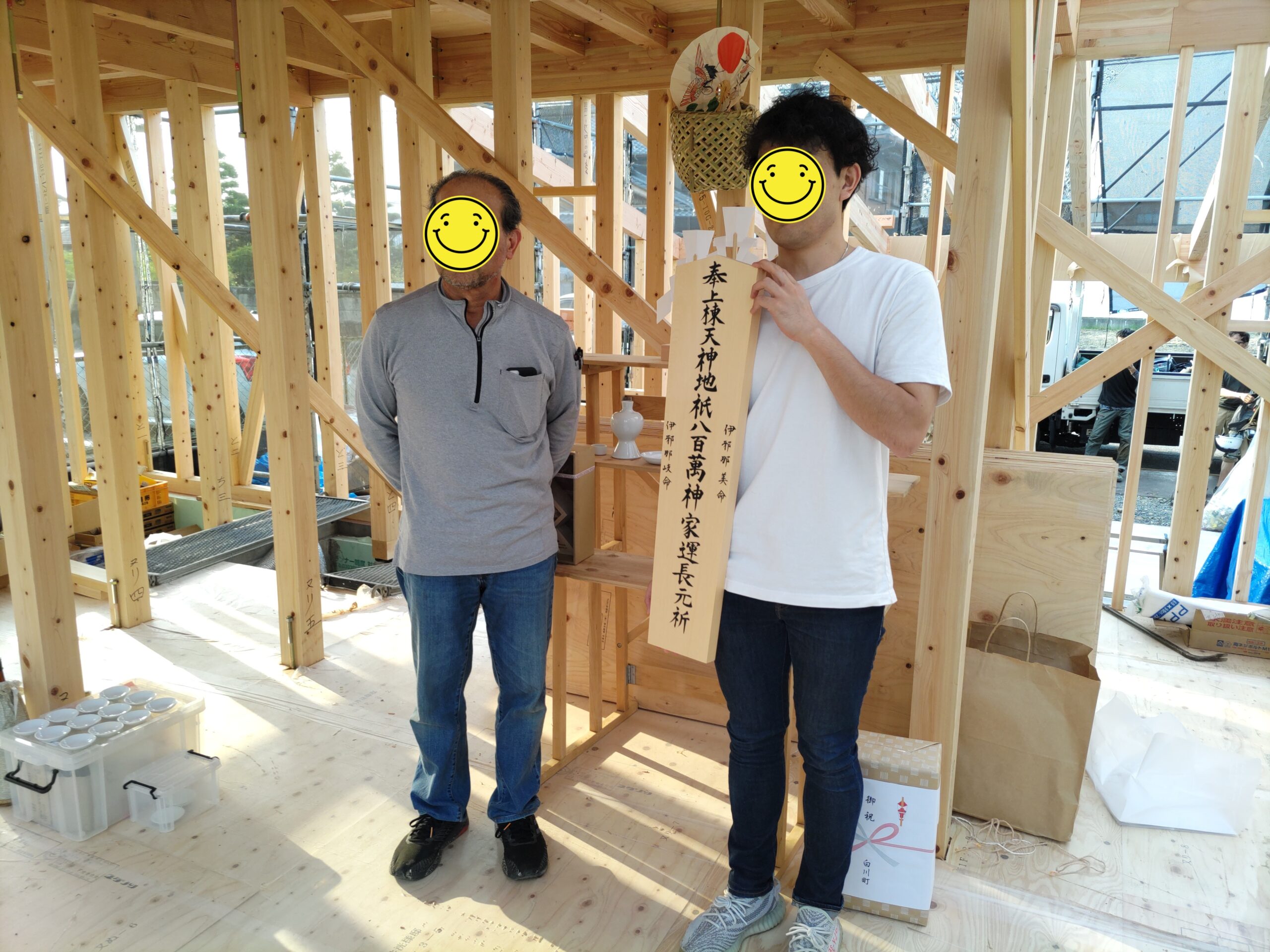 2日かかる工程のため初日は登梁を架けたところで上棟式を執り行いました。ご家族のご健勝と工事の安全を祈願。まだ翌日もありますので気を引き締めなおします。m様本日はおめでとうございます。