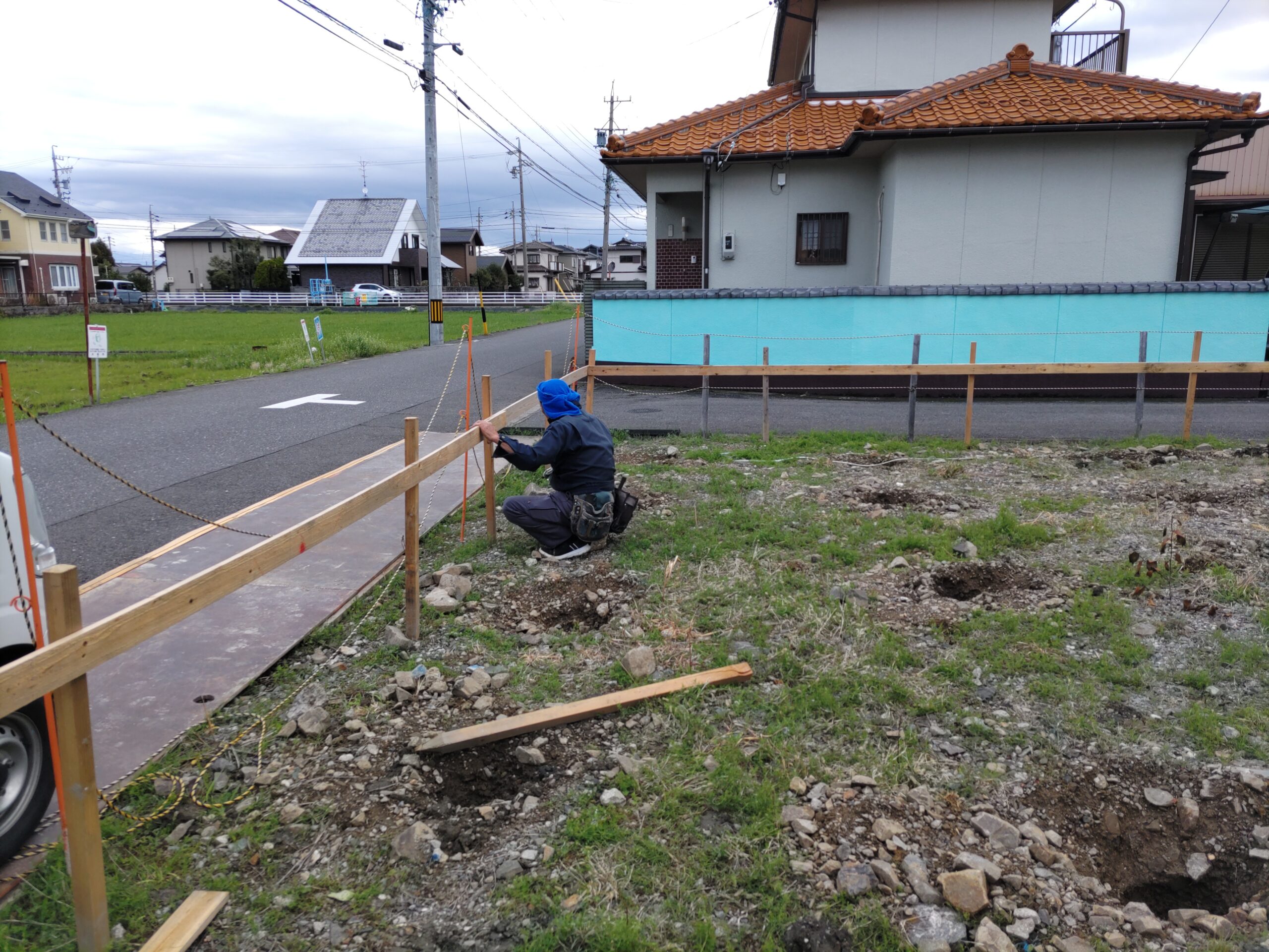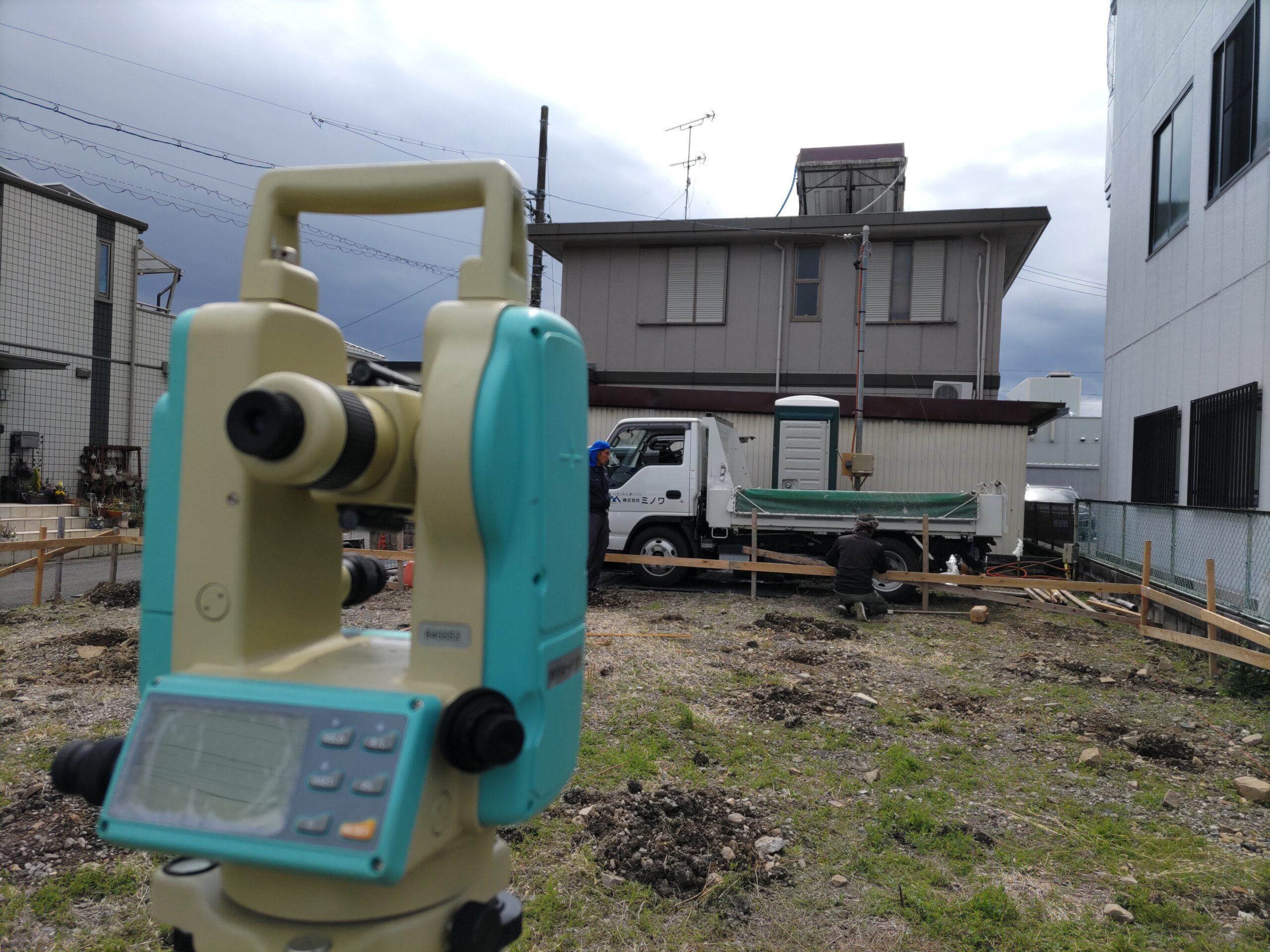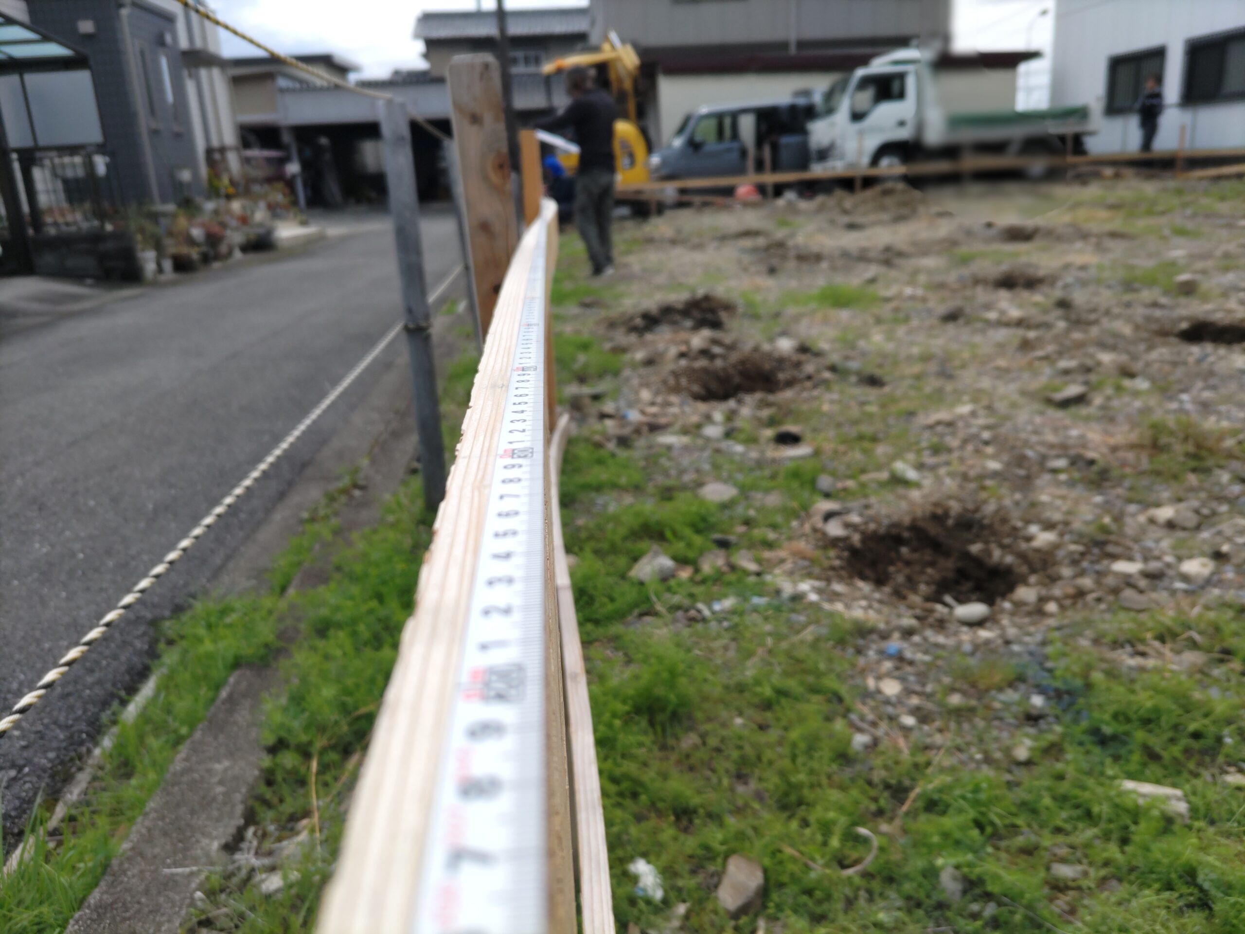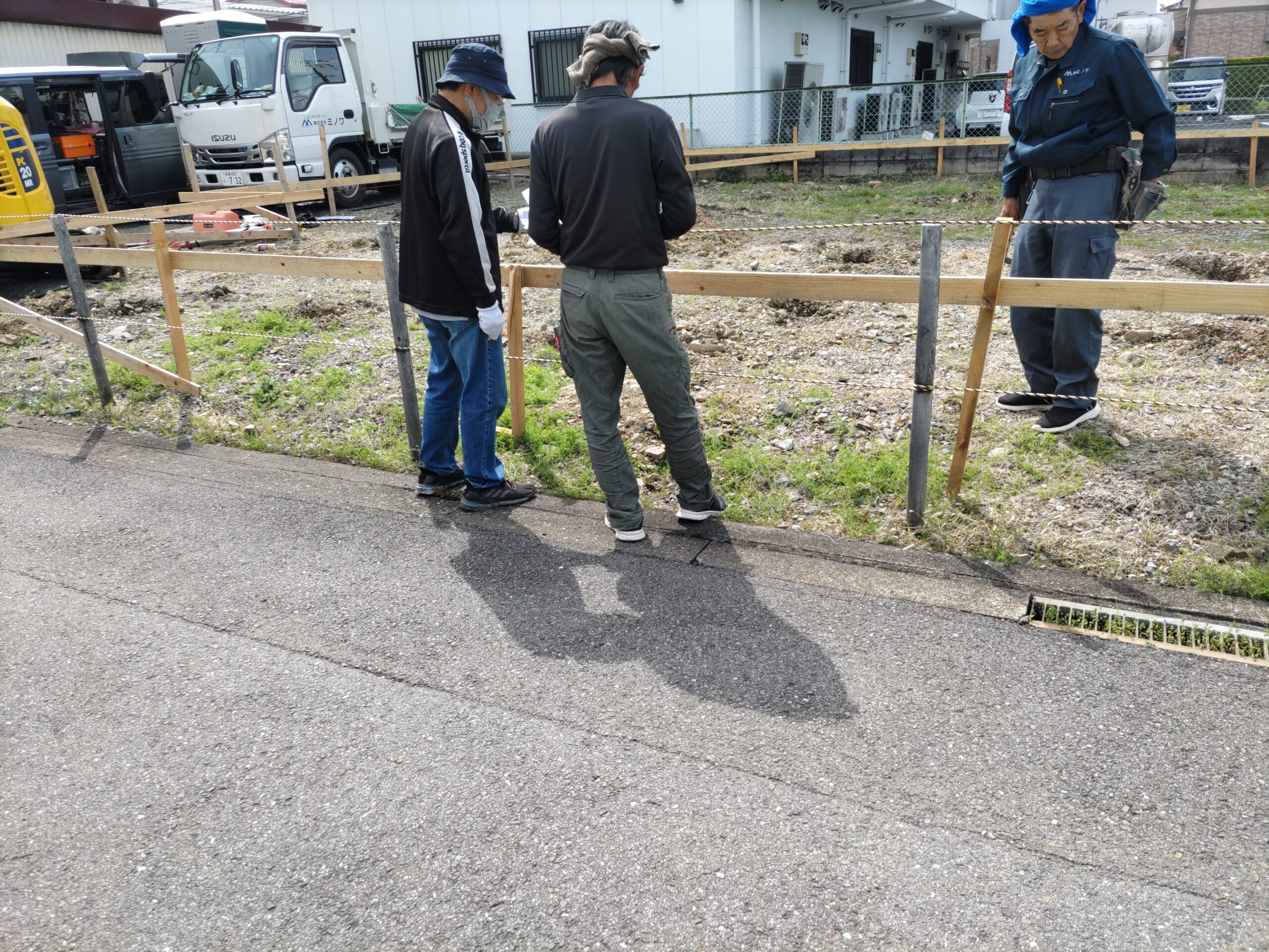 地盤改良工事も完了し、基礎コンクリート用の丁張作業を行いました。ここの地面もところどころ固く、木杭を打つのに一苦労でした。敷地が整形なため、配置出しをするのにはそこまでの苦労はありません。