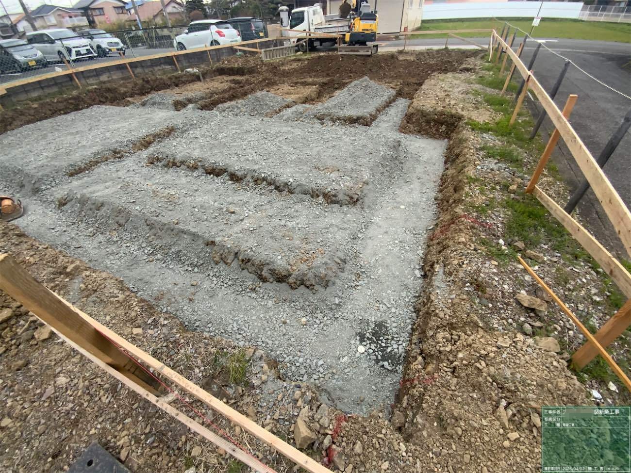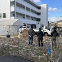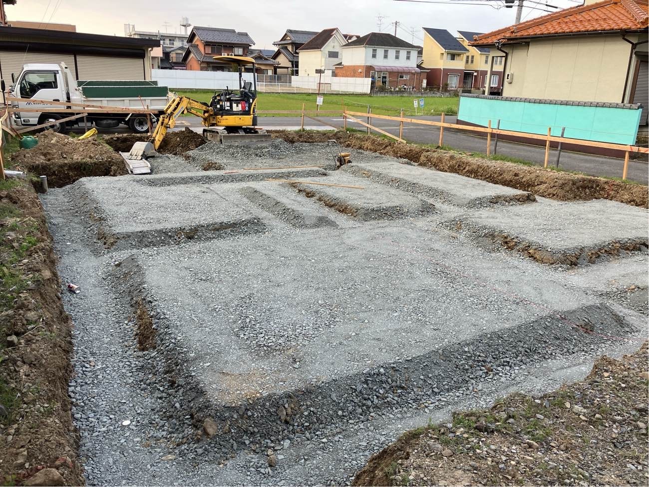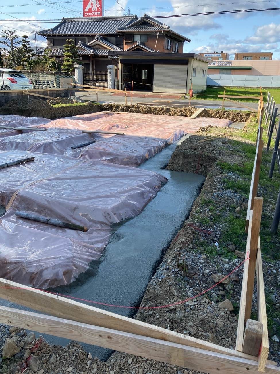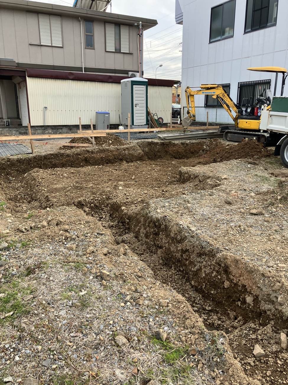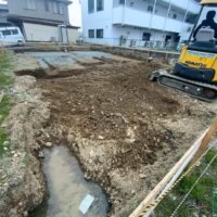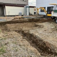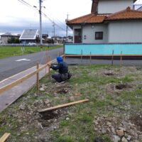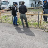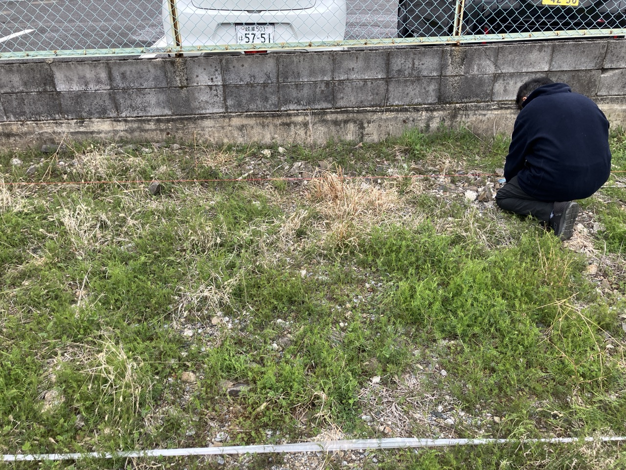 地盤改良工事も完了し、基礎コンクリート用の丁張作業を行いました。ここの地面もところどころ固く、木杭を打つのに一苦労でした。敷地が整形なため、配置出しをするのにはそこまでの苦労はありません。