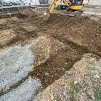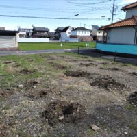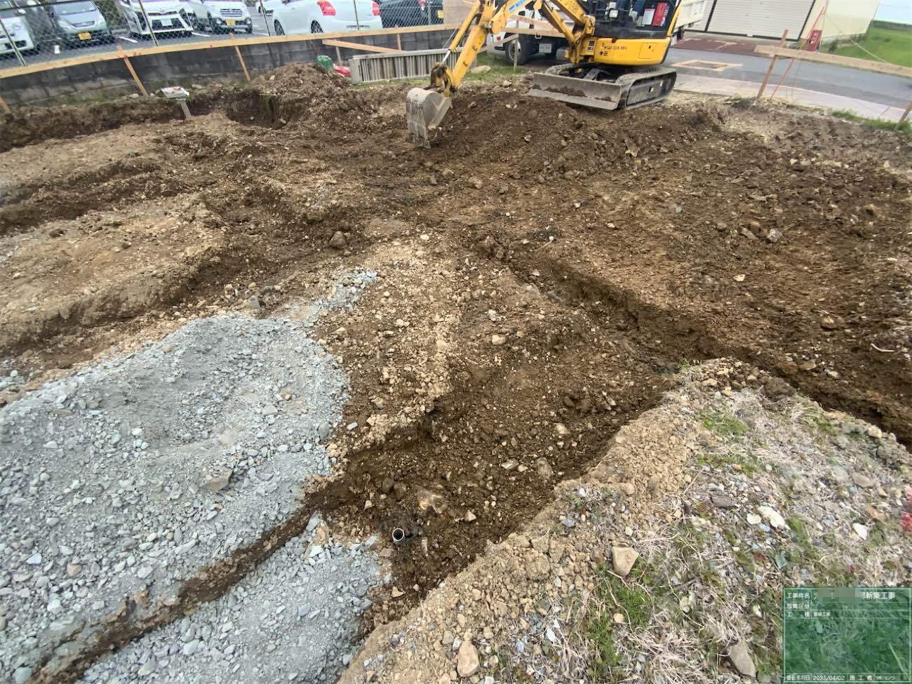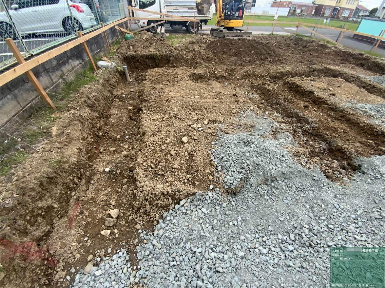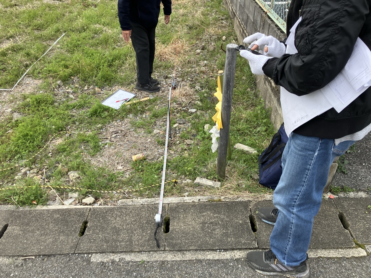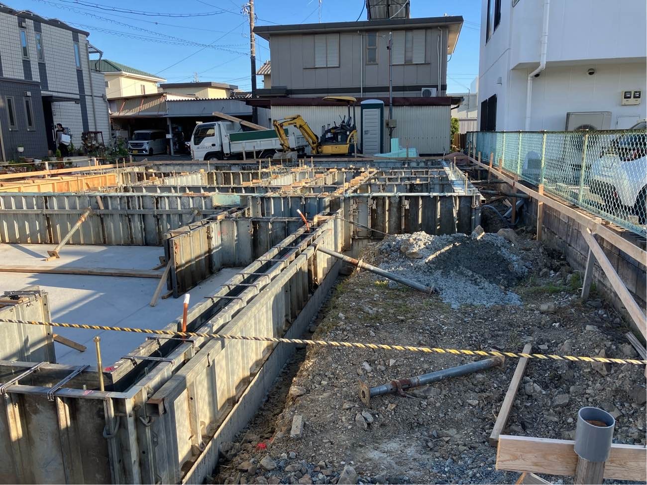 地盤改良工事も完了し、基礎コンクリート用の丁張作業を行いました。ここの地面もところどころ固く、木杭を打つのに一苦労でした。敷地が整形なため、配置出しをするのにはそこまでの苦労はありません。