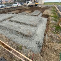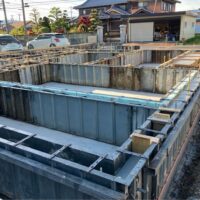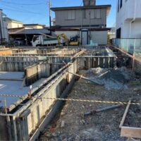 基礎型枠の解体。立ち上がりの内側には断熱材が同時に打たれています。片持ち梁部分もキレイに上がっているようです。まだ足場のないこの時期はここまで車両を突っ込むことができますが、上棟後果たして停めることができるのでしょうか。