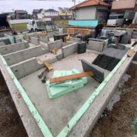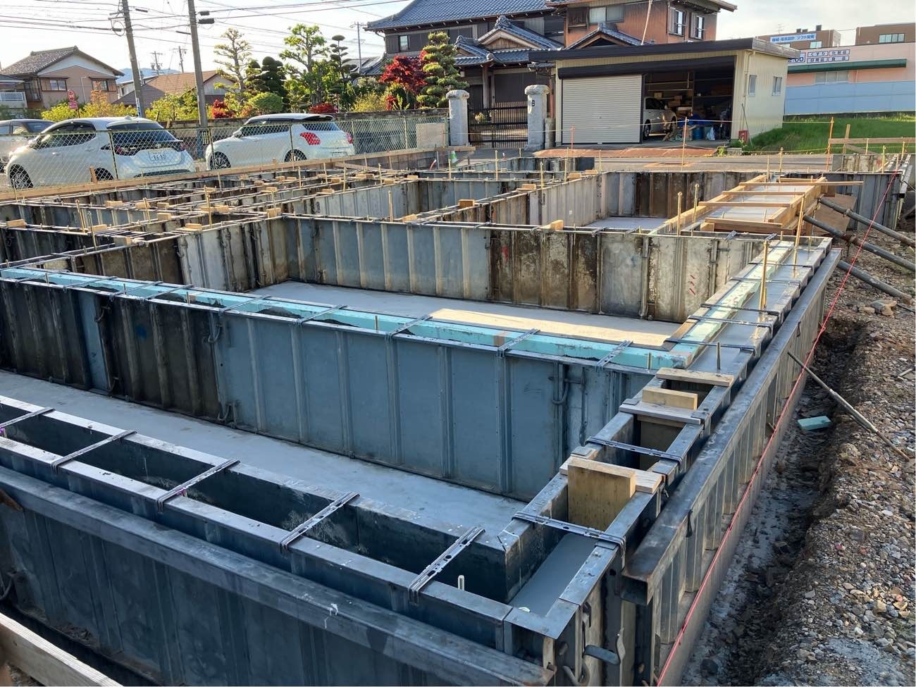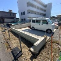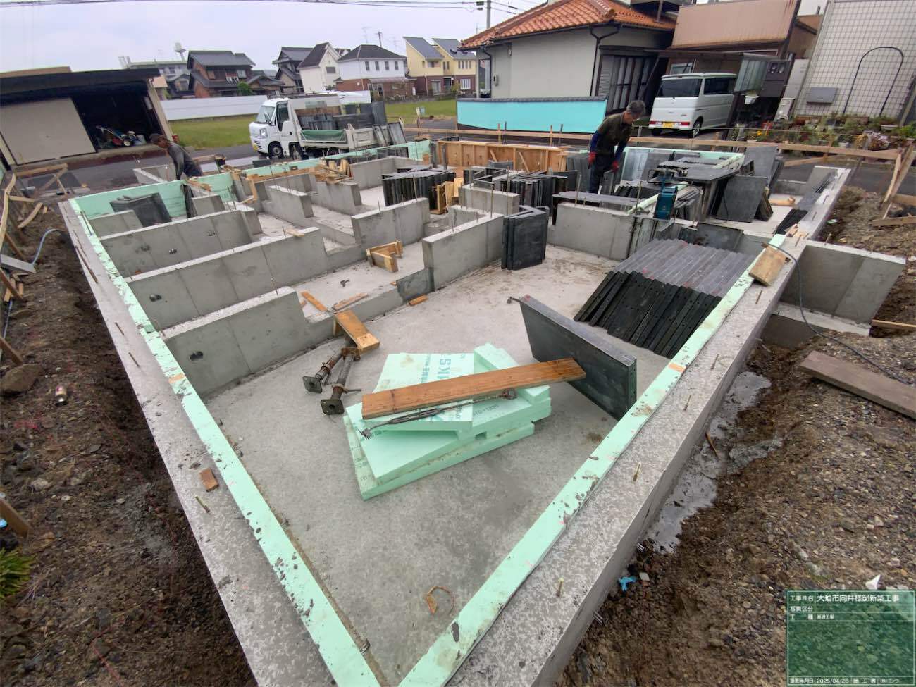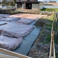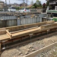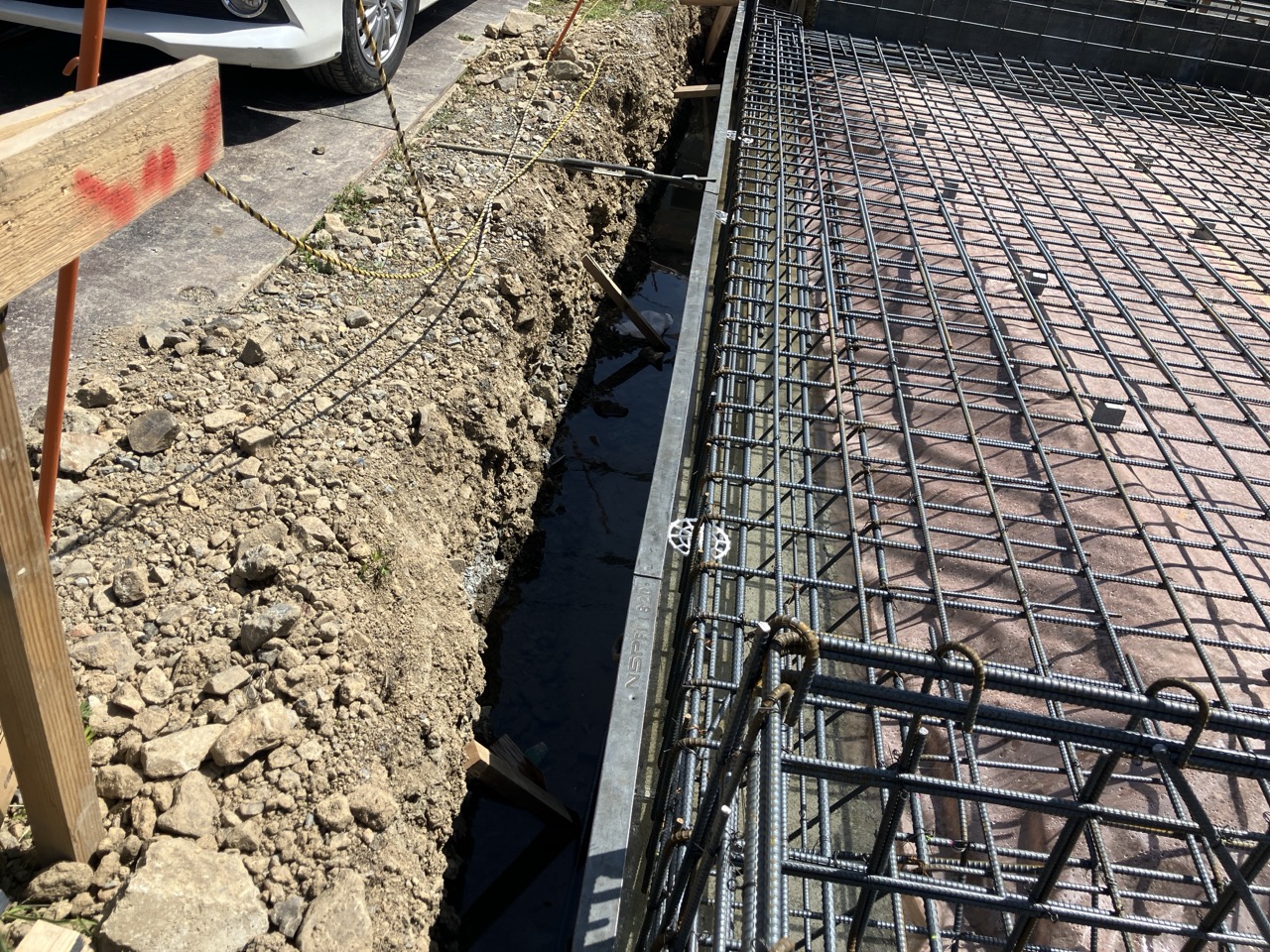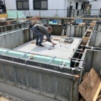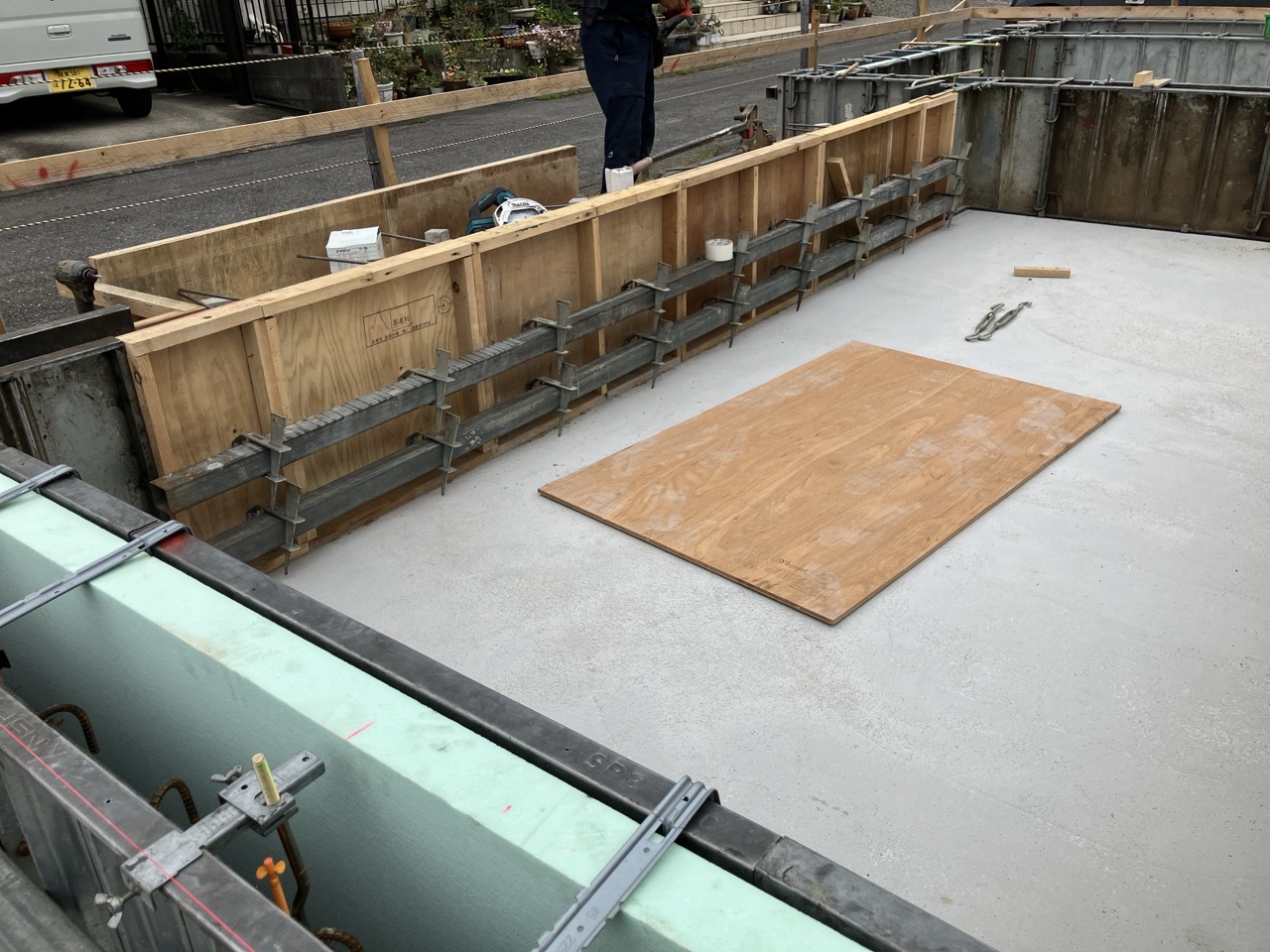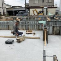 基礎立ち上がりコンクリート打設と天端セルフレベリング材の敷設。大雨予報の日程を避け、快晴の下打設できました。移動のため運転している車内ではだいぶ暑くなってくる季節ですが、まだまだ外では涼しいくらい。良い気候の時に作業ができています。