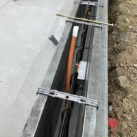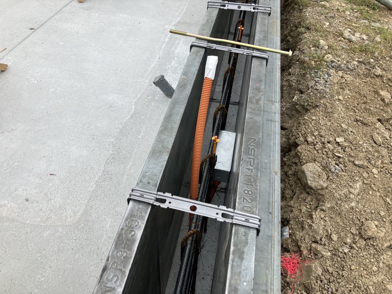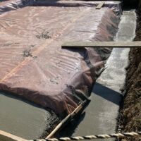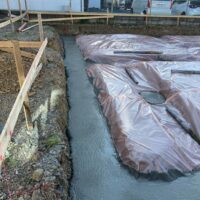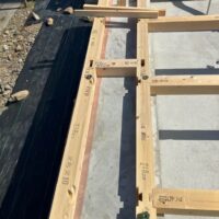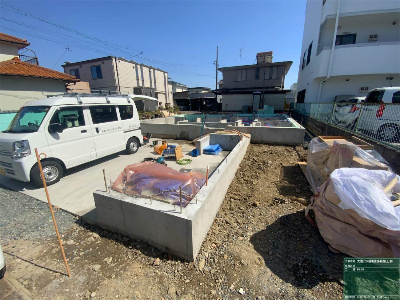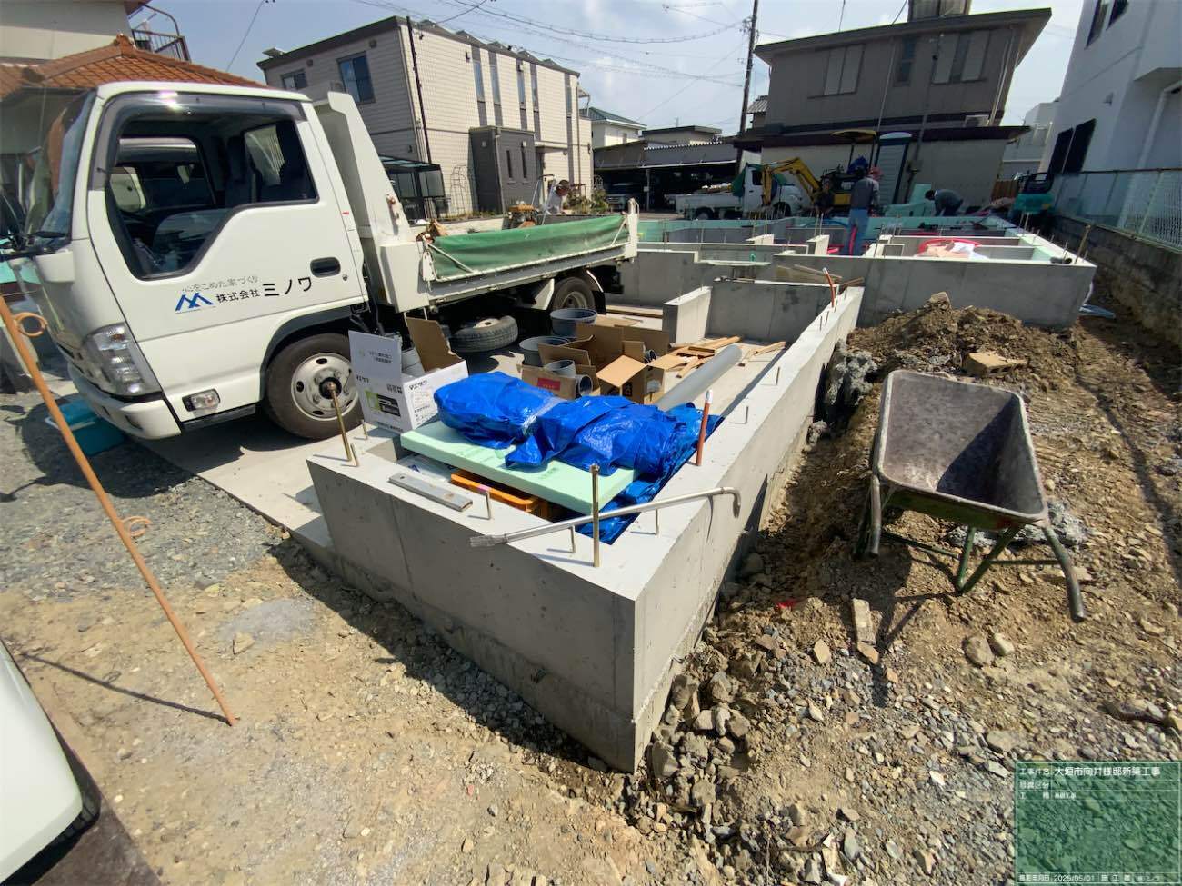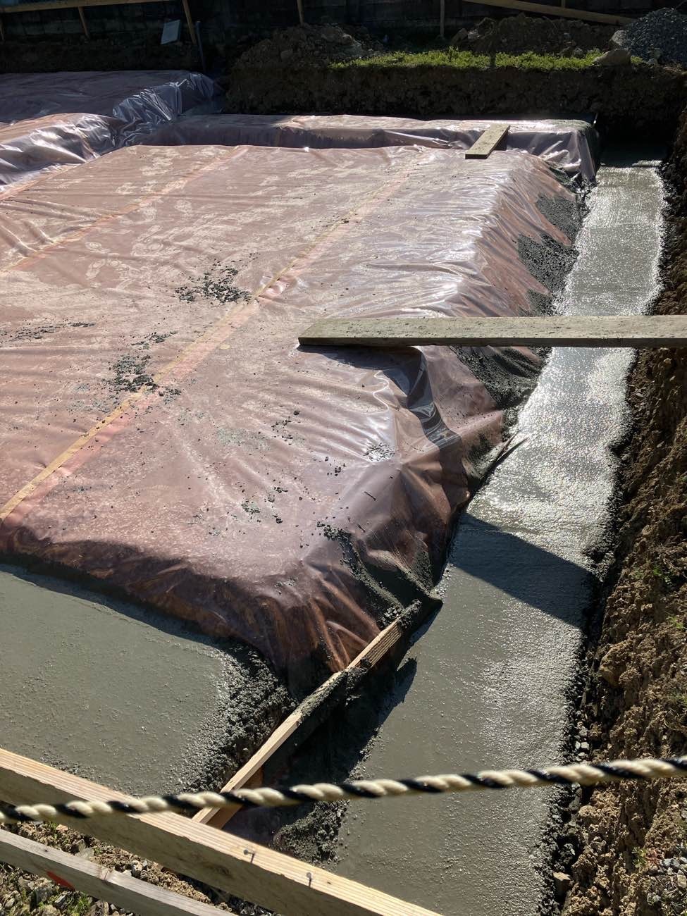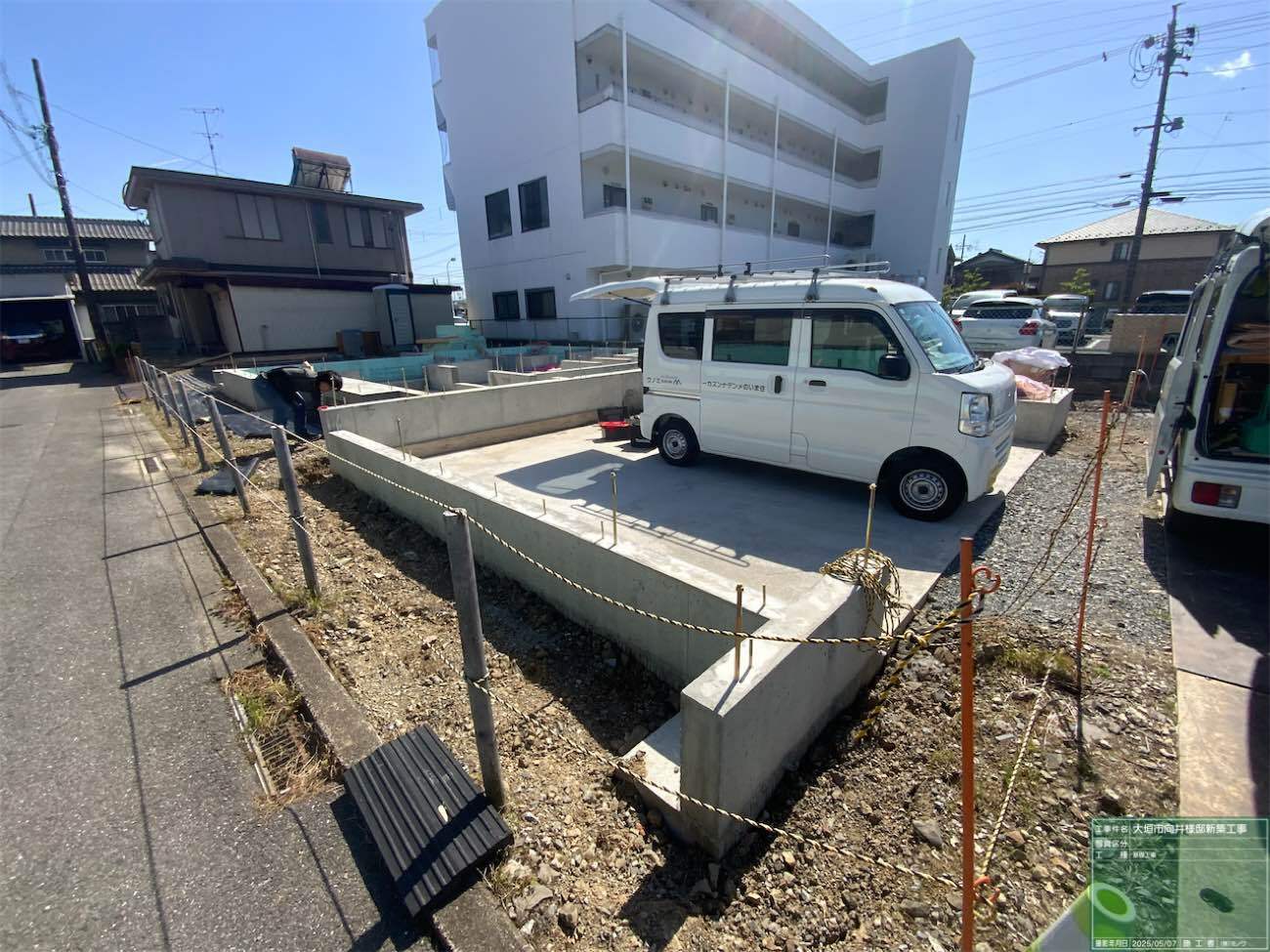 基礎立ち上がりコンクリート打設と天端セルフレベリング材の敷設。大雨予報の日程を避け、快晴の下打設できました。移動のため運転している車内ではだいぶ暑くなってくる季節ですが、まだまだ外では涼しいくらい。良い気候の時に作業ができています。