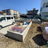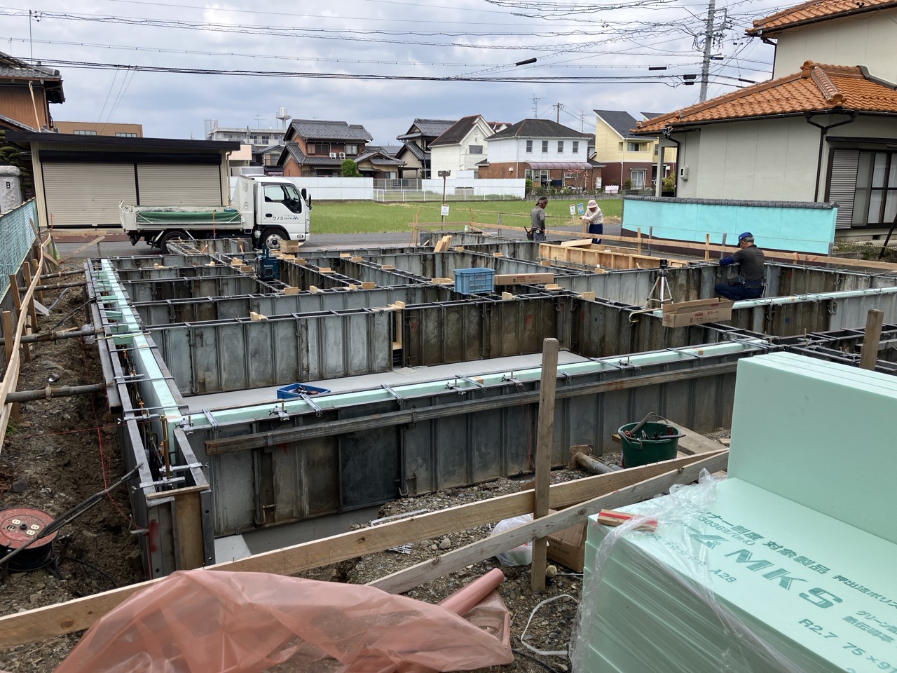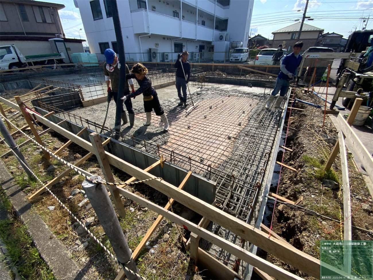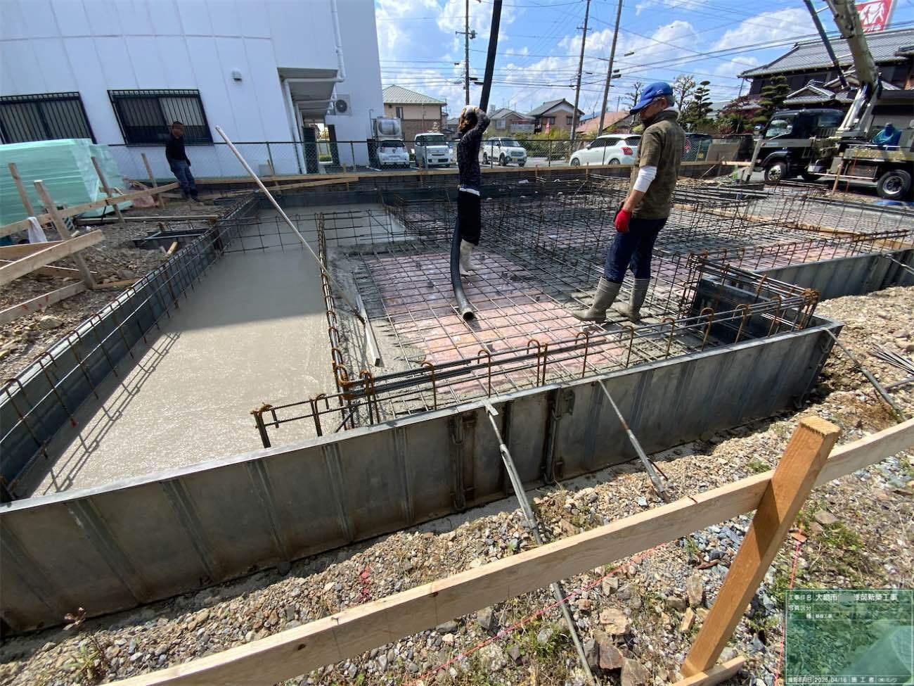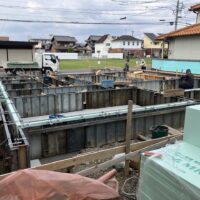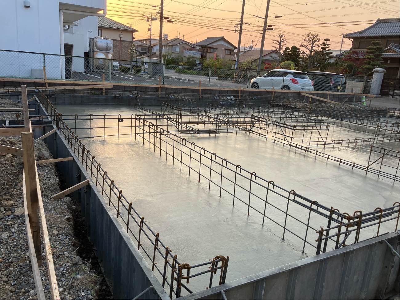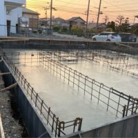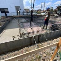 基礎コンクリートのスラブを打設。今回も地中梁が多いため、表面から見られるよりは大量の生コンが必要です。その分ガッチリした構造になってくれるでしょう。スラブも途中で段差があるため、普段とは違った注意が必要です。