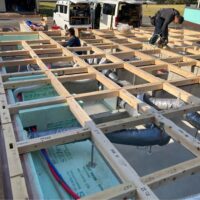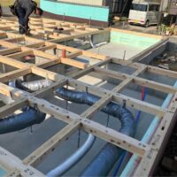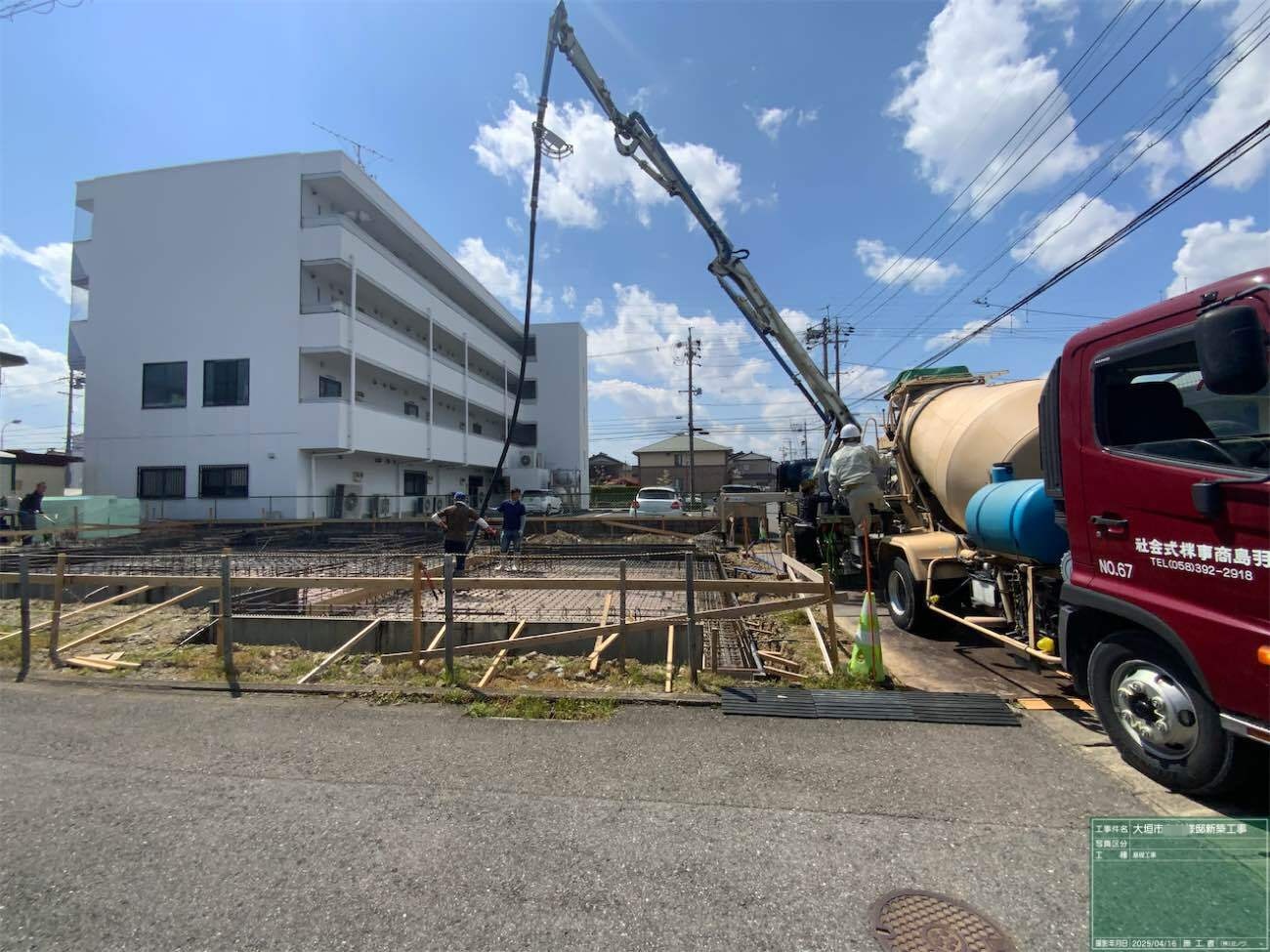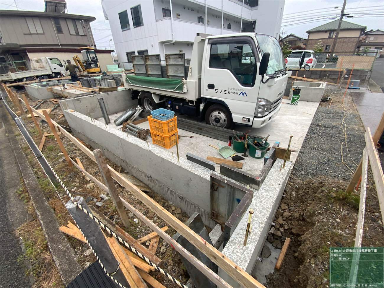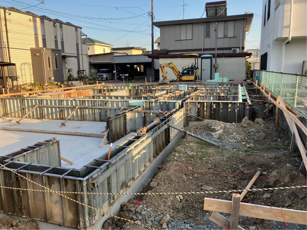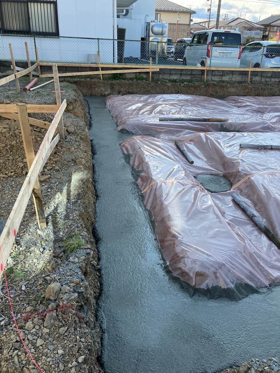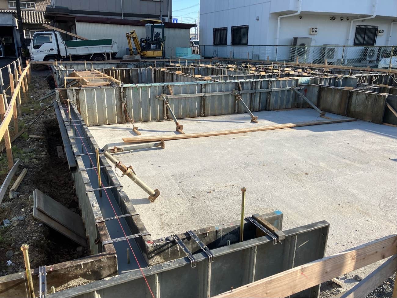 基礎コンクリートのスラブを打設。今回も地中梁が多いため、表面から見られるよりは大量の生コンが必要です。その分ガッチリした構造になってくれるでしょう。スラブも途中で段差があるため、普段とは違った注意が必要です。