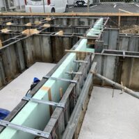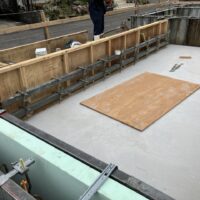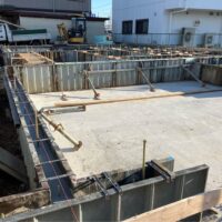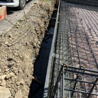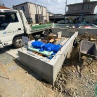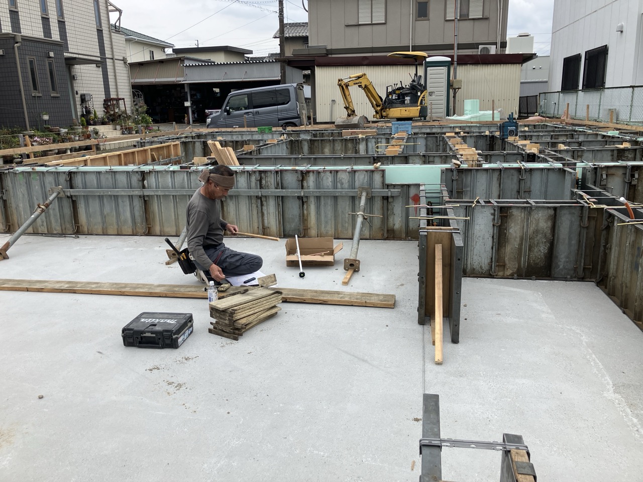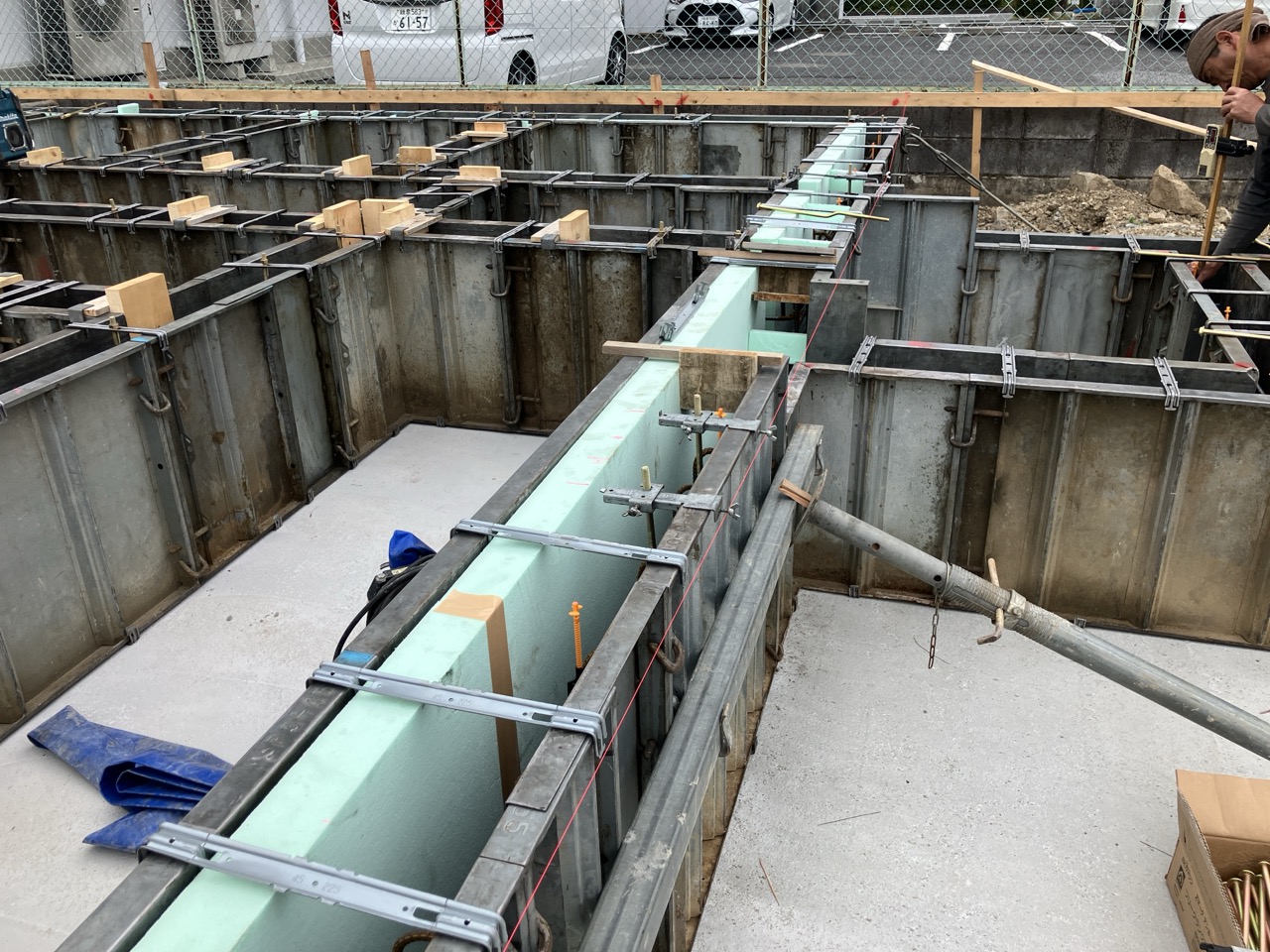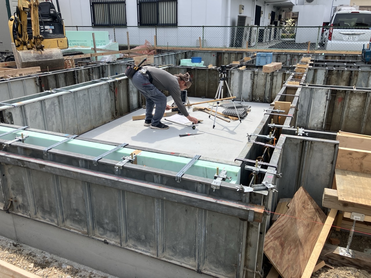 ベースコンクリートが乾き、立ち上がりのための鋼製型枠を組んでいきます。こちらも普段と違い、立ち上がり高さ、偏心、コンクリートの中に仕込む配管等、普段と勝手が違うのでt広さんも四苦八苦しています。