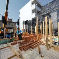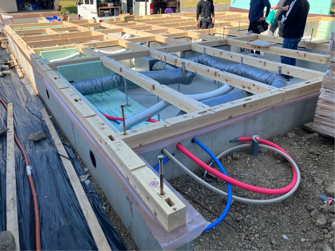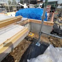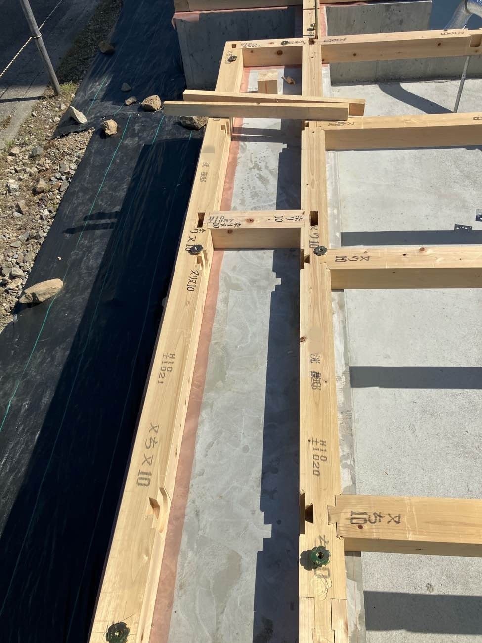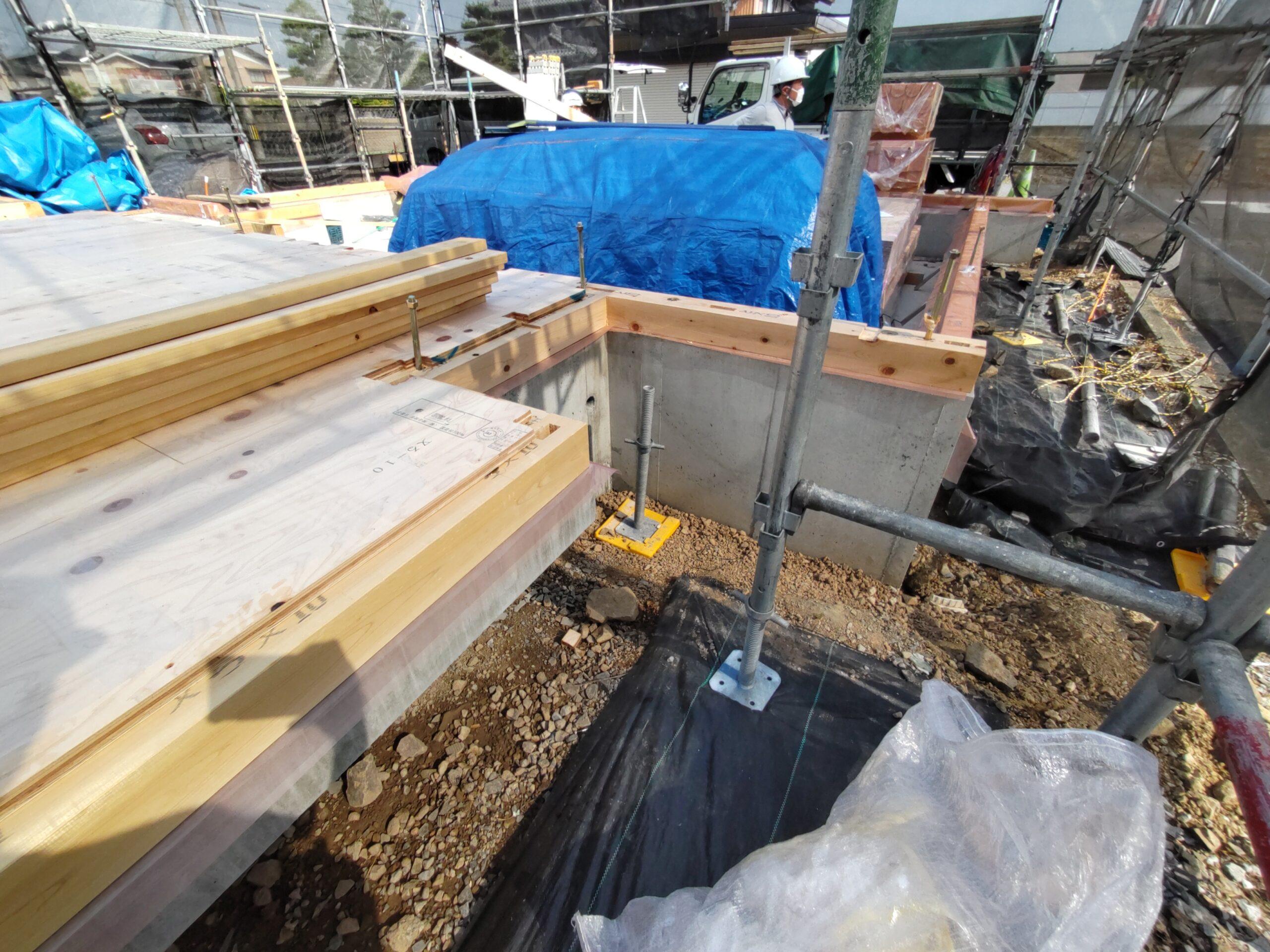 土台伏せ工事が始まりました。今回は床下の配管工事は土台伏せと合判で行っています。後に床を伏せてから作業するというのは極めて困難なため今回の工程となりました。