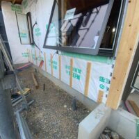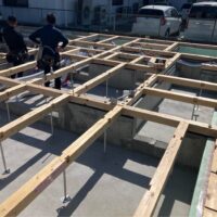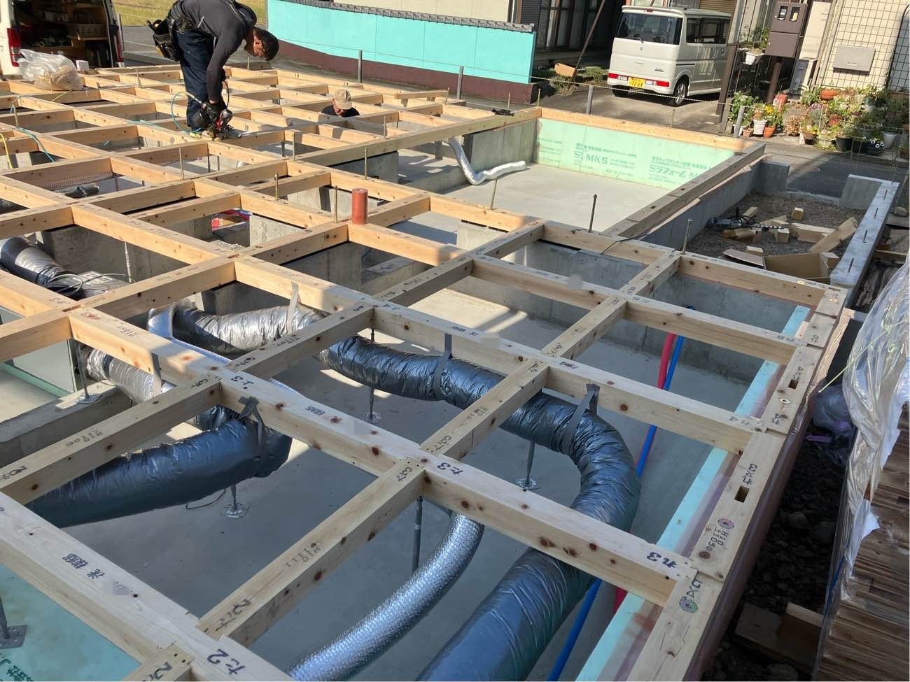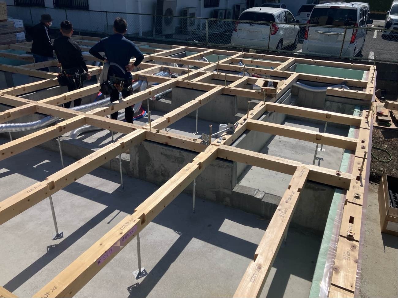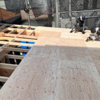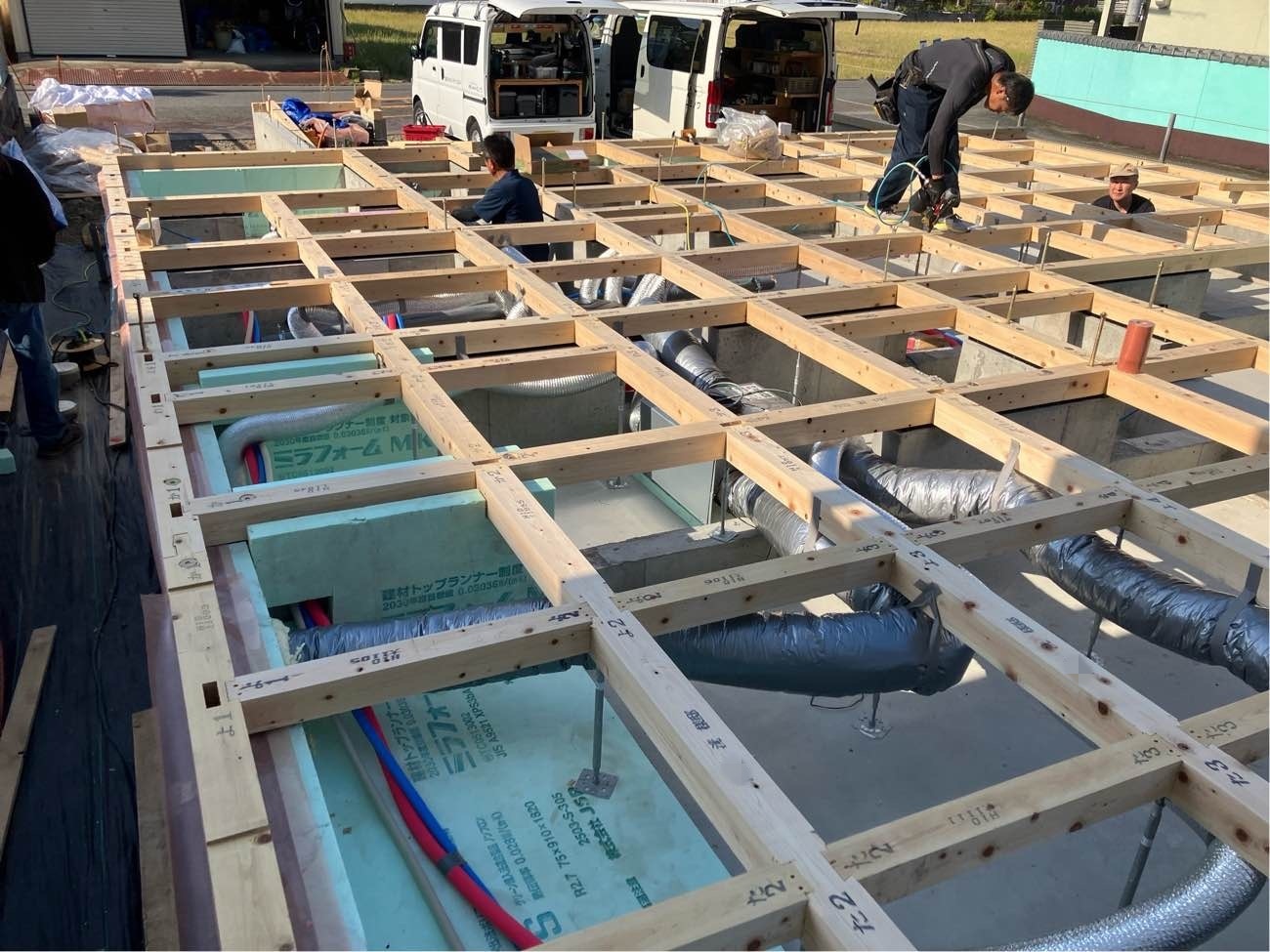 土台伏せ工事が始まりました。今回は床下の配管工事は土台伏せと合判で行っています。後に床を伏せてから作業するというのは極めて困難なため今回の工程となりました。