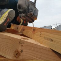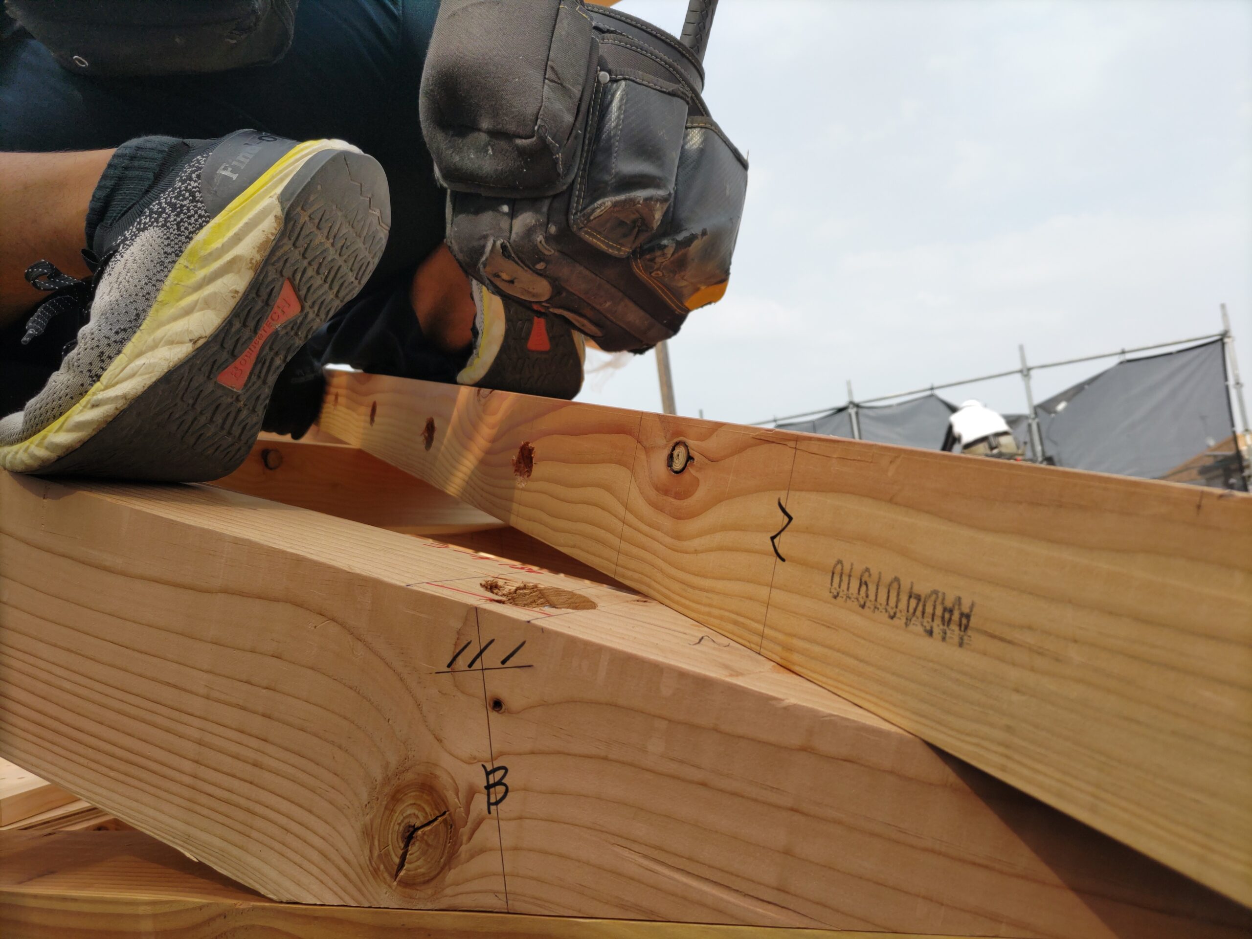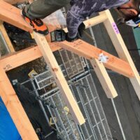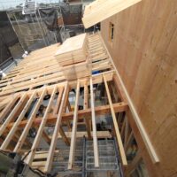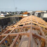 上棟3日目。垂木の細かい部分の加工です。勾配流れ方向は母屋や登梁から従来通り軒へはね出せば良いですが、けらば方向は水平方向へはね出しています。では軒とけらばが合流する隅木部分は?となると寄棟屋根などの時に見られる隅棟の材(厳密には違いますが)を入れて上部に張る合板で持たせる、という方法を使う事になります。