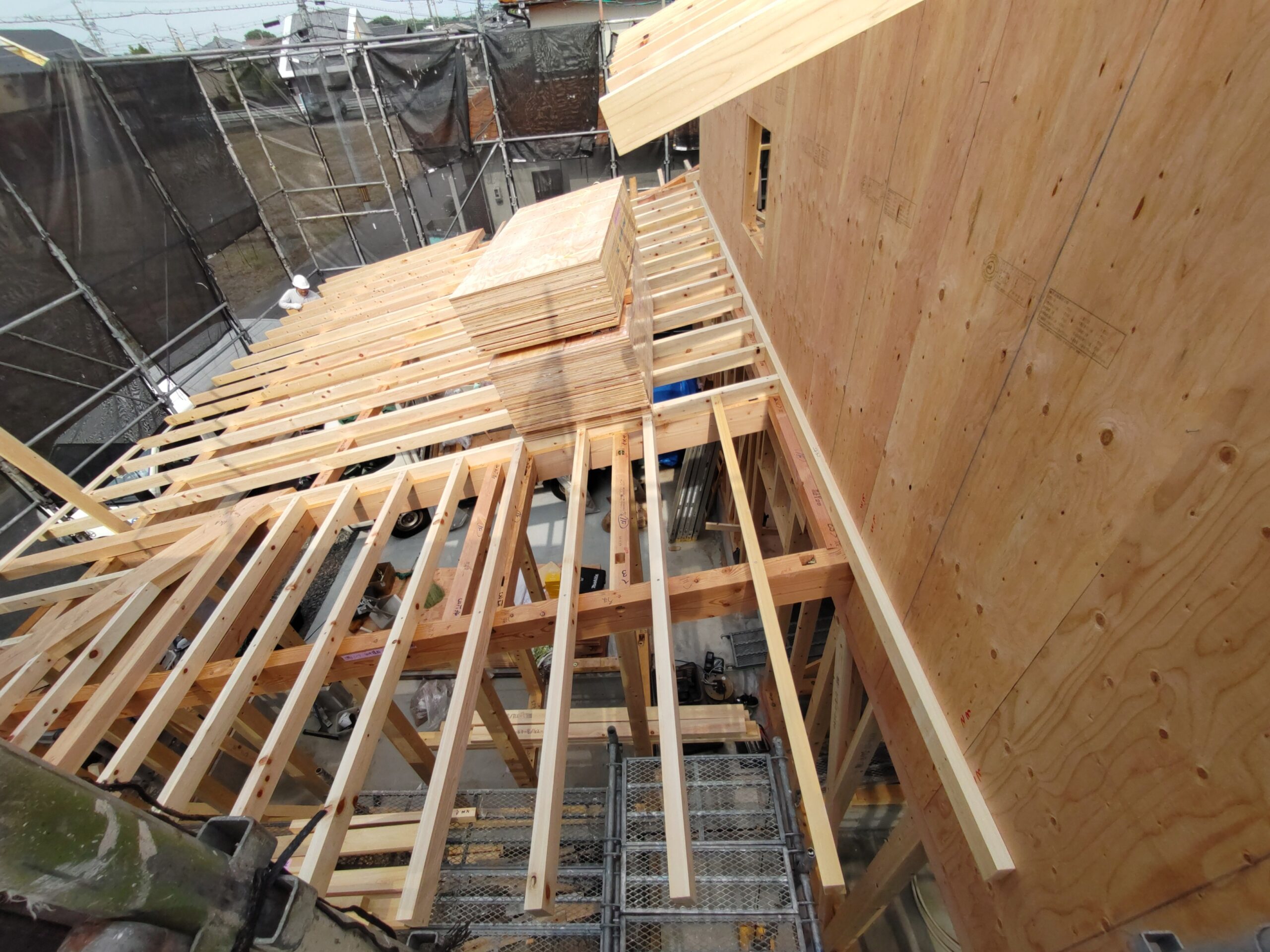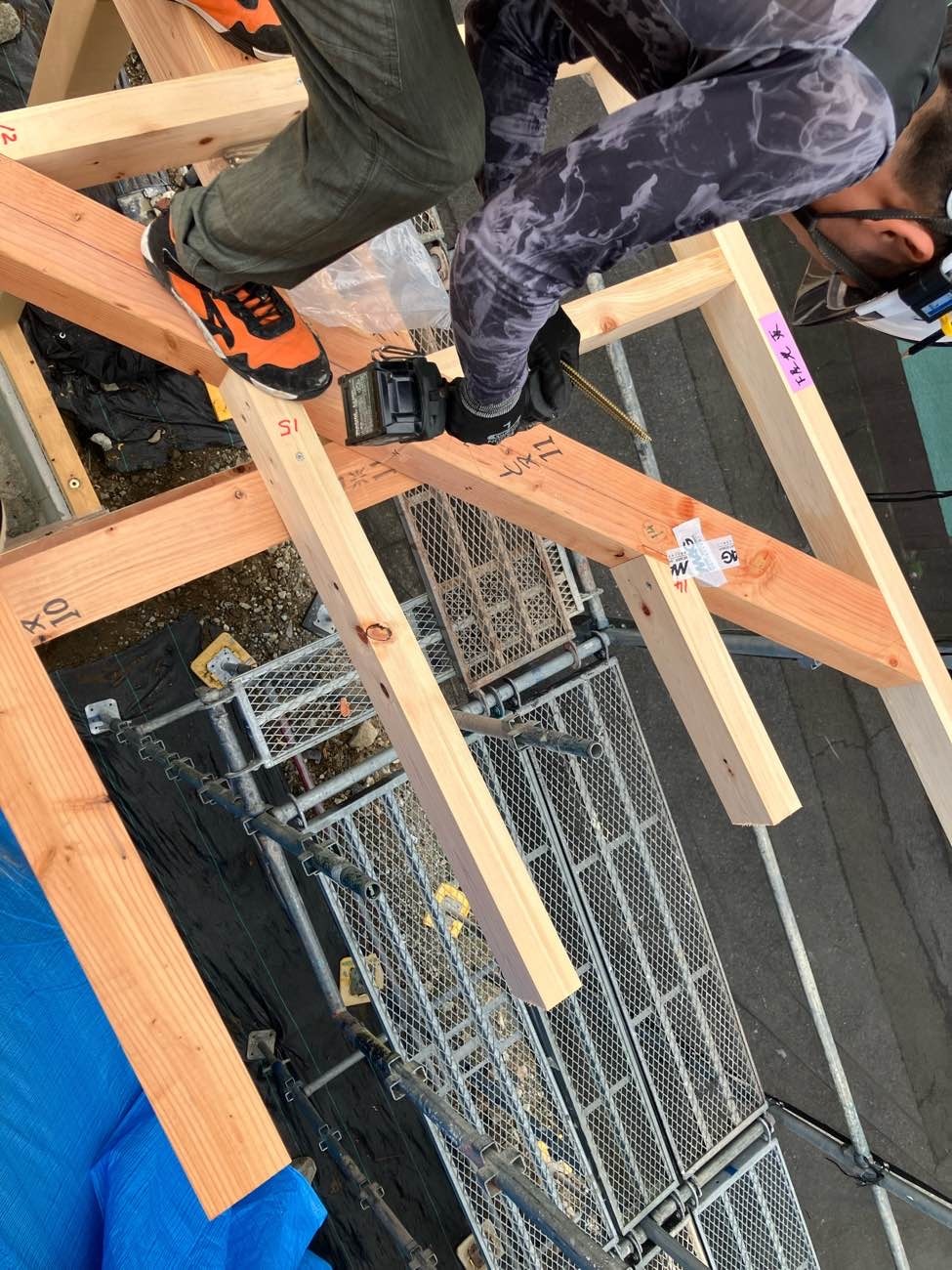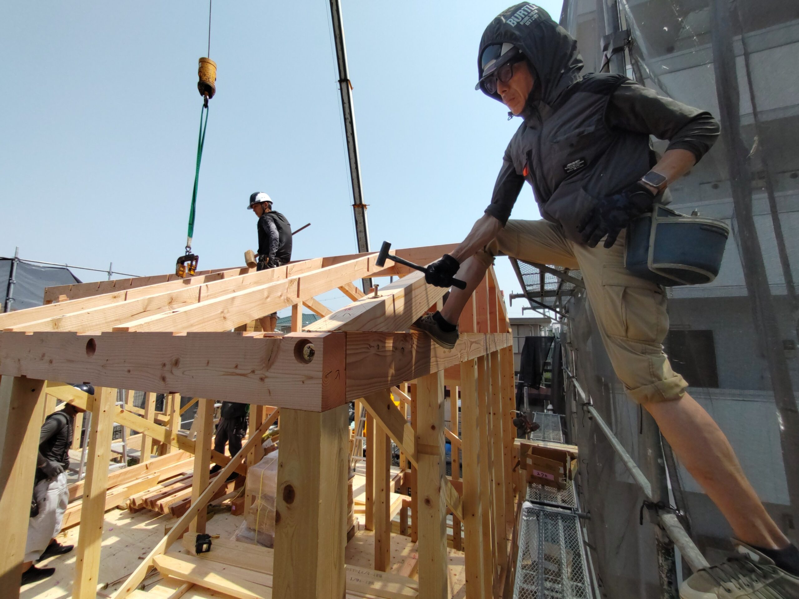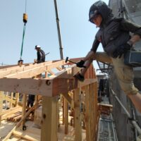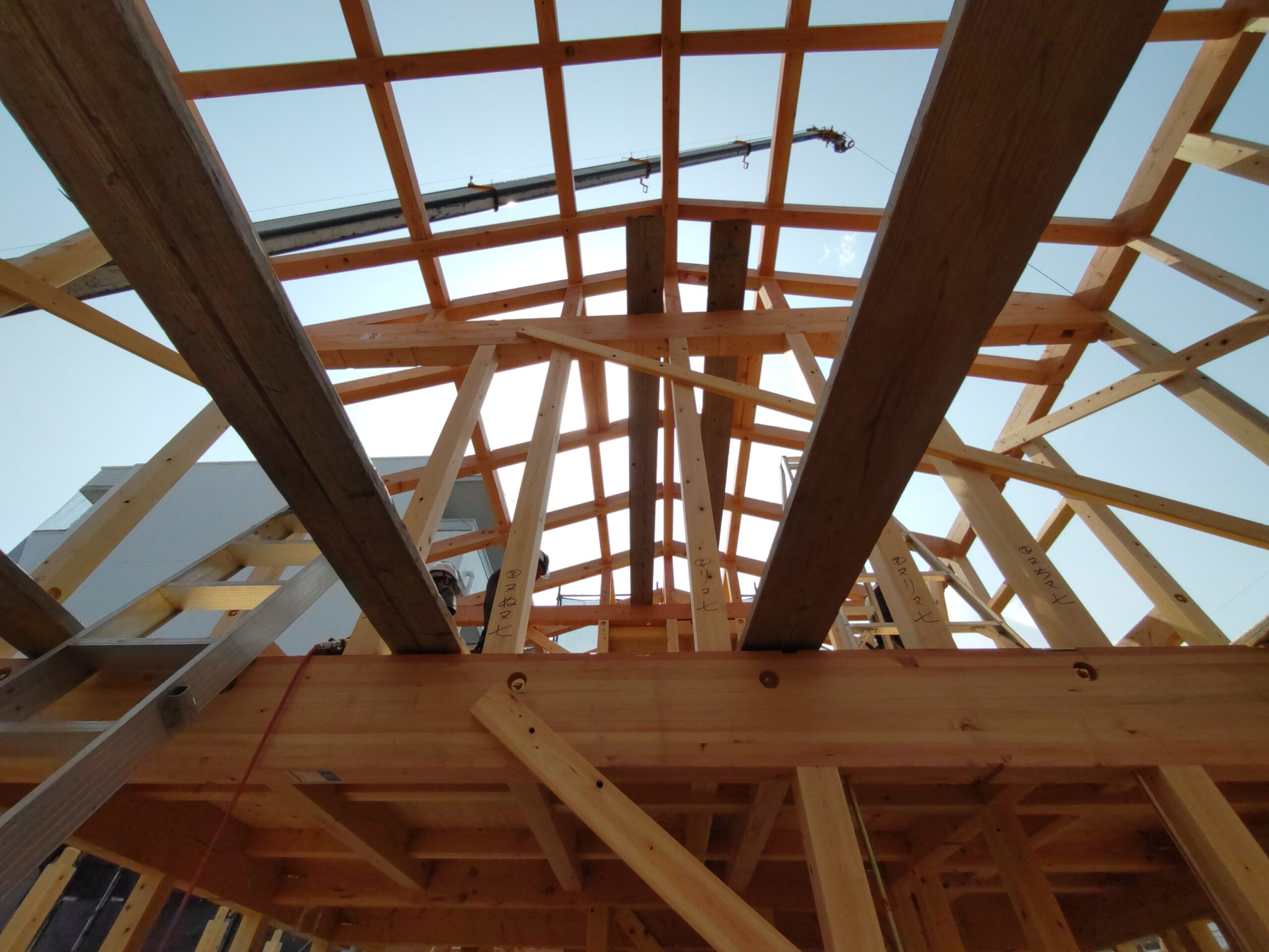 上棟2日目。小屋組みの登梁の上に垂木を組み始めました。母屋を水平方向に飛び出させない代わりに垂木を水平方向へ出す、という事と、構造的に屋根面で水平体力を持たせるため比較的複雑な組み方をしています。