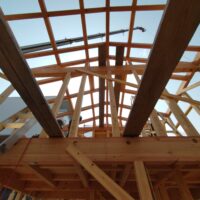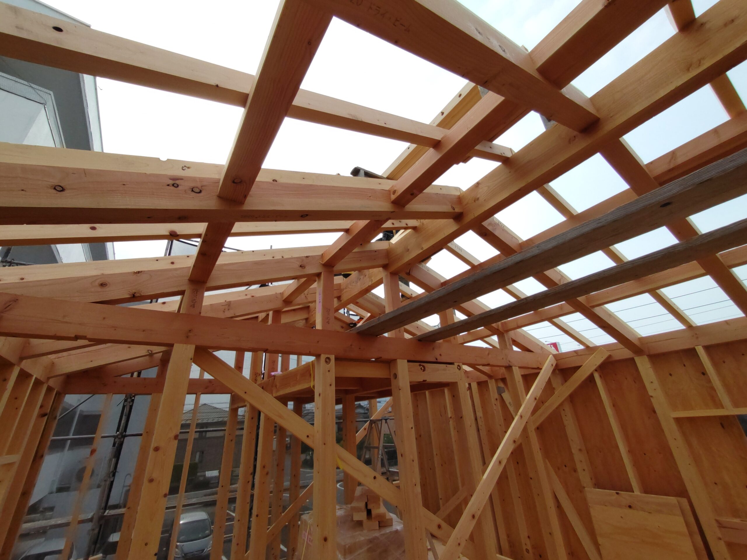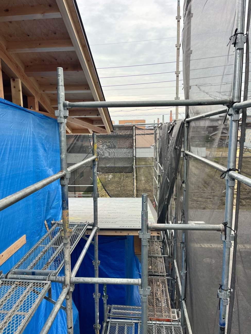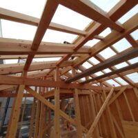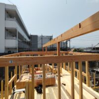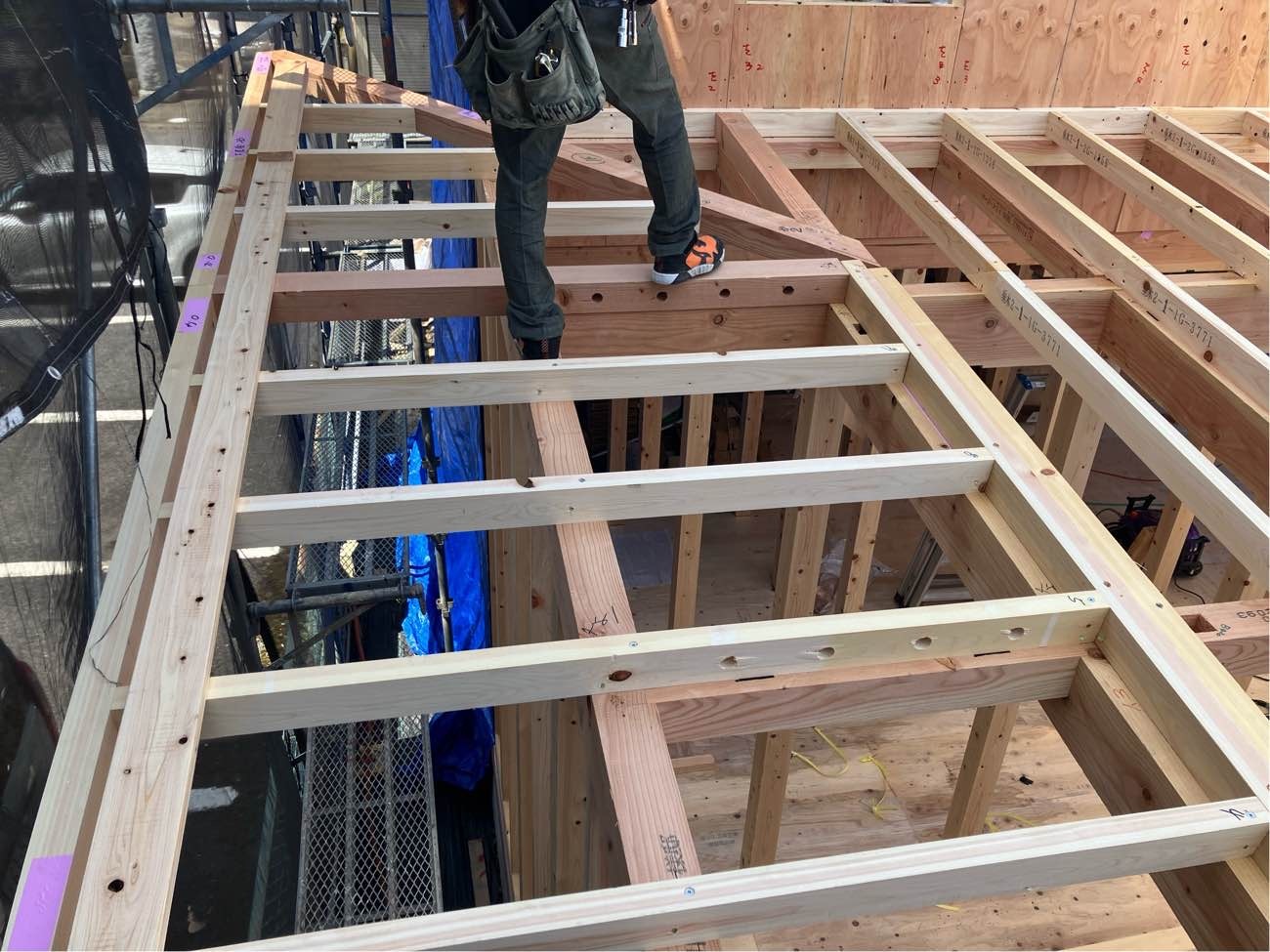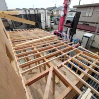 上棟2日目。小屋組みの登梁の上に垂木を組み始めました。母屋を水平方向に飛び出させない代わりに垂木を水平方向へ出す、という事と、構造的に屋根面で水平体力を持たせるため比較的複雑な組み方をしています。