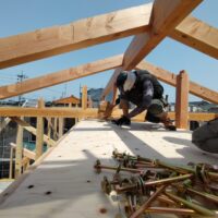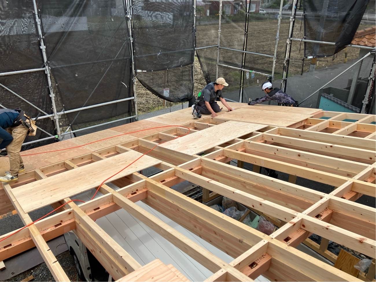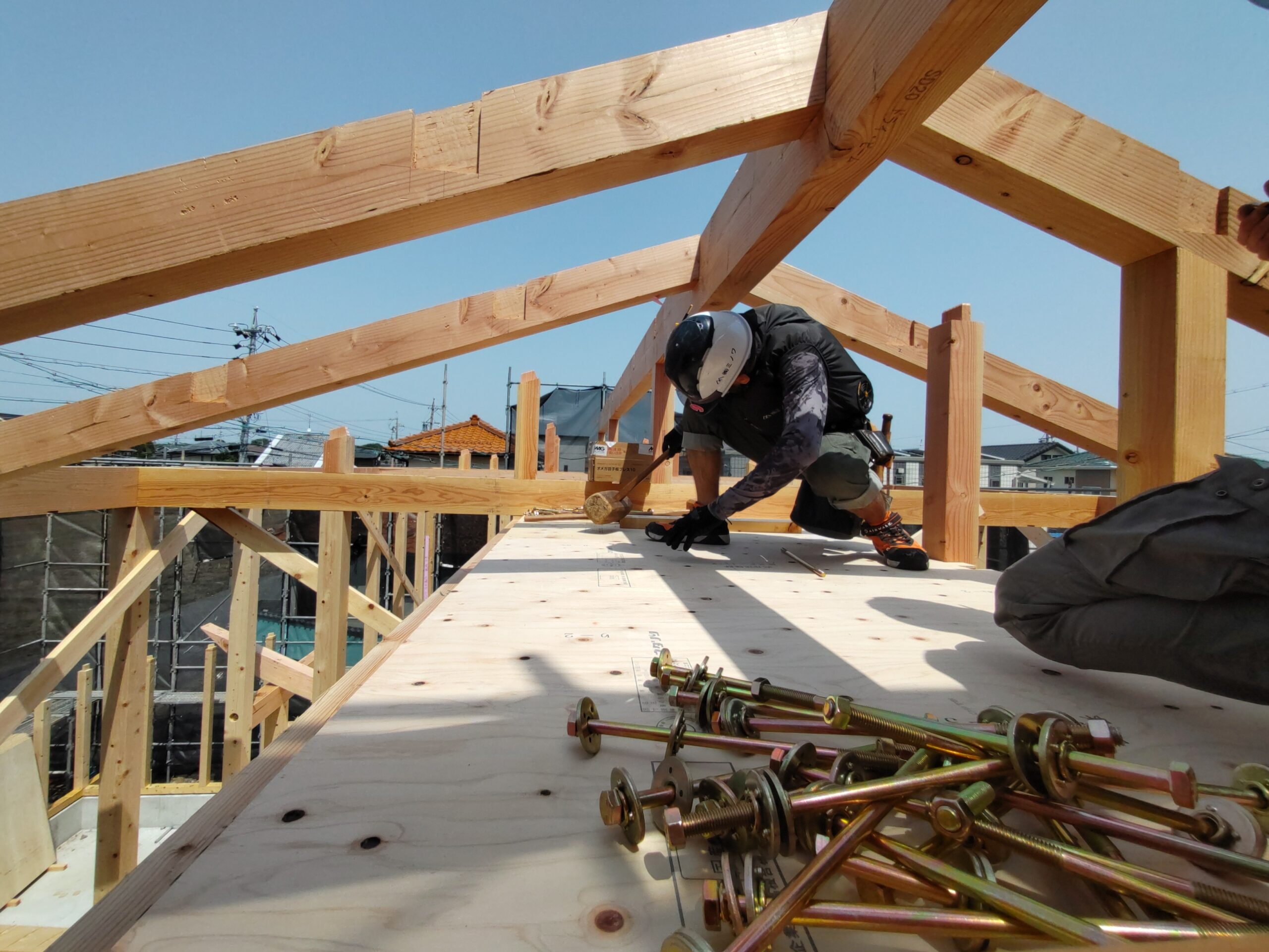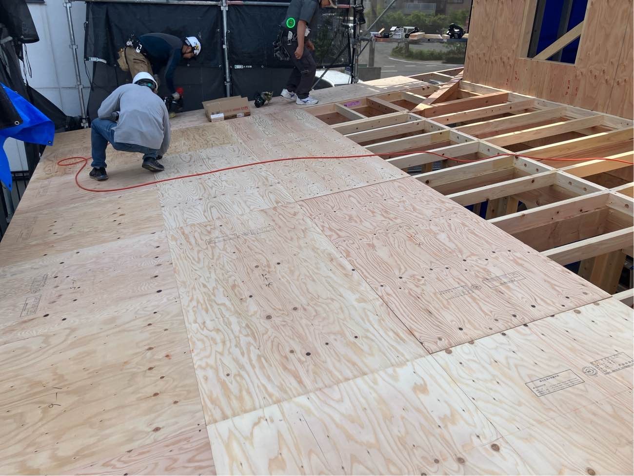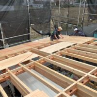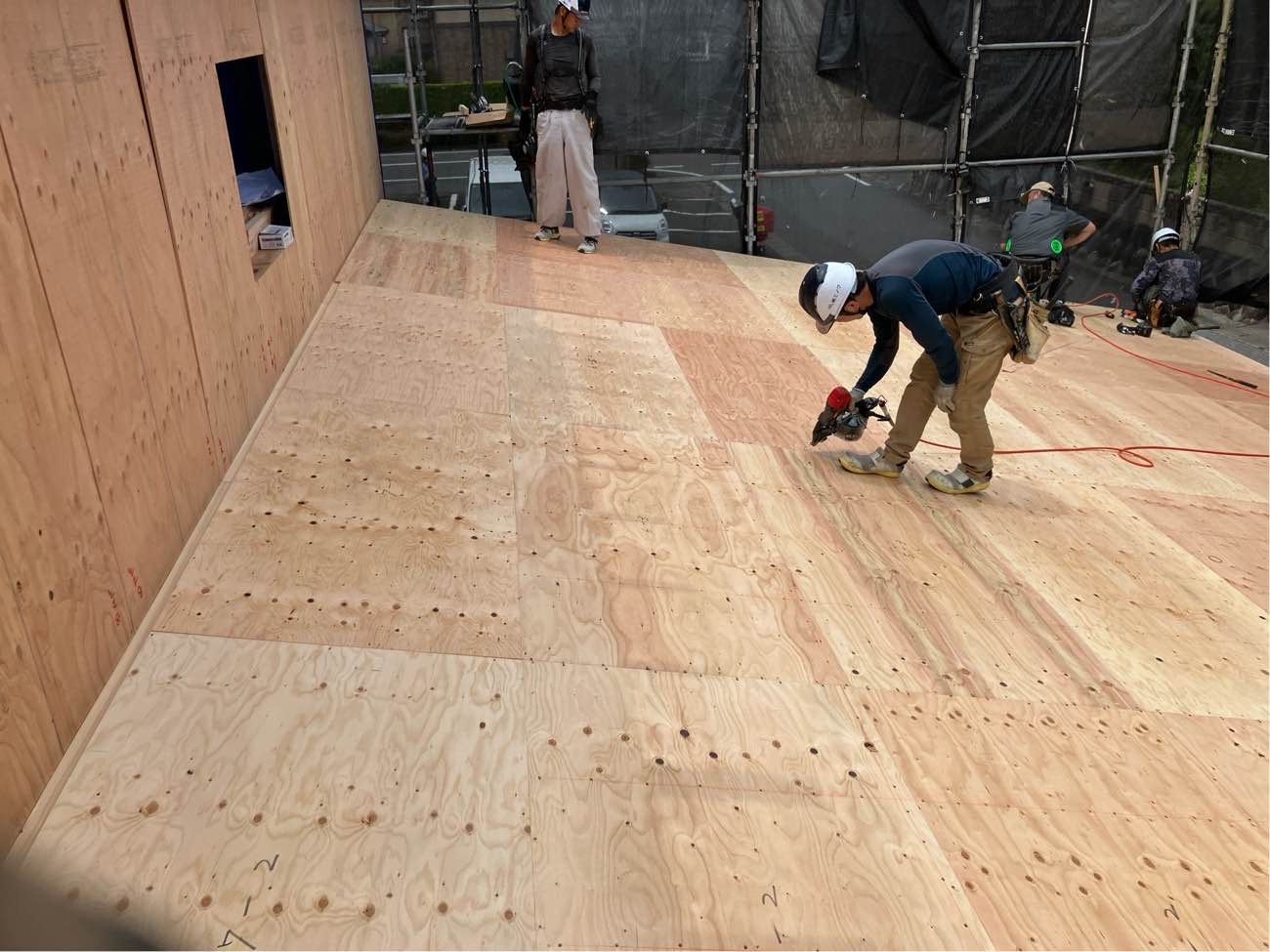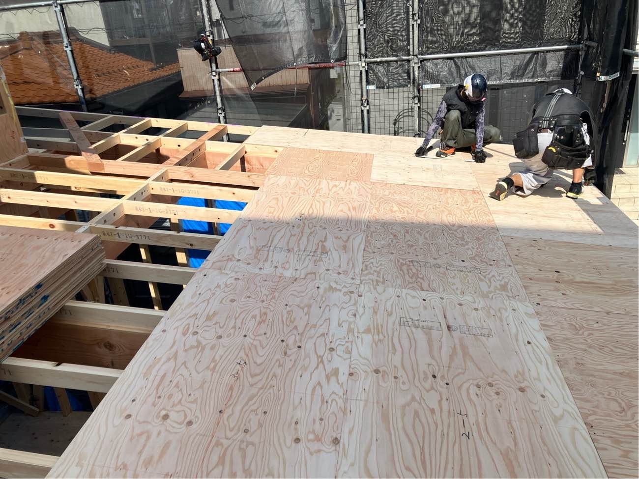 合板を伏せる際も確実に垂木に効かせて屋根構面の強度を確保していきます。
