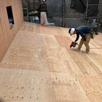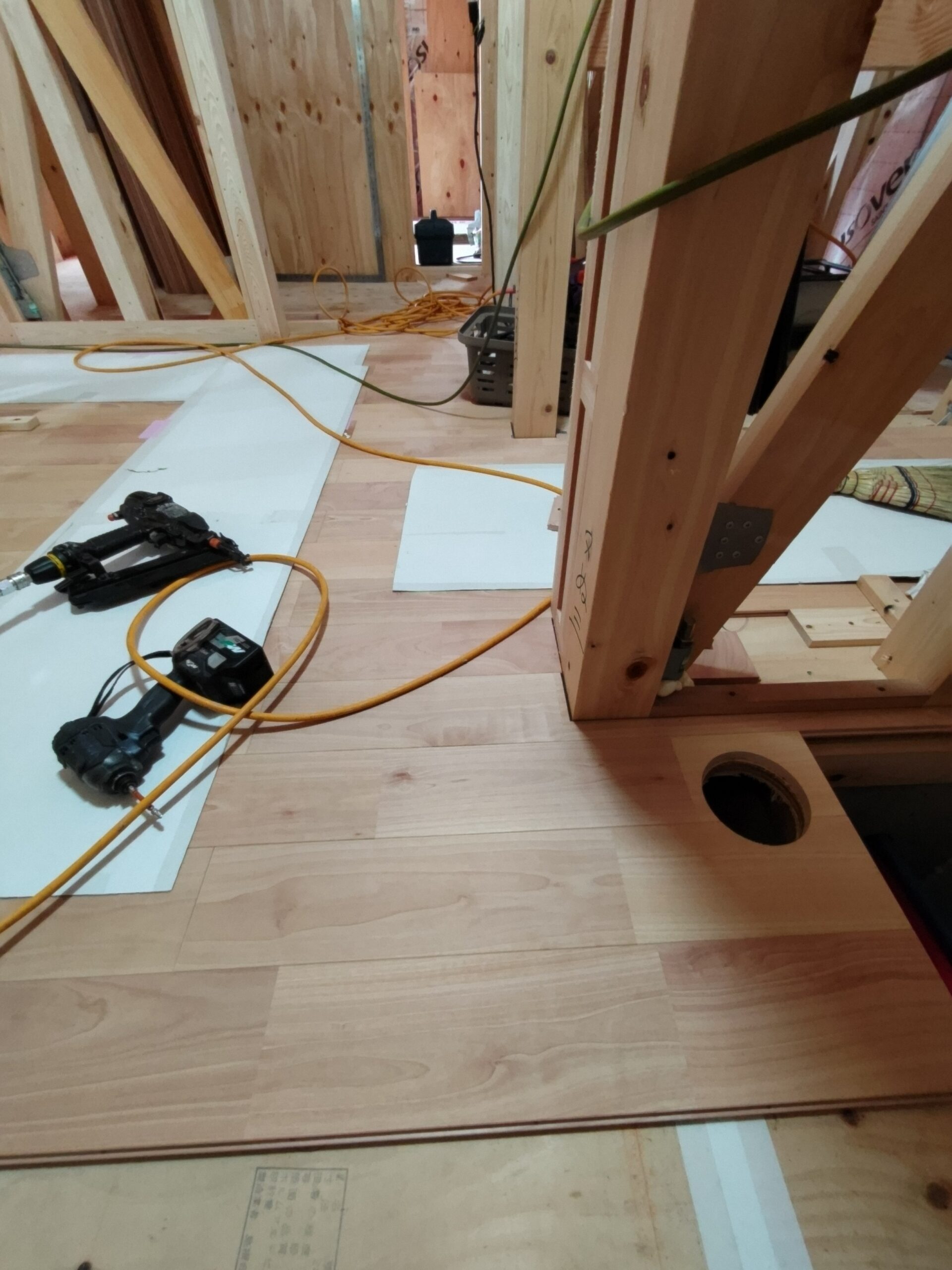 屋内の造作はフローリング張りの段階に入ってきました。使用しているのは西南桜のシルキー塗装品。サラッとした表面の仕上がりが特徴です。