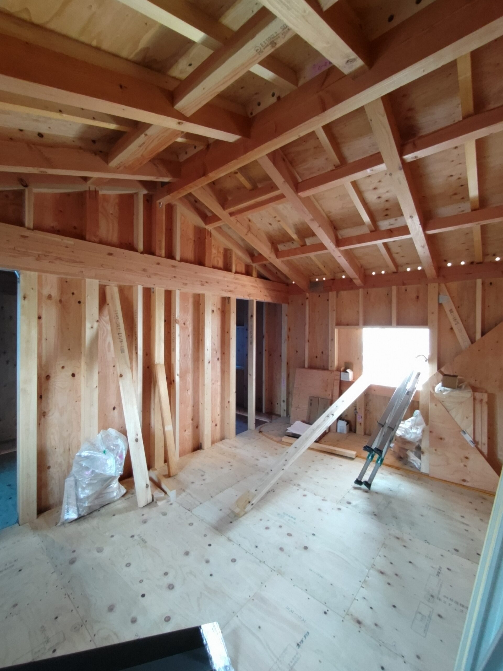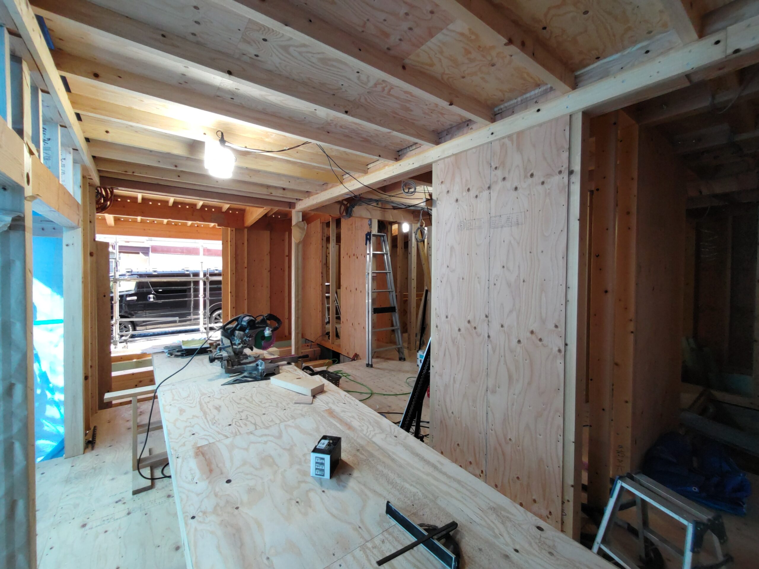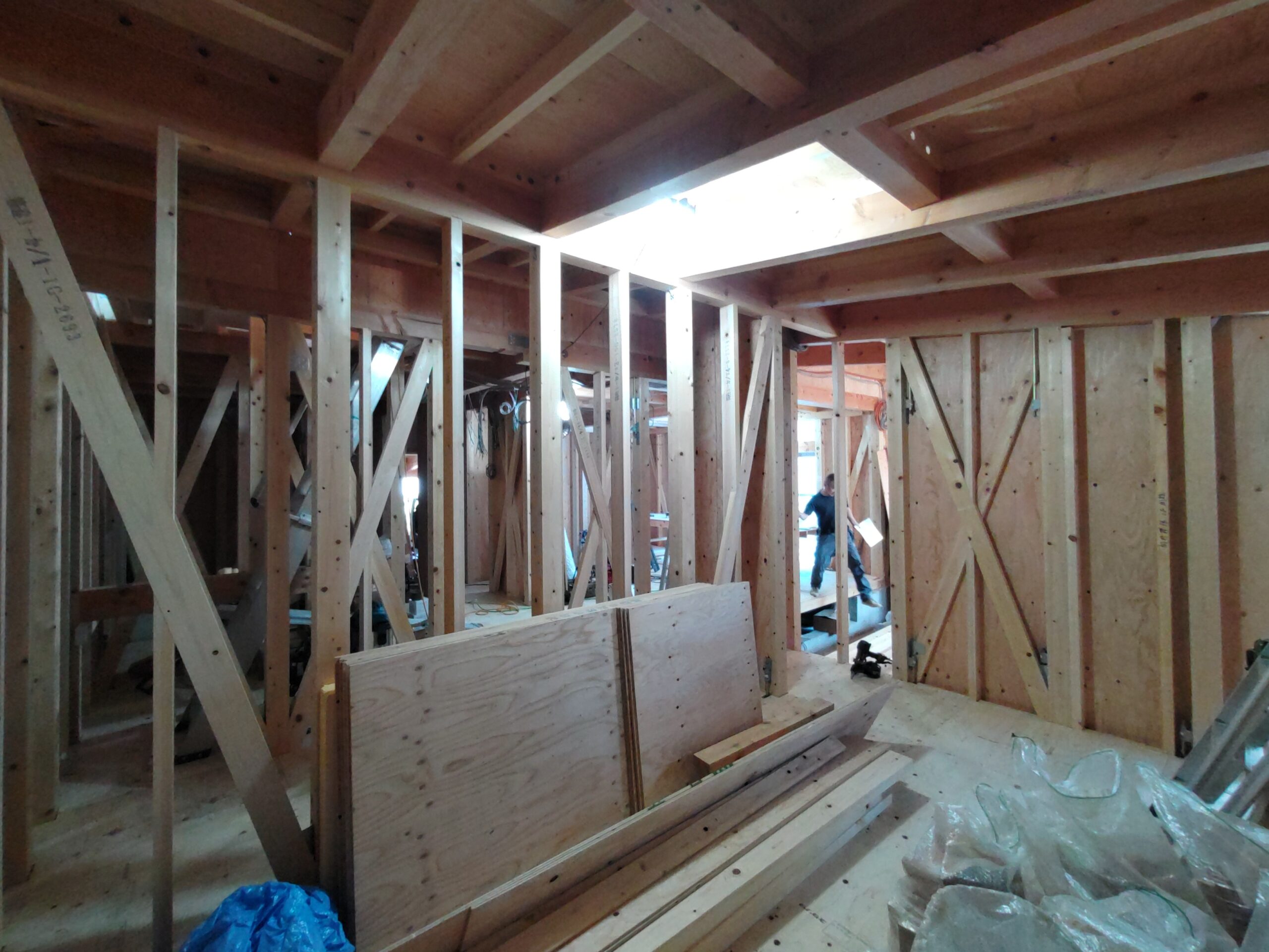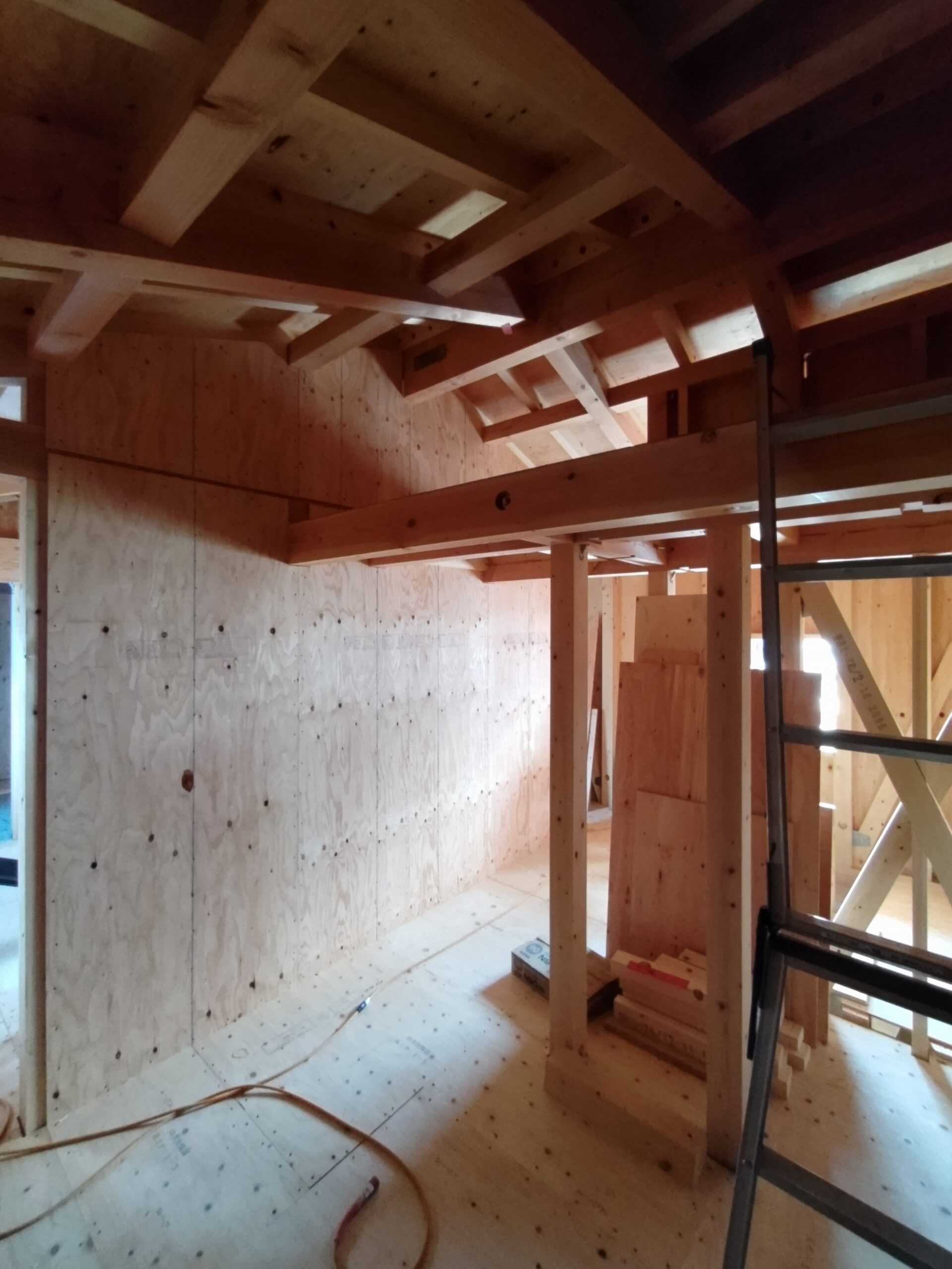 棟梁は外装下地に精を出しているため、内装は構造の検査を受けた直後の状態です。今回は構造計算により、屋内にも耐力壁が散見されています。
