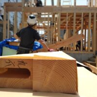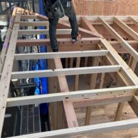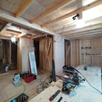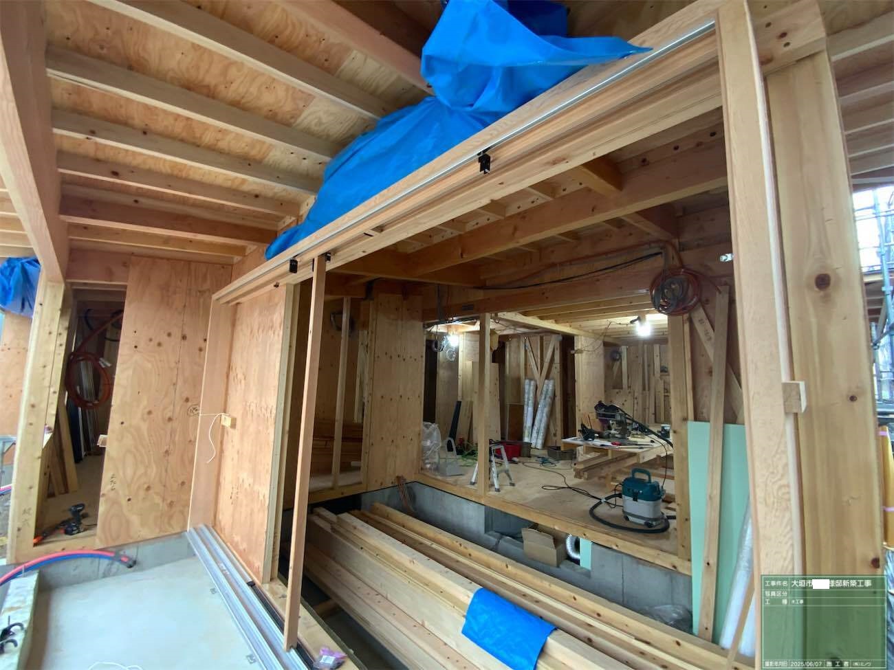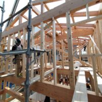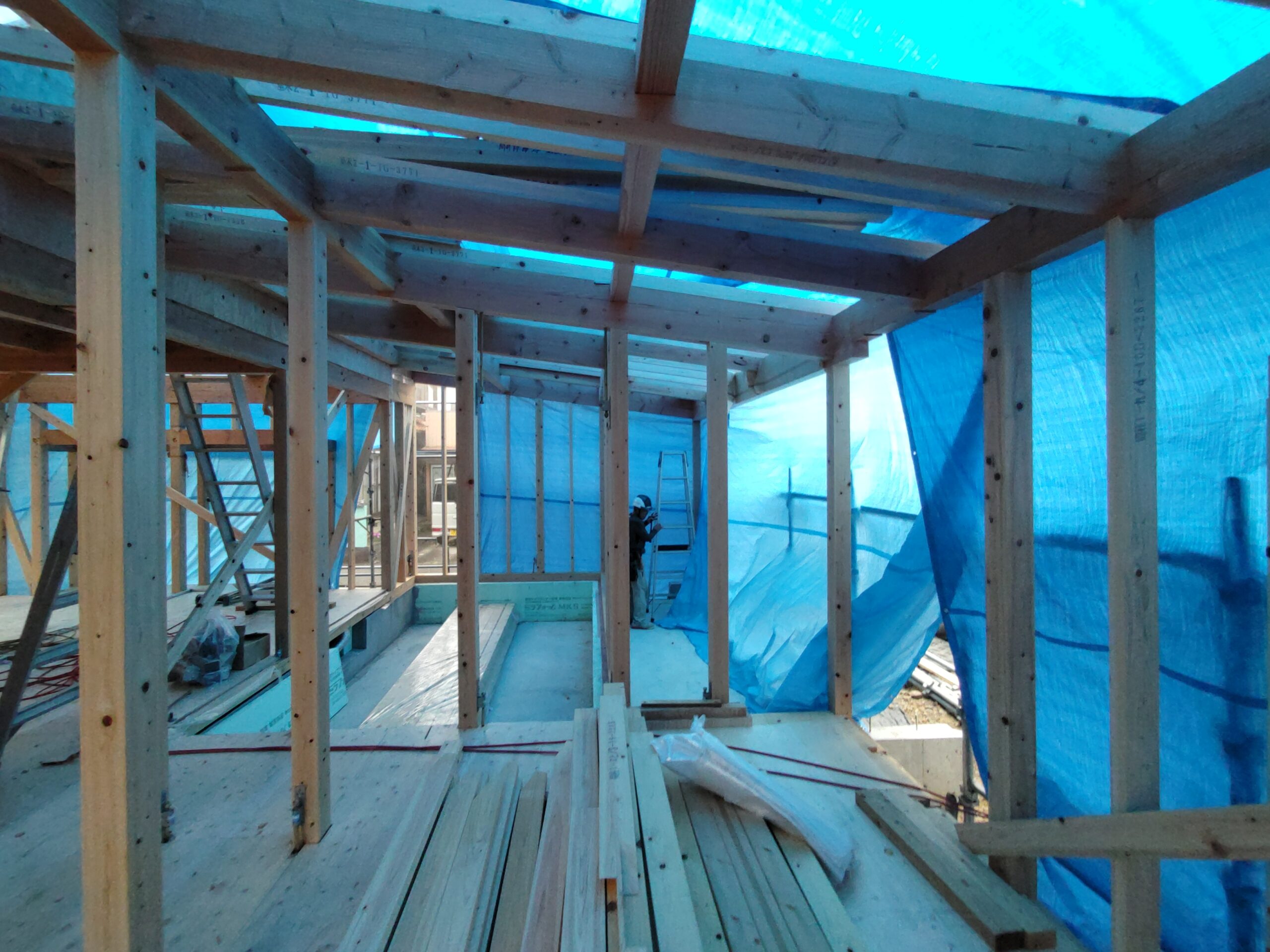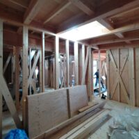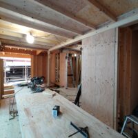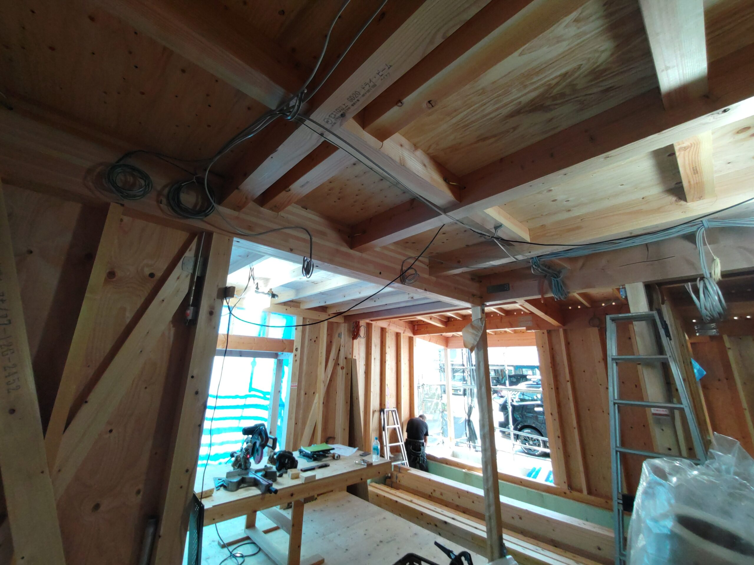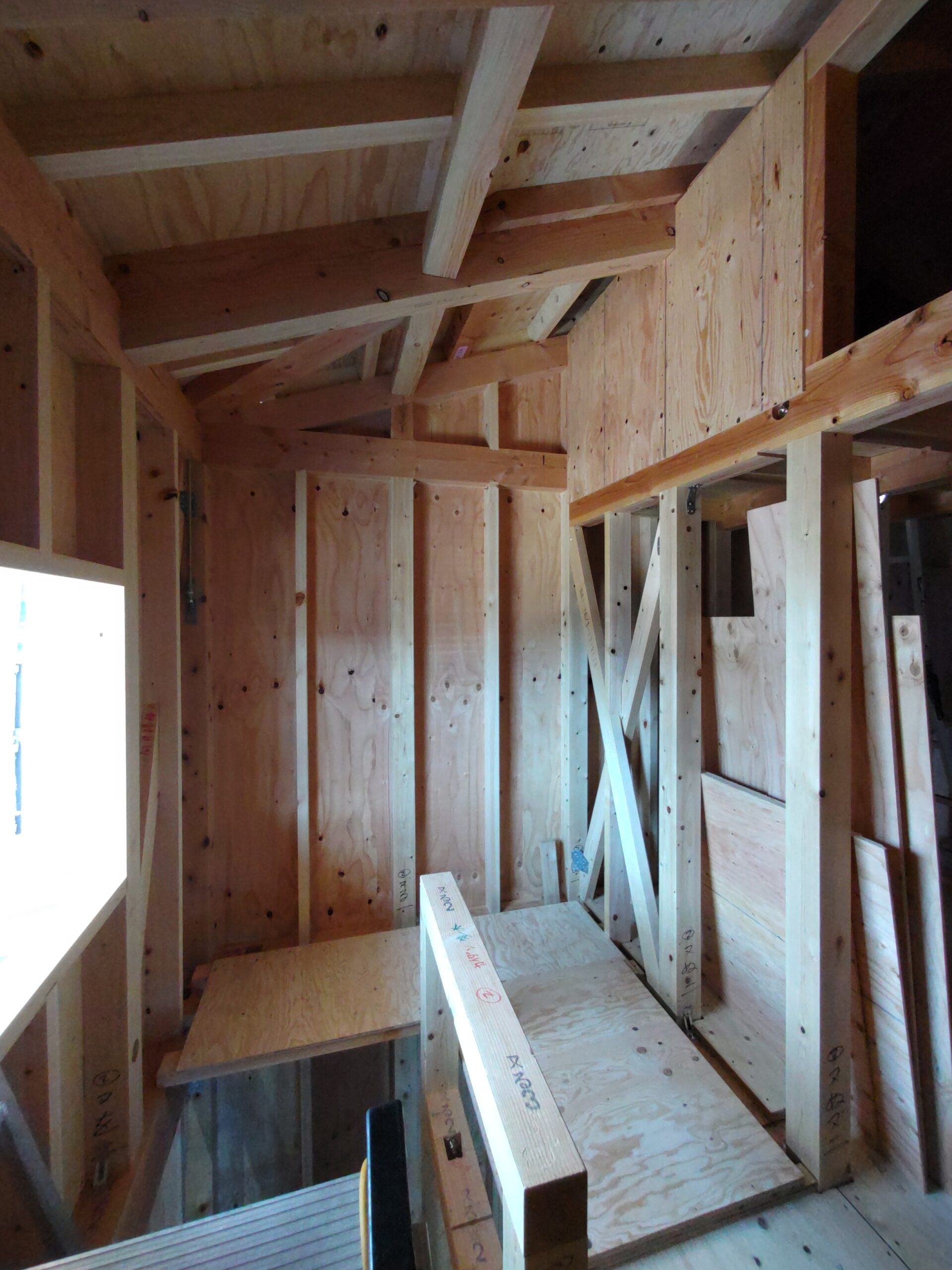 棟梁は外装下地に精を出しているため、内装は構造の検査を受けた直後の状態です。今回は構造計算により、屋内にも耐力壁が散見されています。