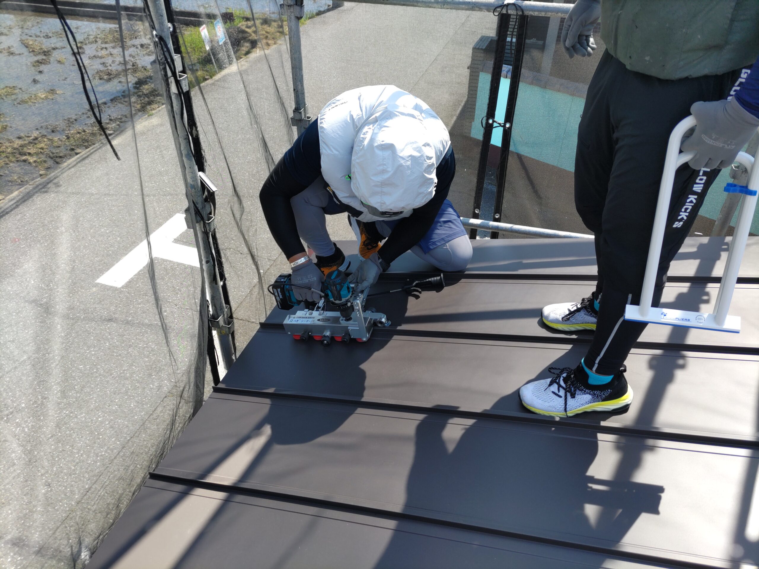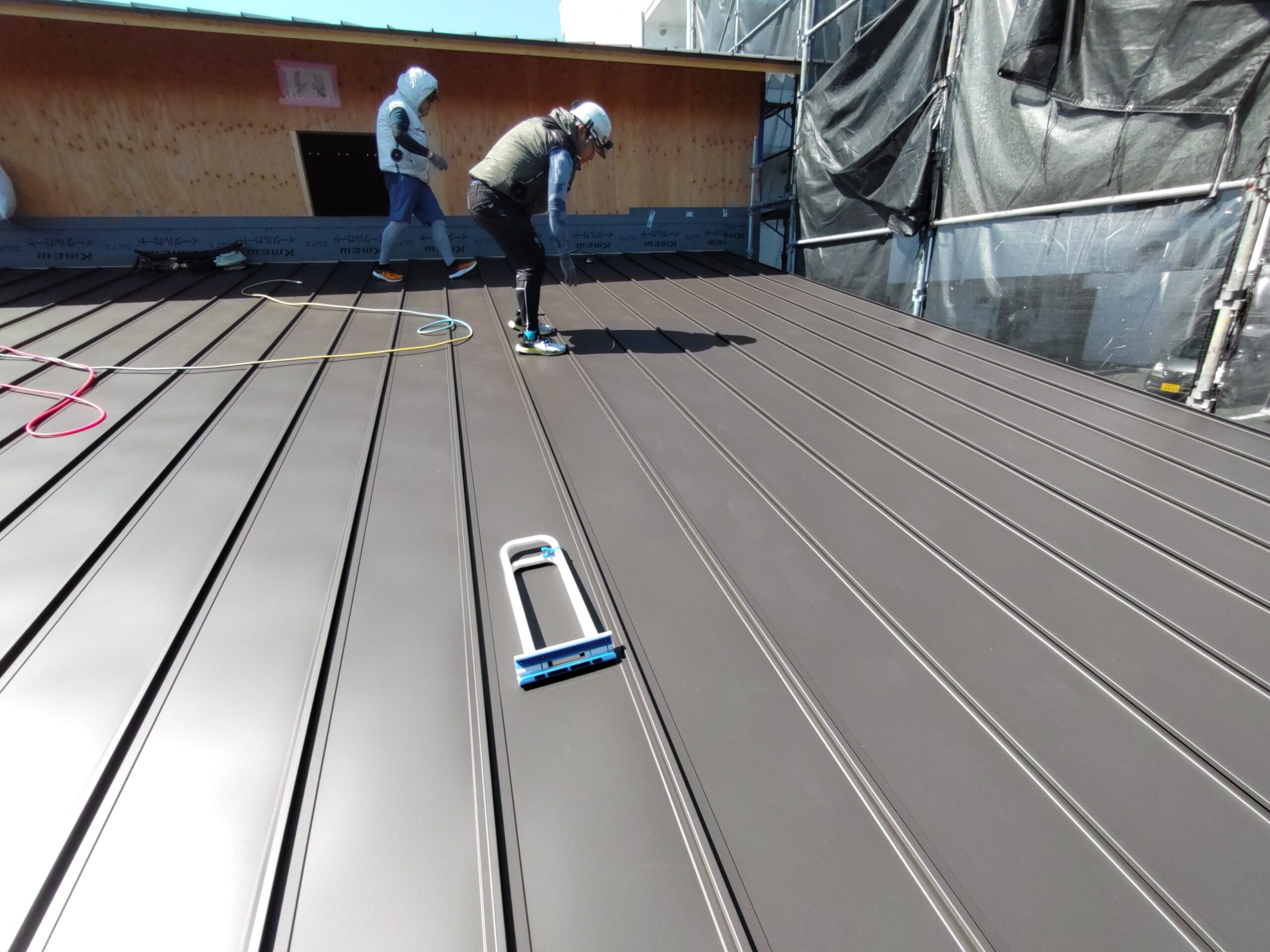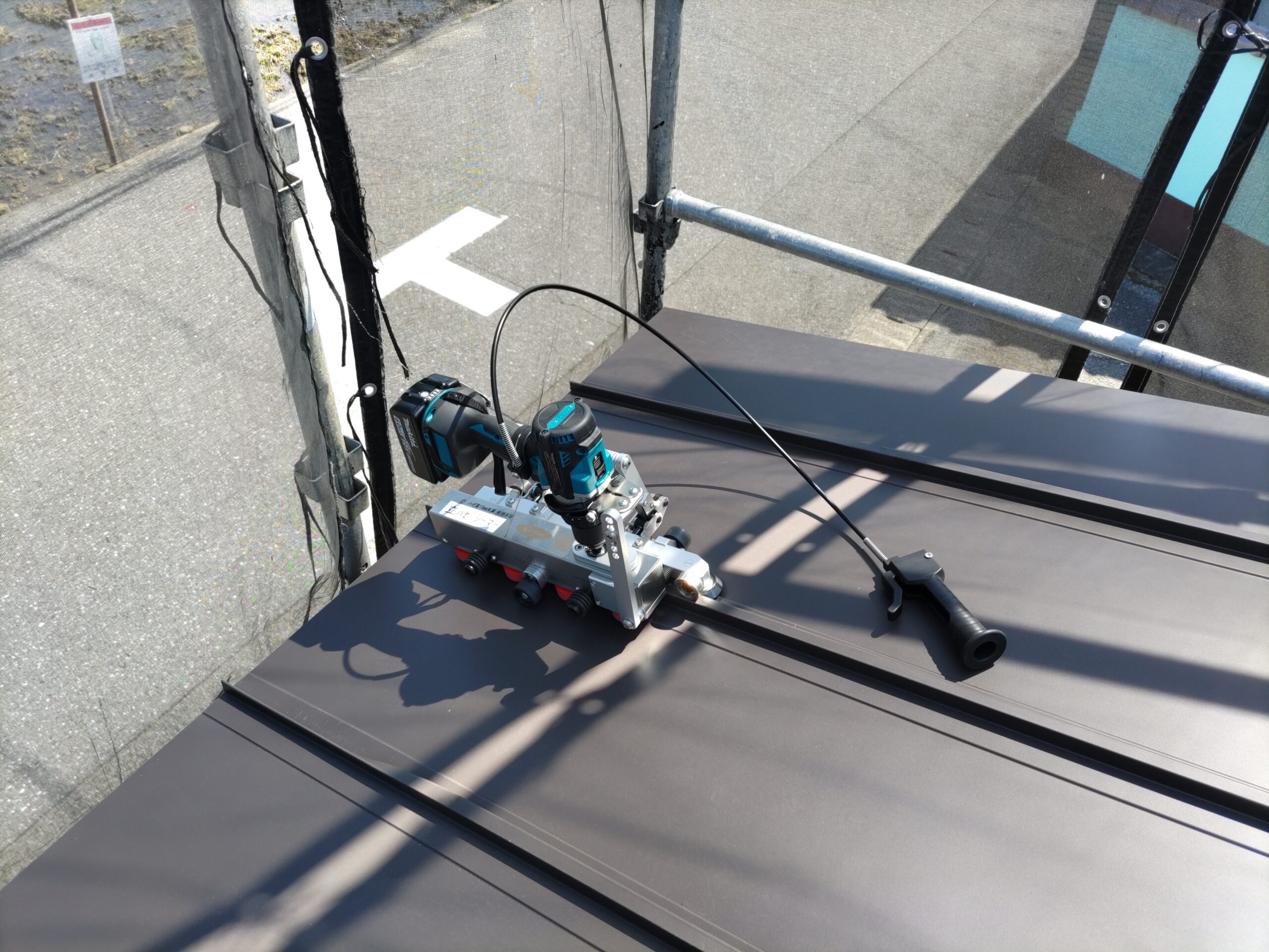 灼熱の鉄板の上で屋根ガルバリウム鋼板葺き工事が行われています。朝夕はまだまだ涼しいものの、もはやこの時期から空調服は必須になってきます。今回は普段ガルバリウム鋼板葺きで使用される『勘合式立平葺き』屋根ではなく『立ハゼ葺き』方式が採用されています。勘合式であればはめ込んでいくだけで作業は終了ですが、立ハゼは並べて置いた後接合部を加締めて行く作業が必要です。写真に写っている道具を使用して順番に加締めて行きますが、一度にできるのは道具の幅のみ。